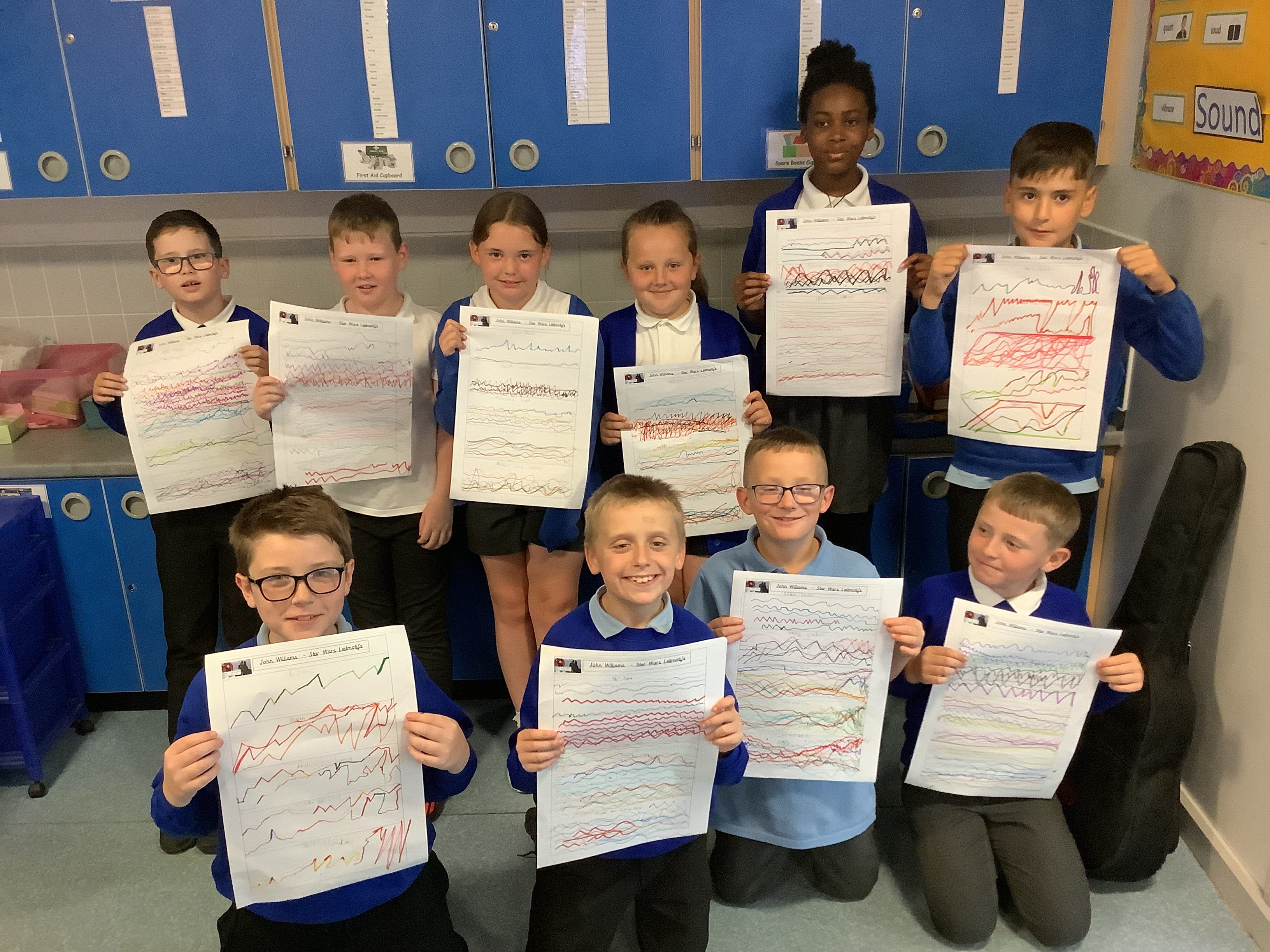 Year 4 learned about the modern day composer John Williams. He is not only a famous composer but a conductor and pianist too. Did you know he has been composing for over 70 years? We discovered that he has composed many movie scores over the years – many of which we recognised. He works in ‘leitmotifs’ which means themes. He assigns a musical score to different characters in movies, he sets the scene using music to create mystery, suspense, magic, love etc. We explored many pieces of his music, we listened and appraised, created emotion art focussing on his leitmotifs for Star Wars characters and discussed how the music changed and why. We then composed a musical rap assigning a leitmotif to the character names we used. Some of us also created a double page spread about him in Literacy. Here is some of the work we produced: