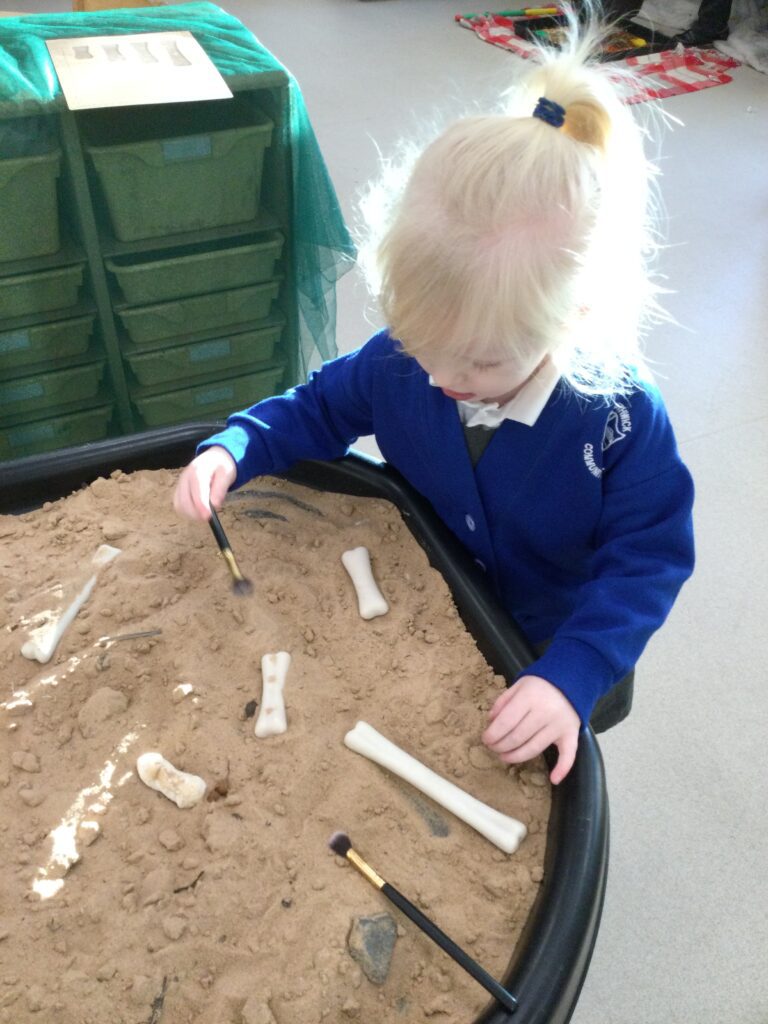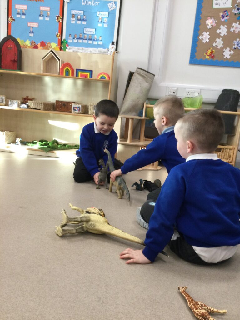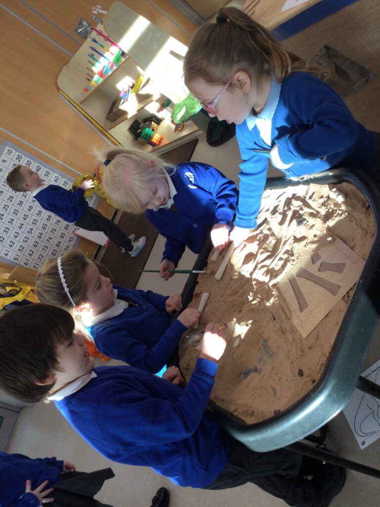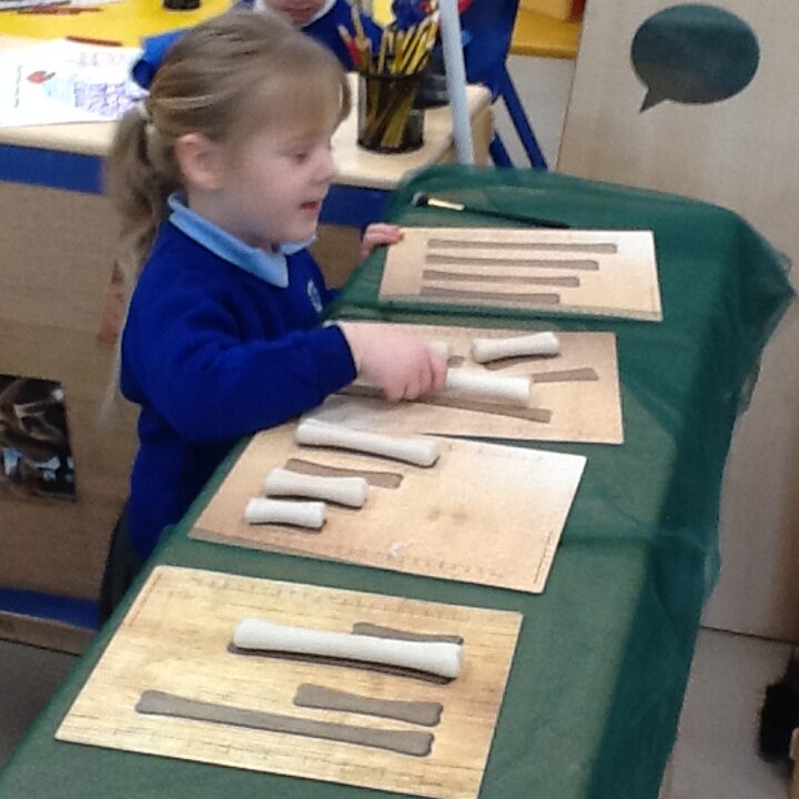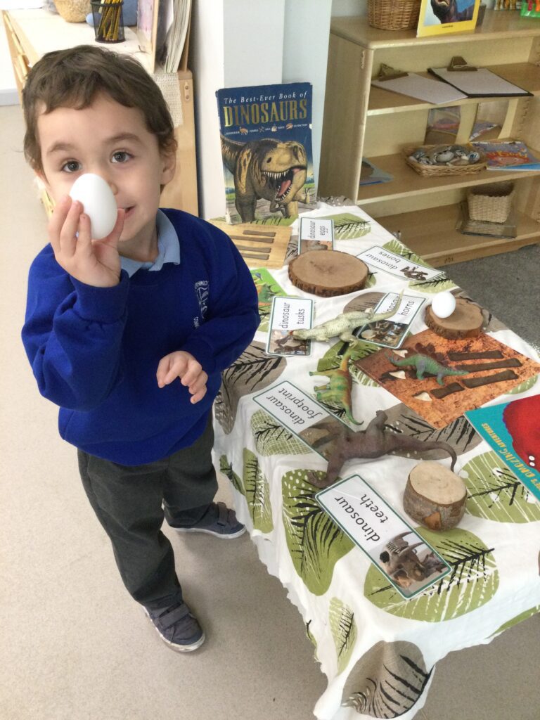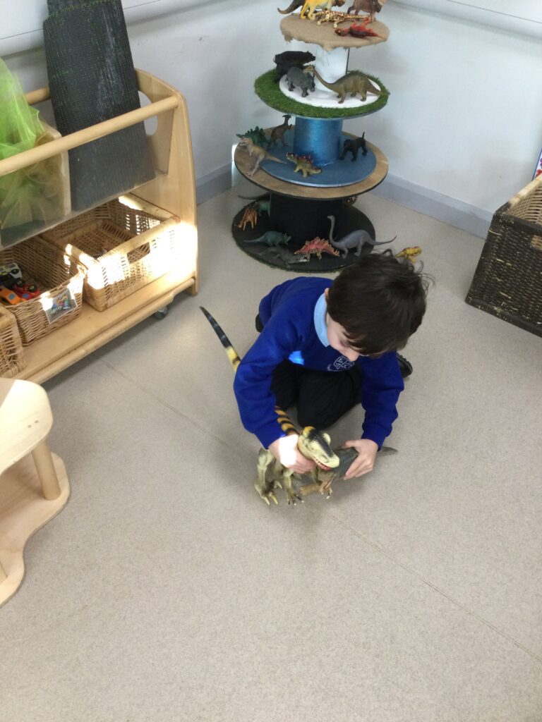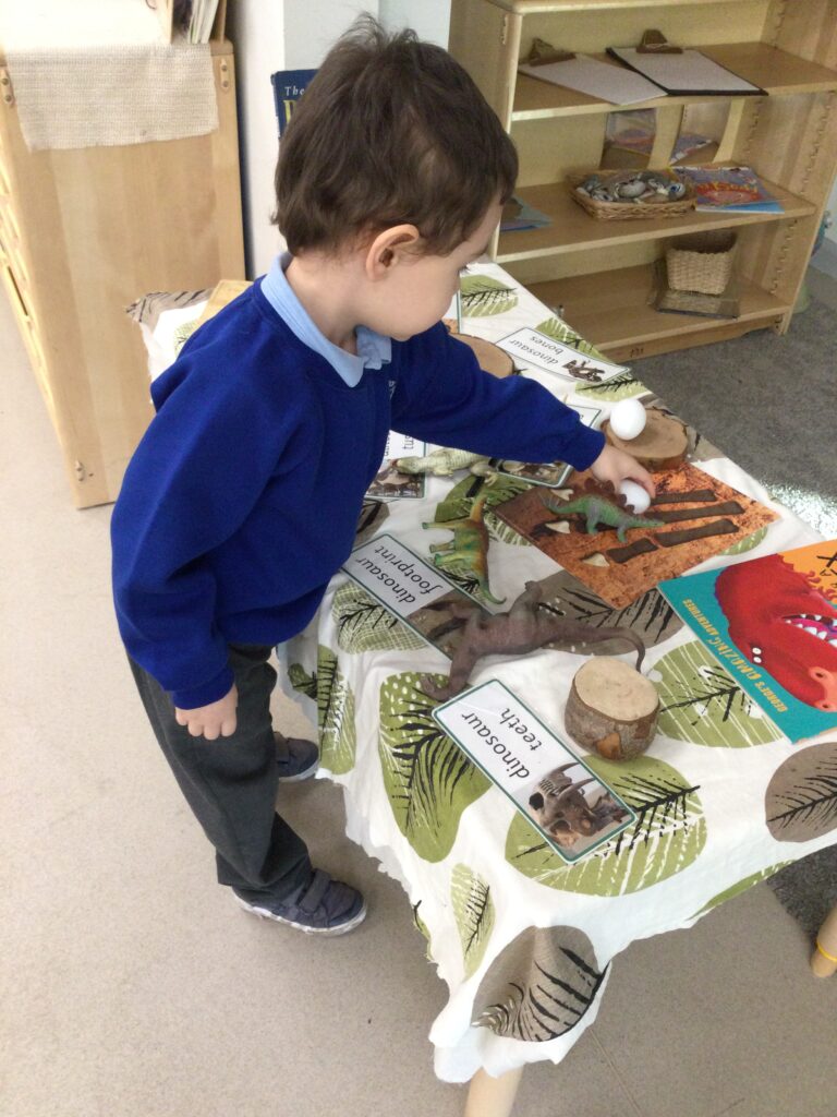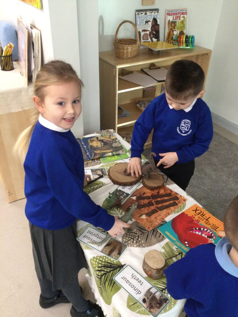 In Reception we have been learning about Dinosaurs. We have been learning about the different kind of dinosaurs that existed and researching which dinosaurs were Carnivores and which were Herbivores. We have been exploring and searching for dinosaur fossils, using the playdough to make our own dinosaurs and working on our counting skills and number recognition in the maths area. We have been playing with the dinosaurs in the small world area and exploring artifacts in the understanding the world area.