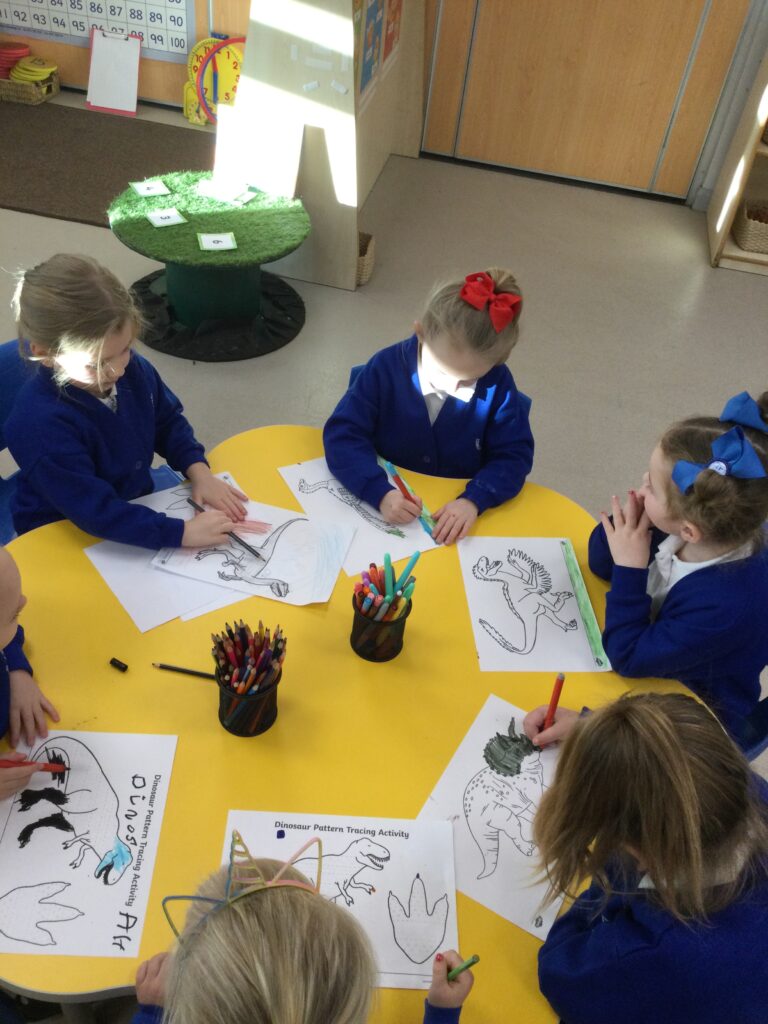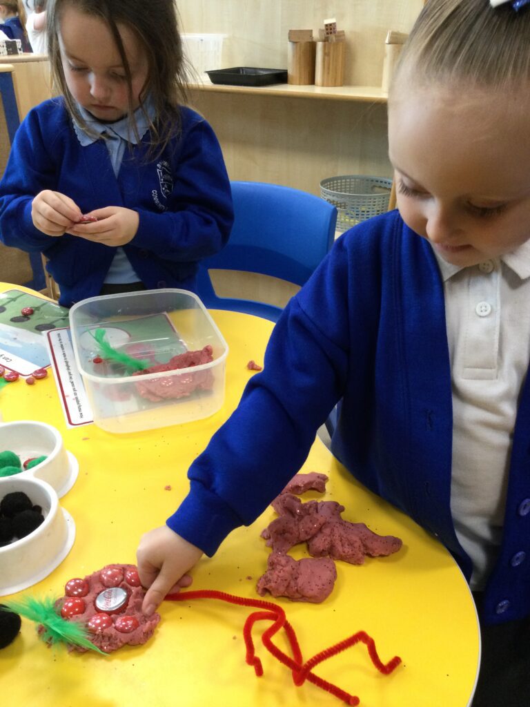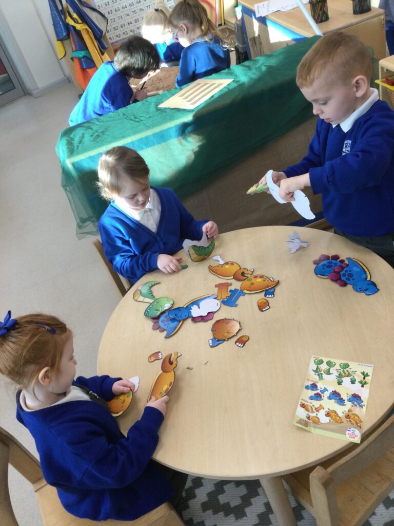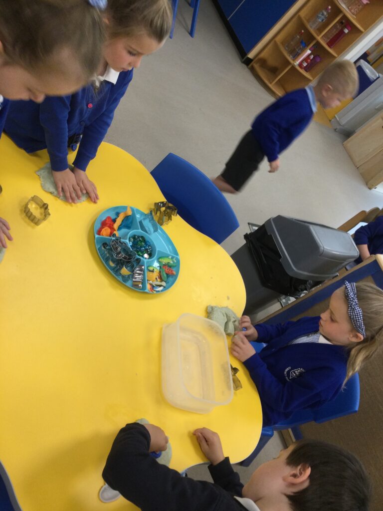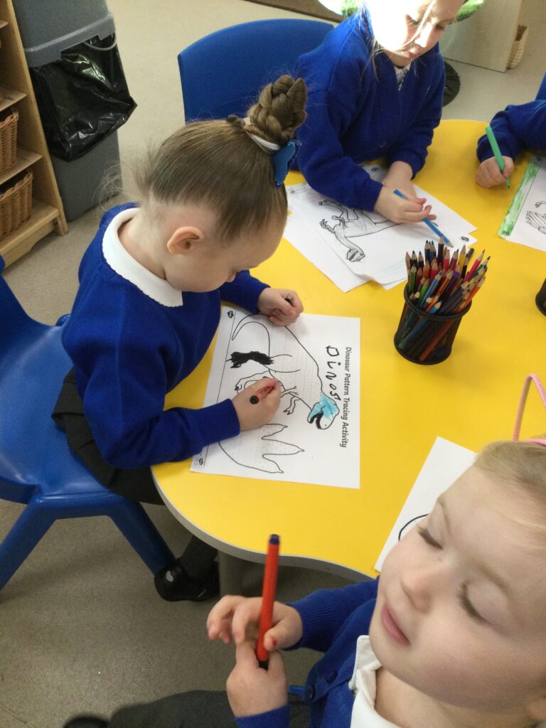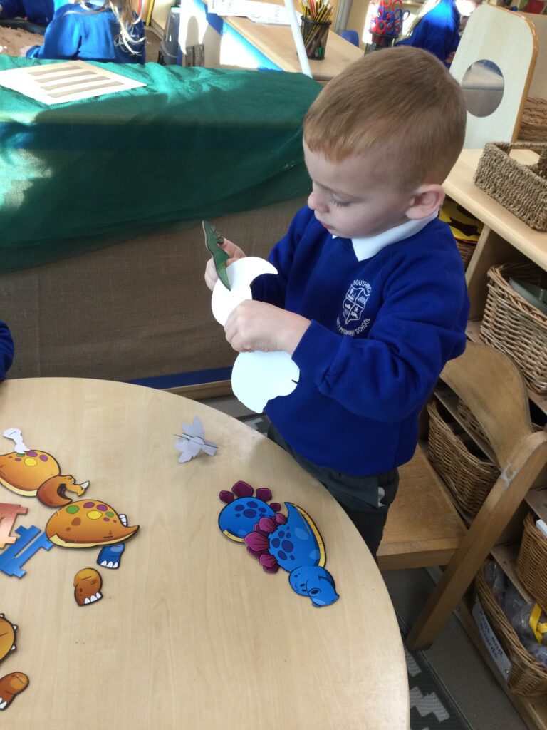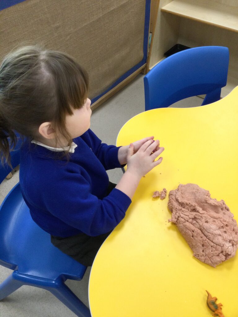 In Reception we have been learning about Dinosaurs. We have been learning about the different kind of dinosaurs that existed and researching which dinosaurs were Carnivores and which were Herbivores. We have been exploring and searching for dinosaur fossils, using the playdough to make our own dinosaurs and working on our counting skills and number recognition in the maths area. We have been playing with the dinosaurs in the small world area and exploring artifacts in the understanding the world area.