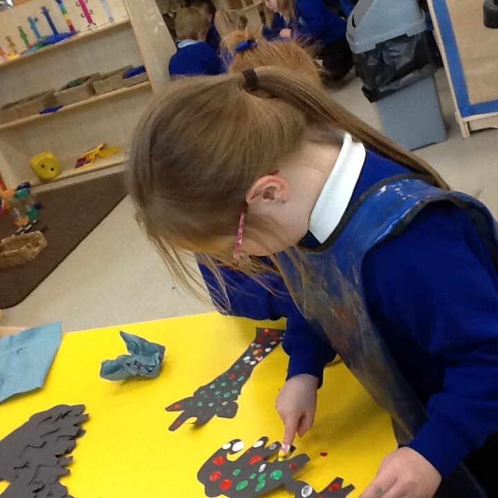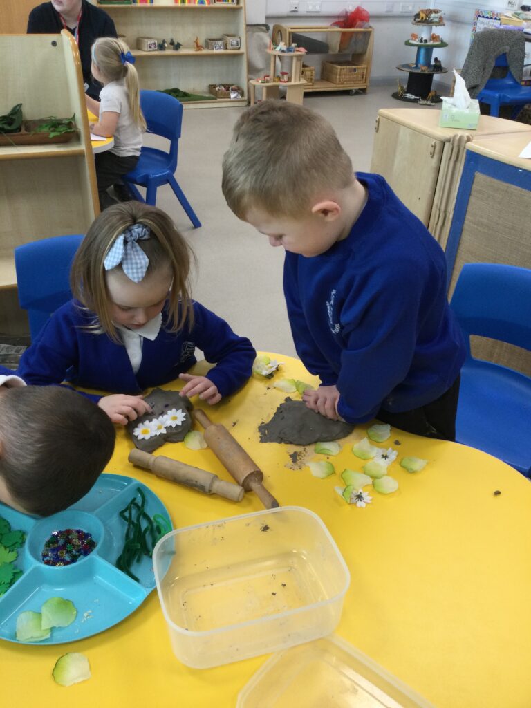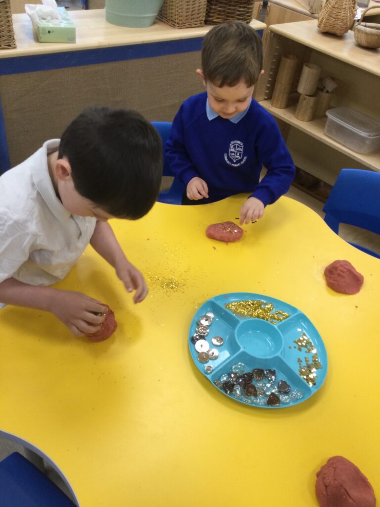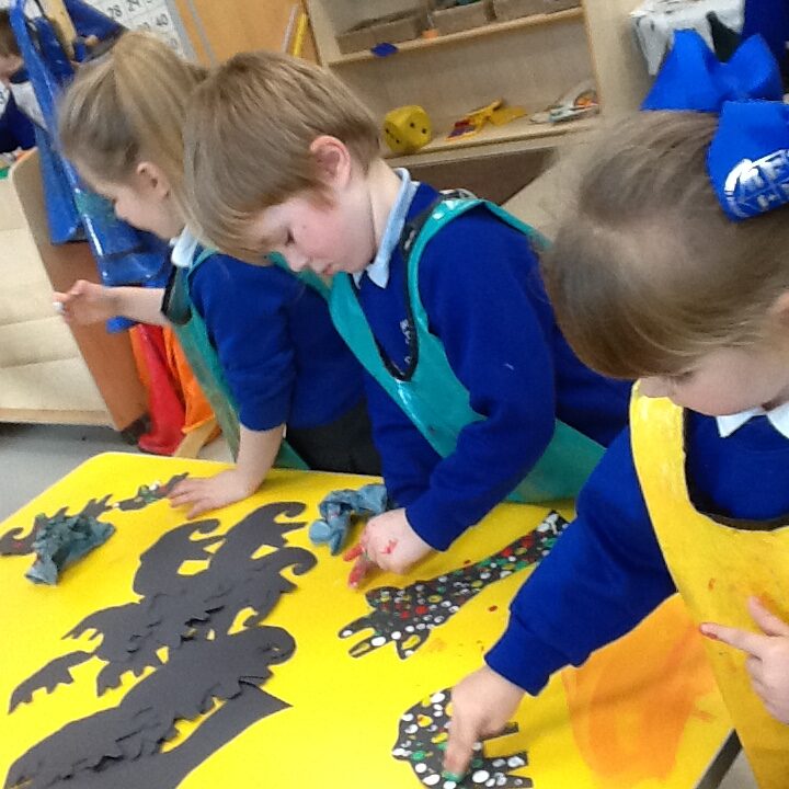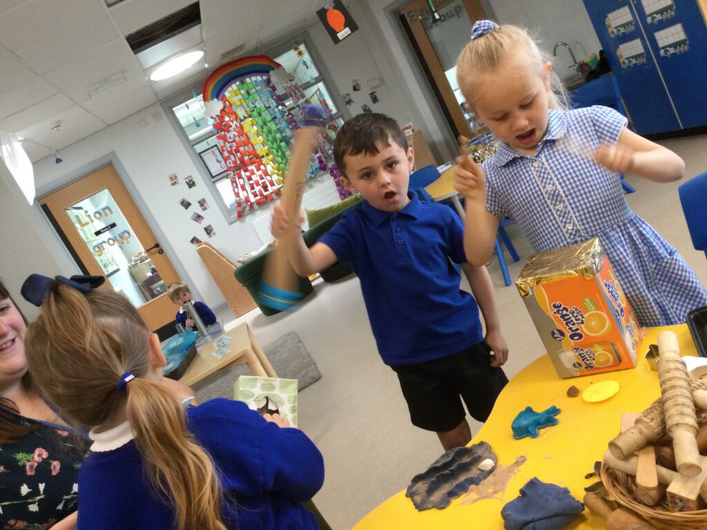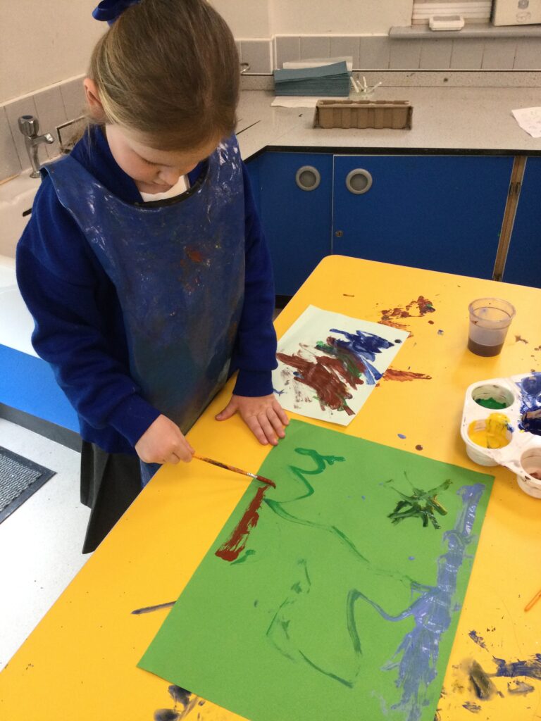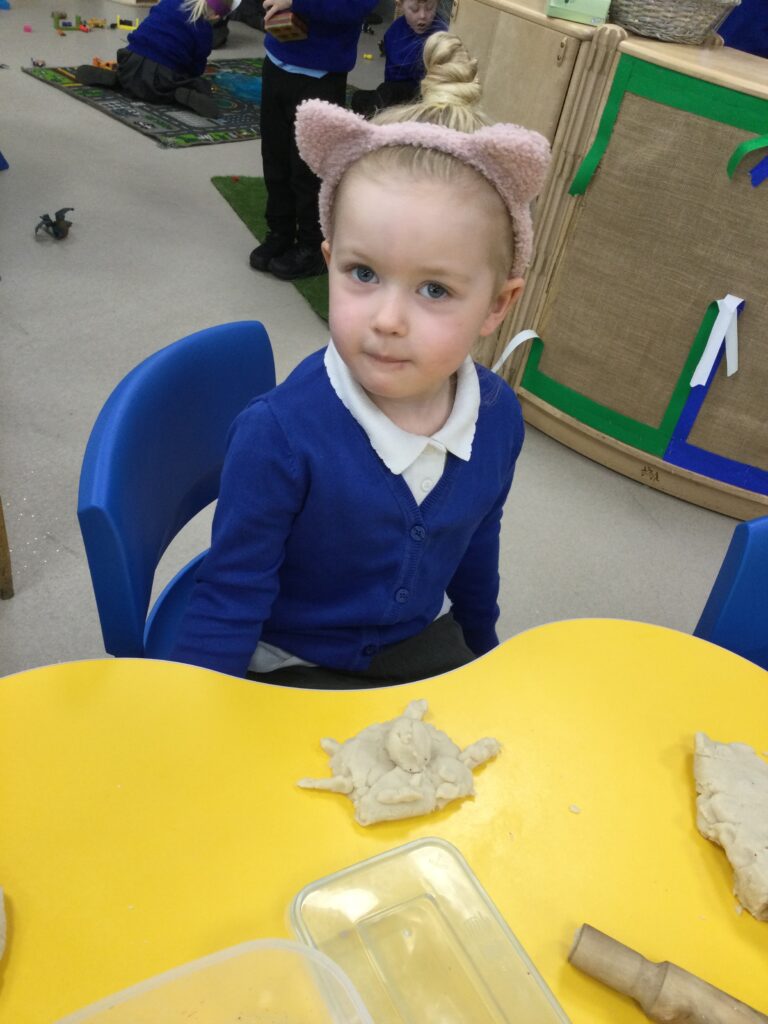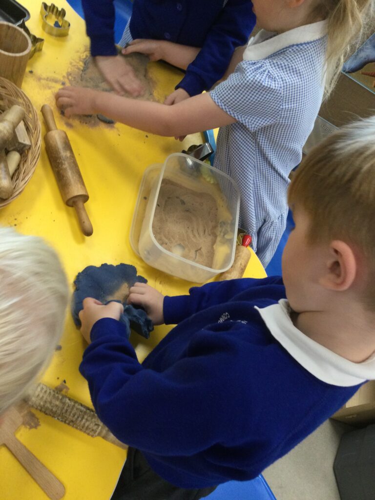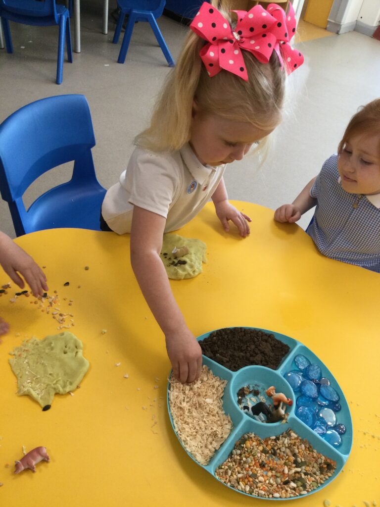 In Reception we have been learning about Dinosaurs. We have been learning about the different kind of dinosaurs that existed and researching which dinosaurs were Carnivores and which were Herbivores. We have been exploring and searching for dinosaur fossils, using the playdough to make our own dinosaurs and working on our counting skills and number recognition in the maths area. We have been playing with the dinosaurs in the small world area and exploring artifacts in the understanding the world area.