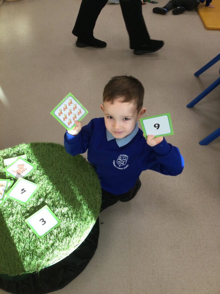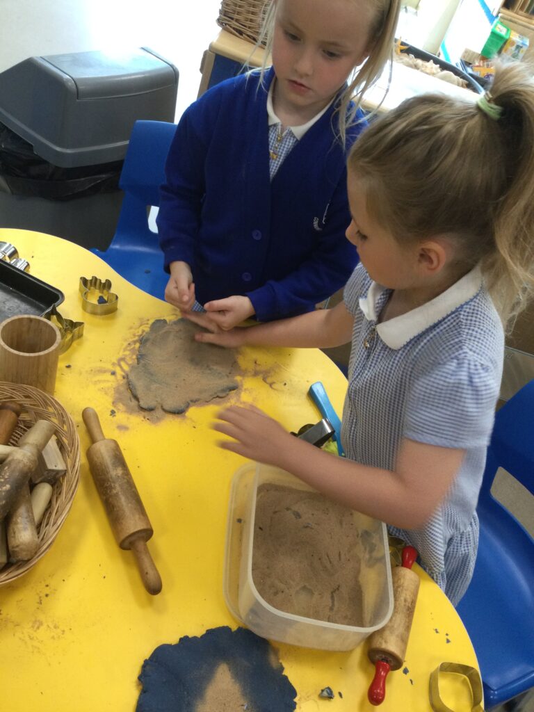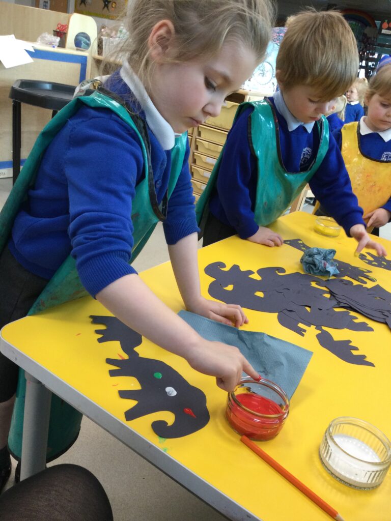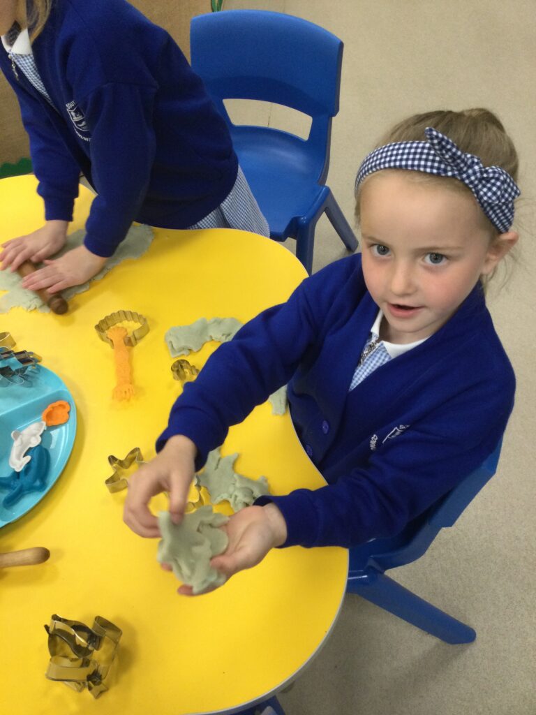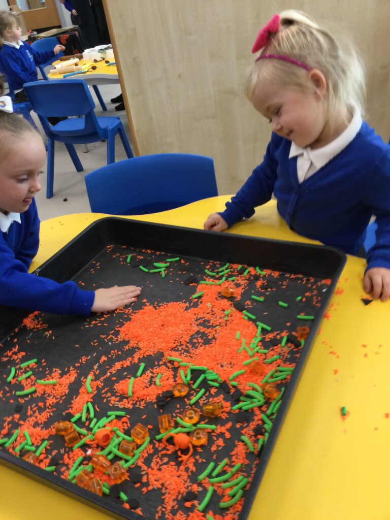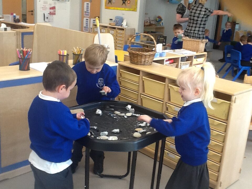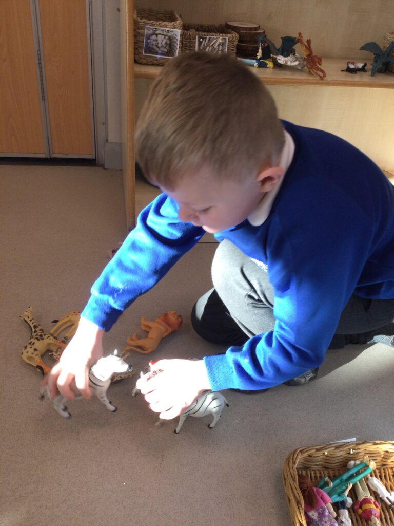 In Reception we have been learning about Dinosaurs. We have been learning about the different kind of dinosaurs that existed and researching which dinosaurs were Carnivores and which were Herbivores. We have been exploring and searching for dinosaur fossils, using the playdough to make our own dinosaurs and working on our counting skills and number recognition in the maths area. We have been playing with the dinosaurs in the small world area and exploring artifacts in the understanding the world area.