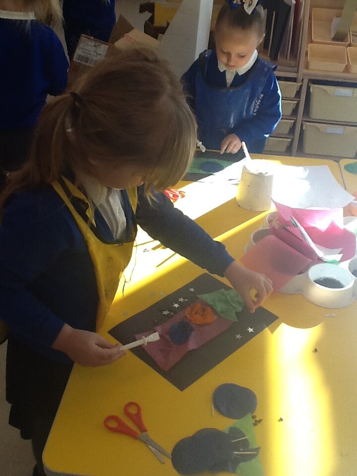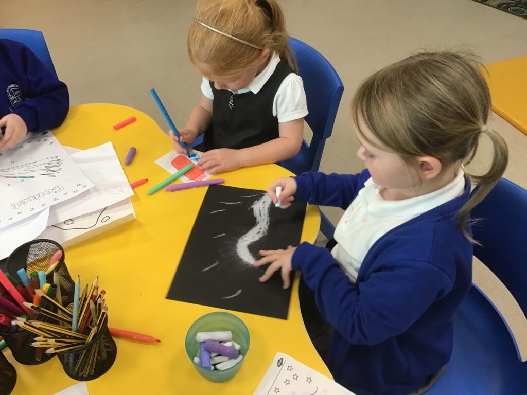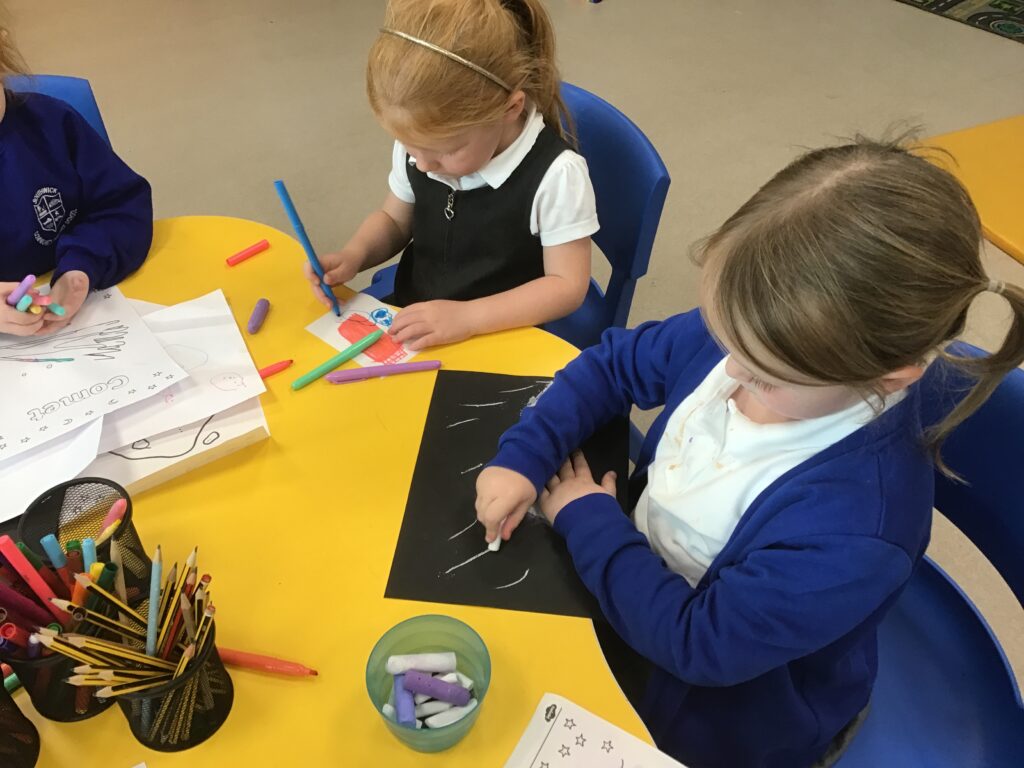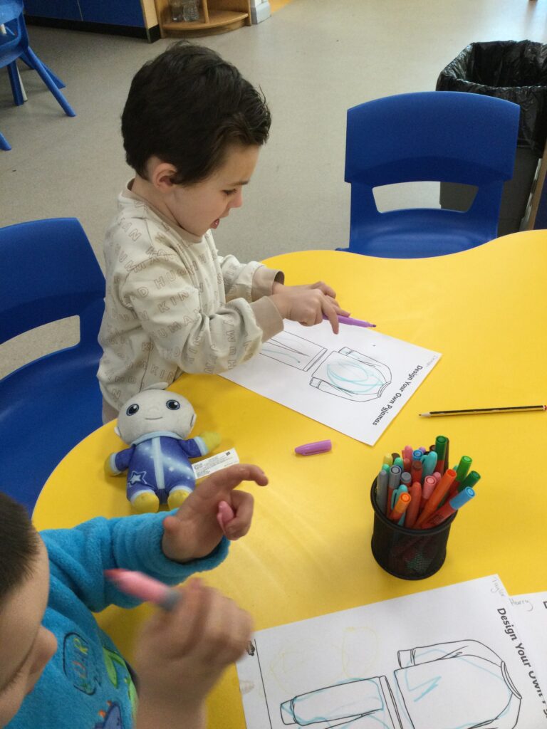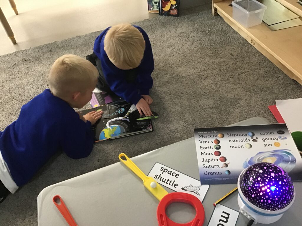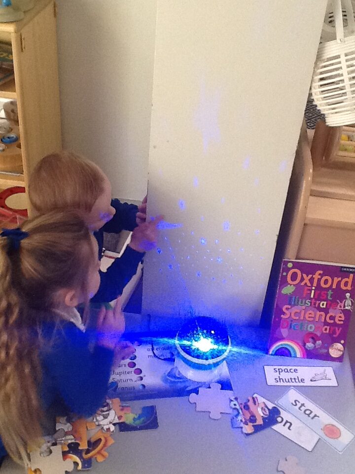 This week we have been learning all about space and the planets. We have been exploring in our space tough tray, reading books all about space and participating in fun space related activities. We have been using our knowledge of shapes to build our own rockets in the creative area, we have also been working on our printing skills in the creative area. We have been doing space counting in the math’s area and dressing up as astronauts using our role play skills to make up our own play narrative.