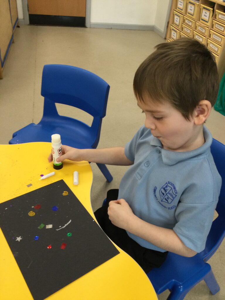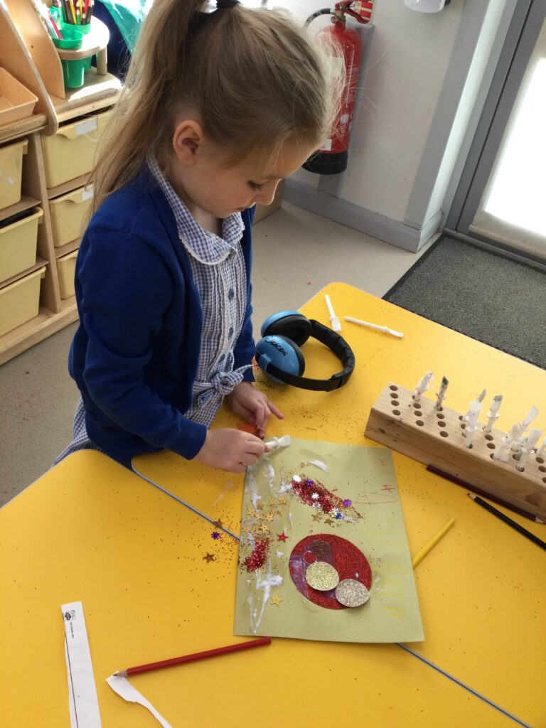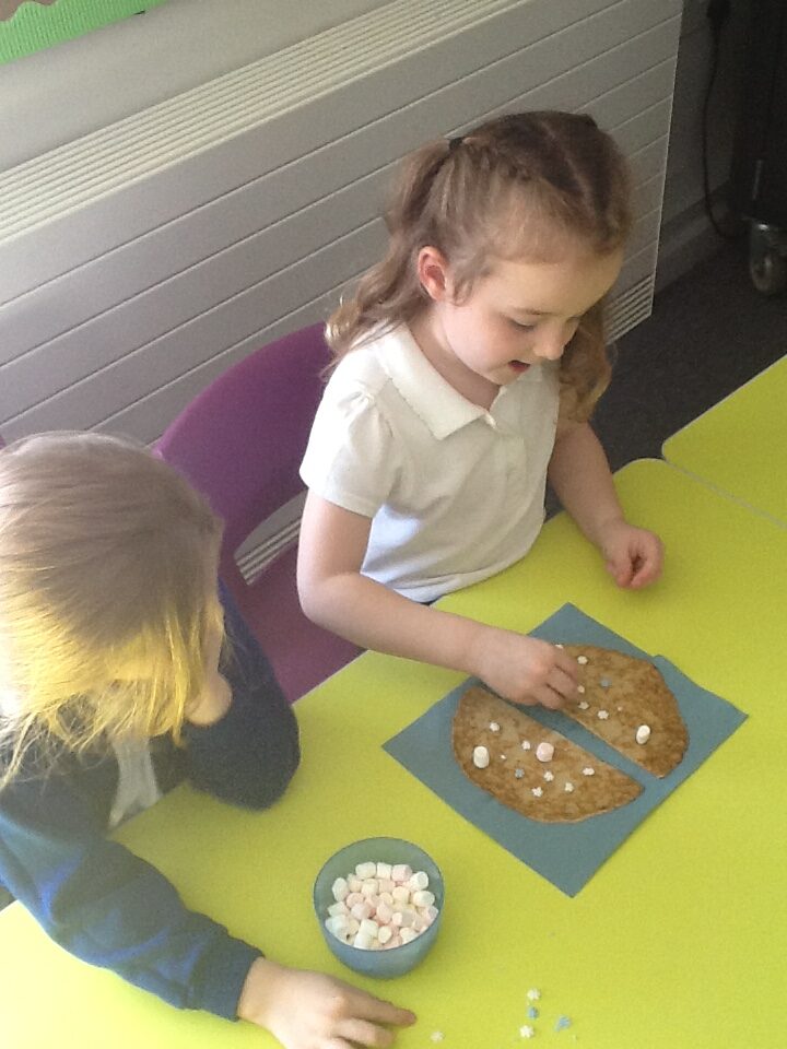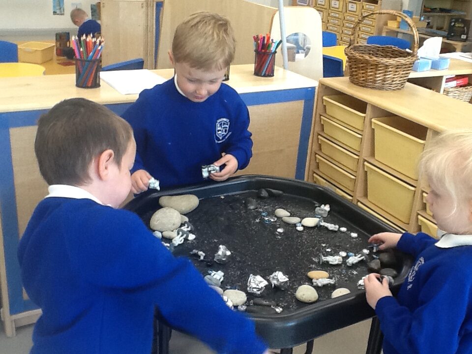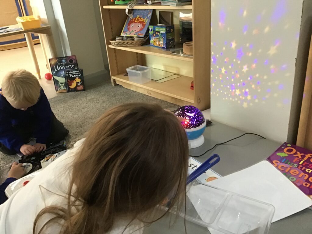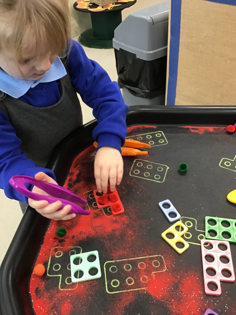 This week we have been learning all about space and the planets. We have been exploring in our space tough tray, reading books all about space and participating in fun space related activities. We have been using our knowledge of shapes to build our own rockets in the creative area, we have also been working on our printing skills in the creative area. We have been doing space counting in the math’s area and dressing up as astronauts using our role play skills to make up our own play narrative.