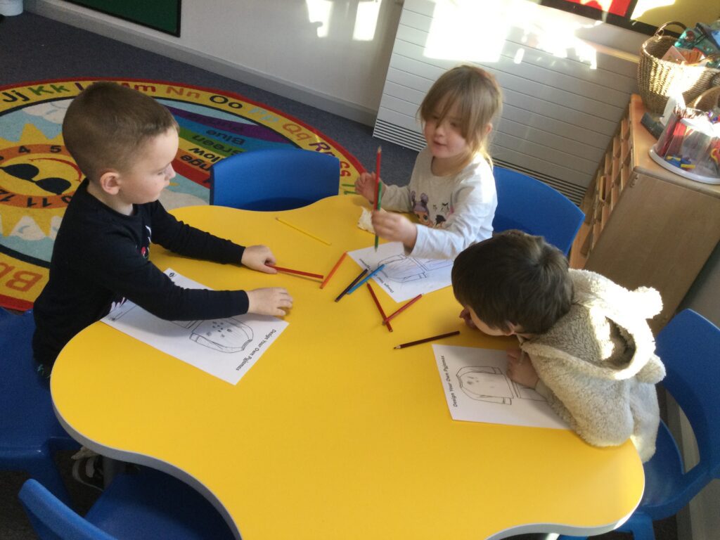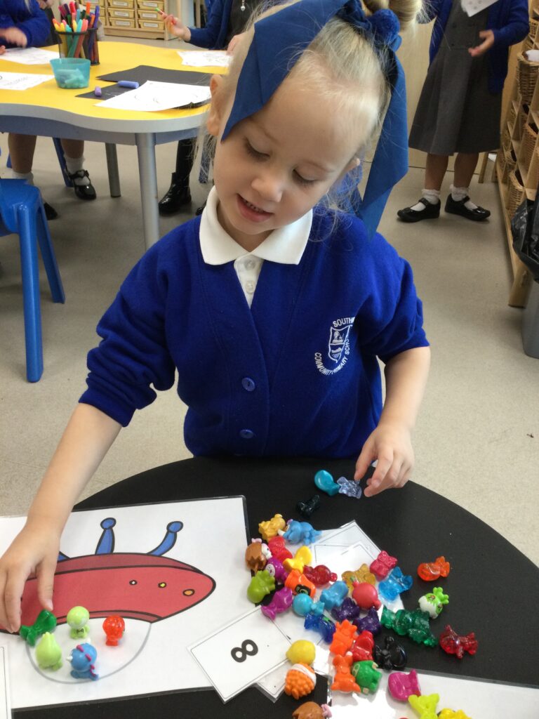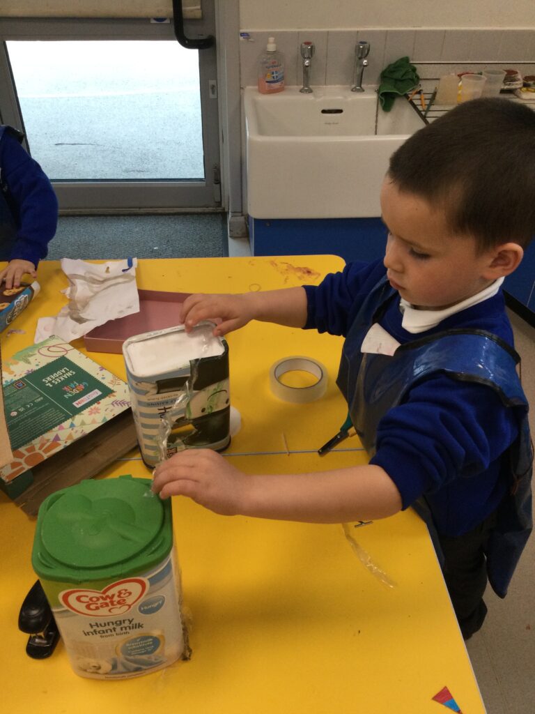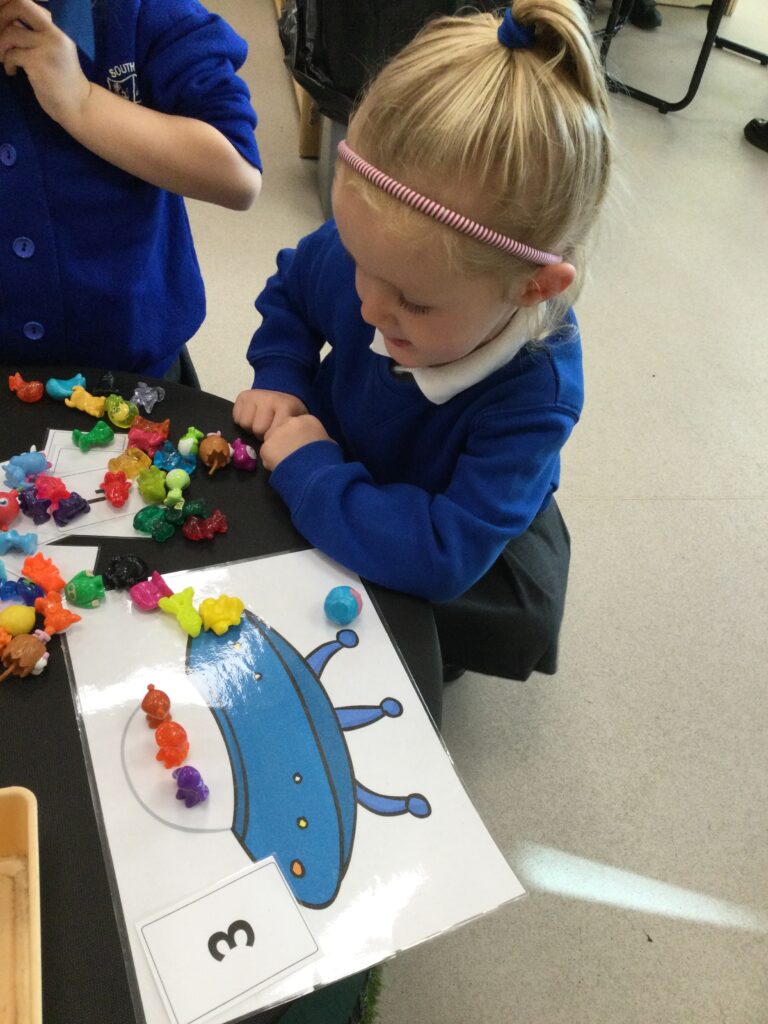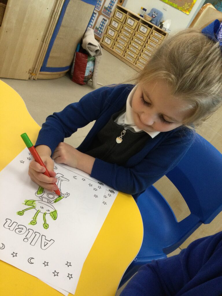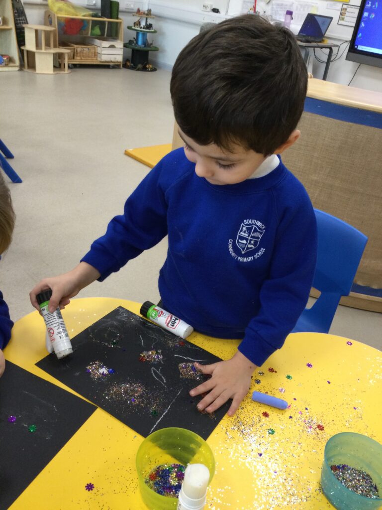 This week we have been learning all about space and the planets. We have been exploring in our space tough tray, reading books all about space and participating in fun space related activities. We have been using our knowledge of shapes to build our own rockets in the creative area, we have also been working on our printing skills in the creative area. We have been doing space counting in the math’s area and dressing up as astronauts using our role play skills to make up our own play narrative.