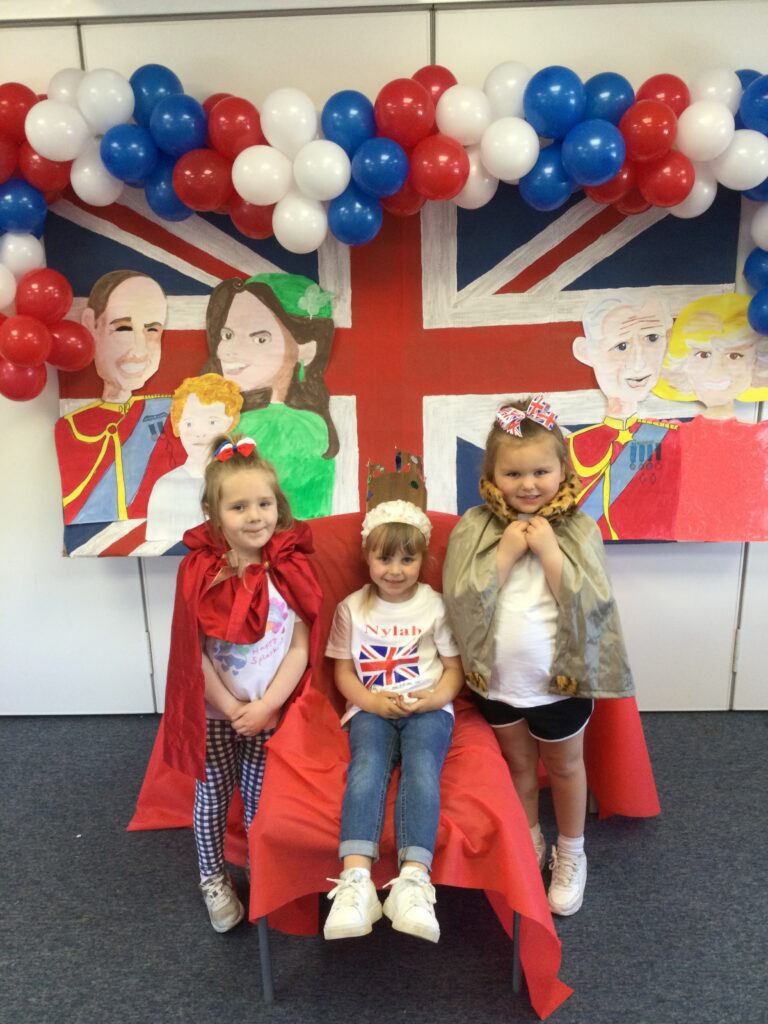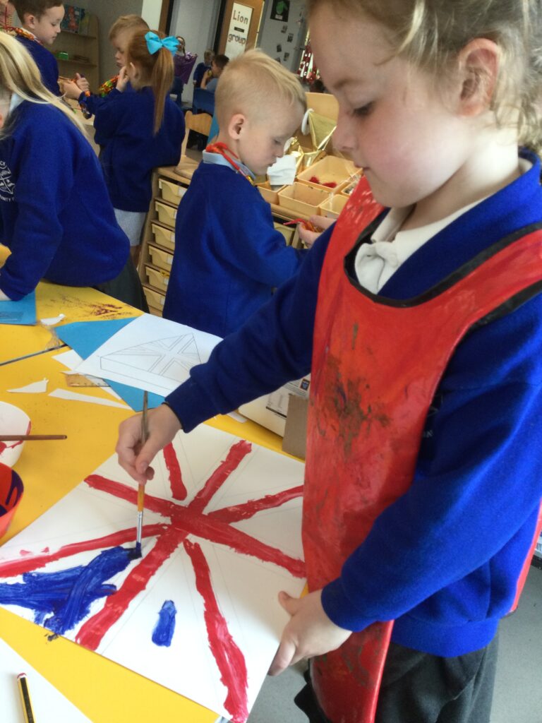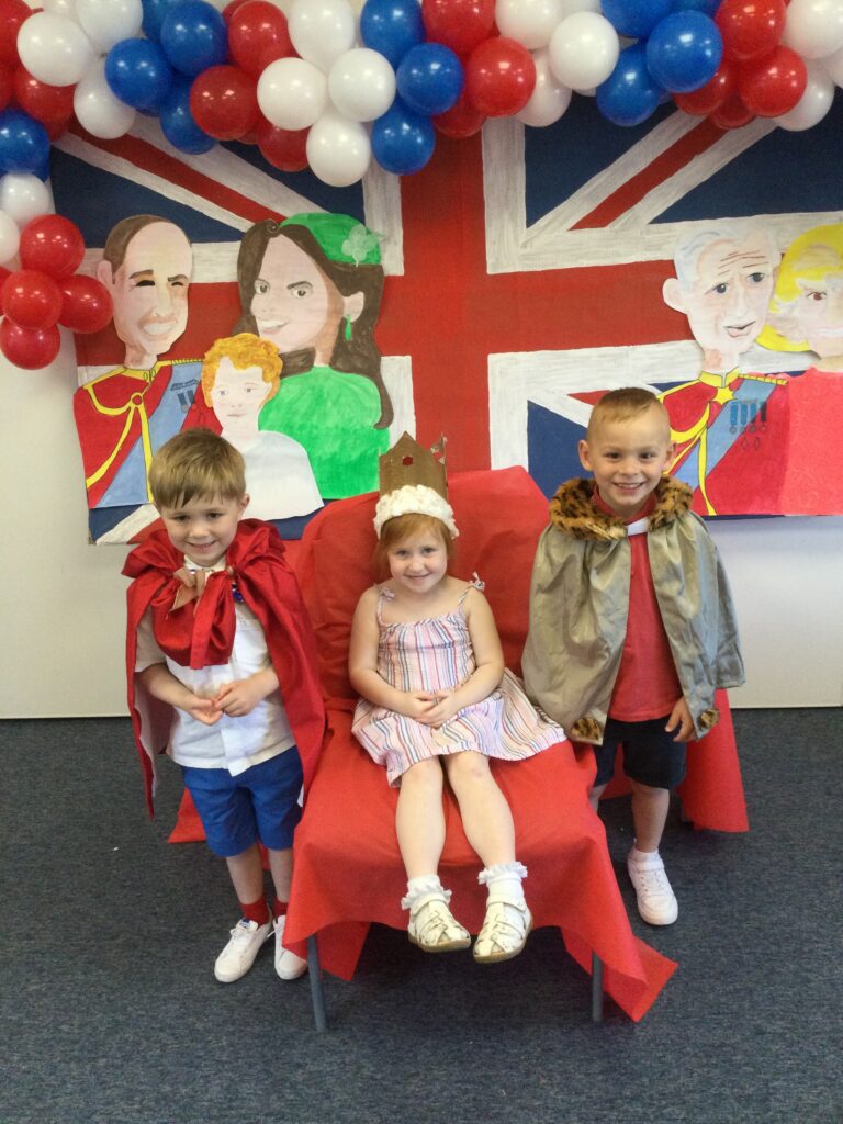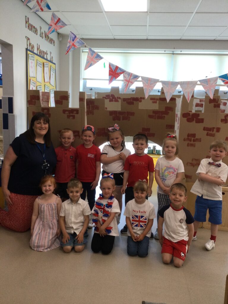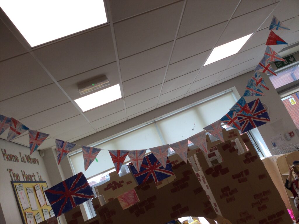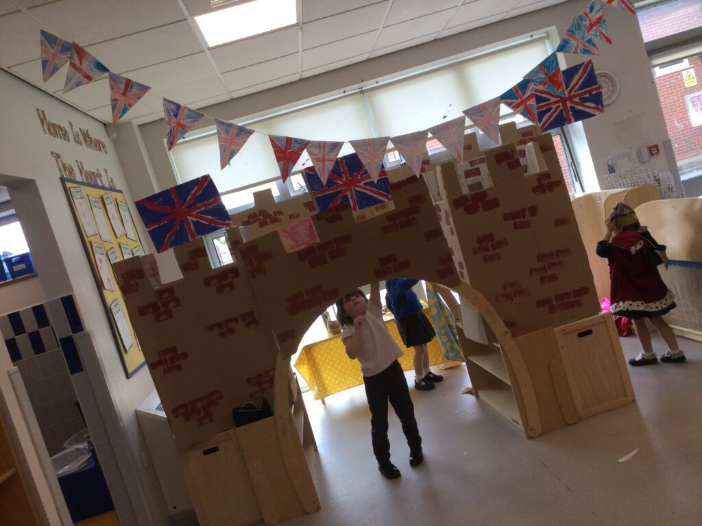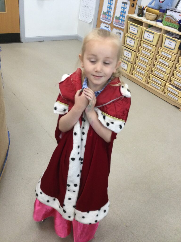 In Reception we have been learning all about the Platinum Jubilee and preparing for the upcoming celebration. We have made and turned our role play area into a royal castle. We have been dressing up as royalty and using this to inspire our role play narrative. We have also been learning all about the Queen and her role as Queen. We have researched and learned all about the history of the Queen and her family, and have also been looking at money and how the Queen face is present on this. We have made flags of the united Kingdom to hold and wave at our Jubilee party. We have also designed and made our very own crowns, paper chains and bunting which we have decorated our classroom with. Outside we have decorated our fence by weaving red , blue and white ribbon to represent the colours of the United kingdom. We have also used stamps to create portraits of the Queen, using our cutting skills to create these. In the construction area we have been using the resources to build models of castles, we have also been doing this in the malleable area using the playdough to create models of crowns, Buckingham Palace and Windsor Castle.