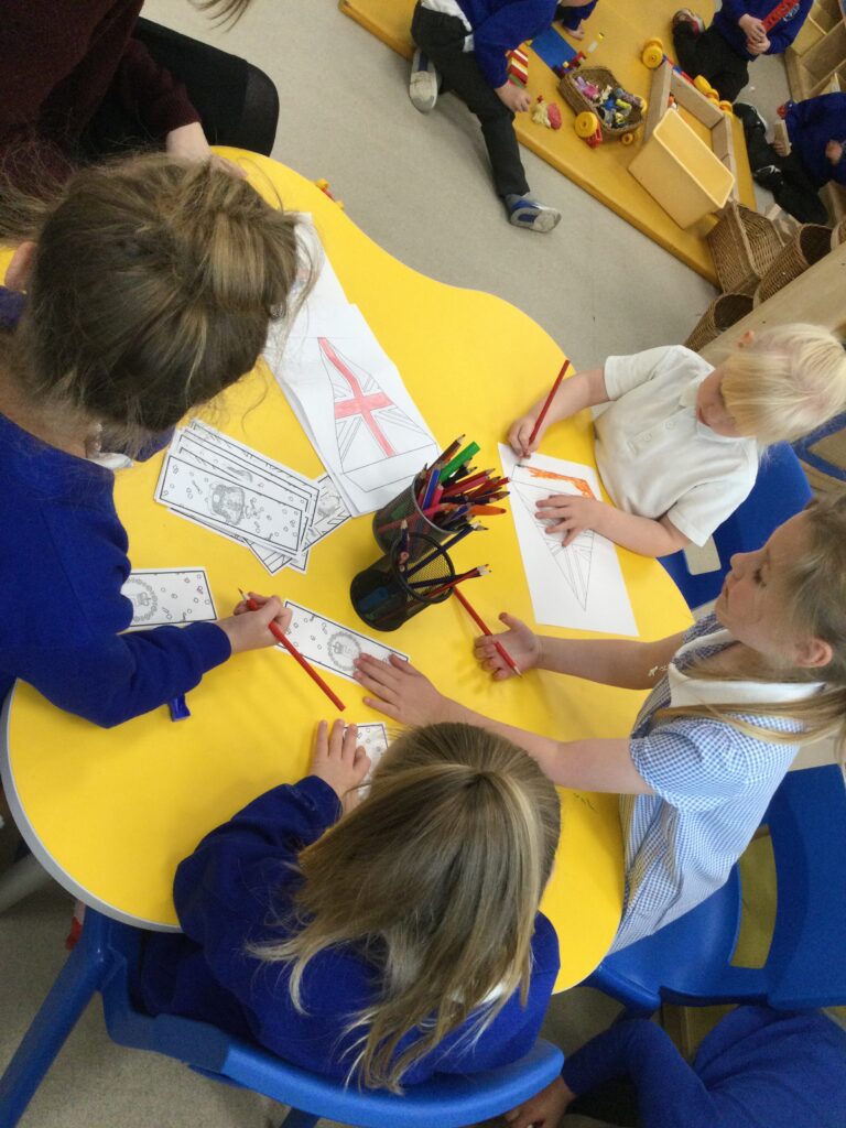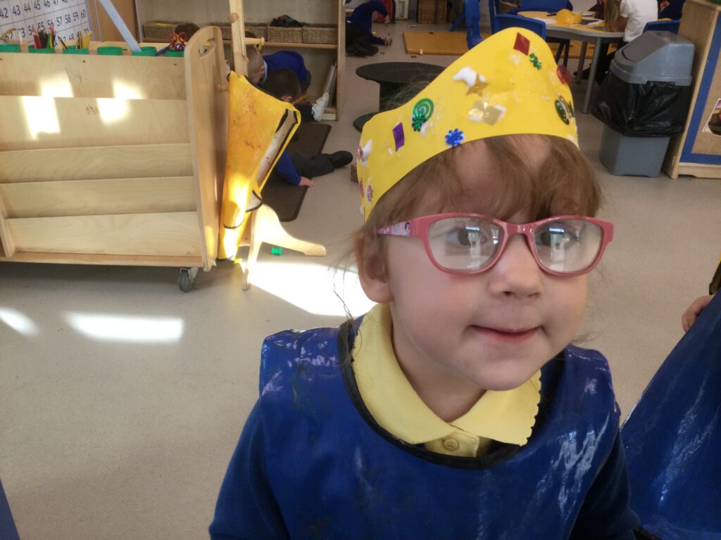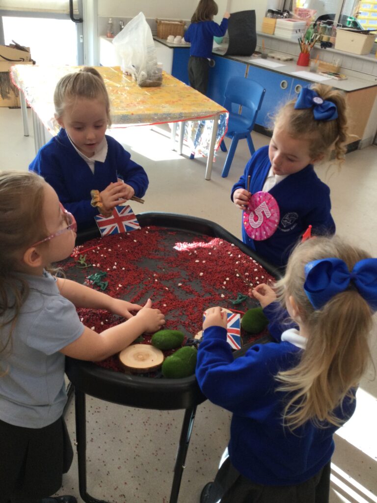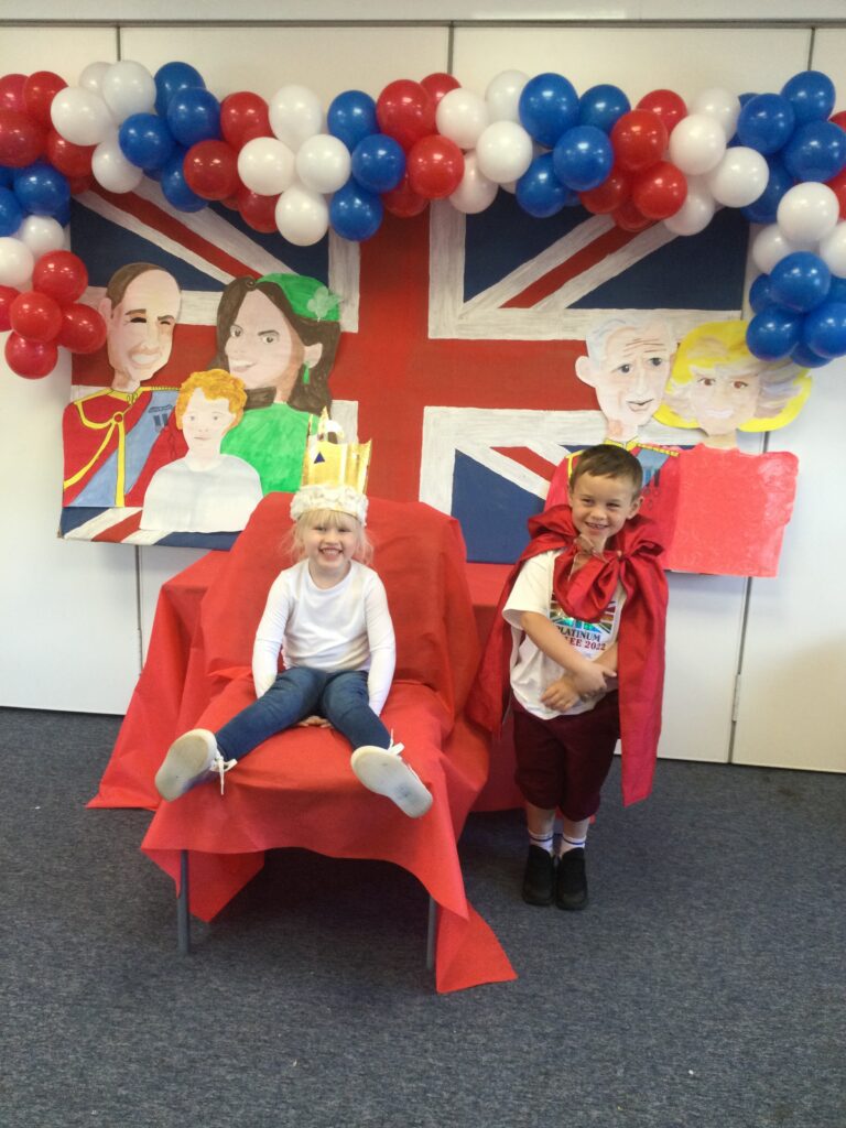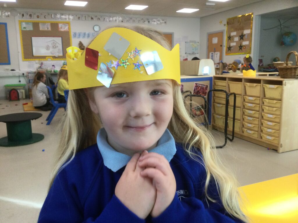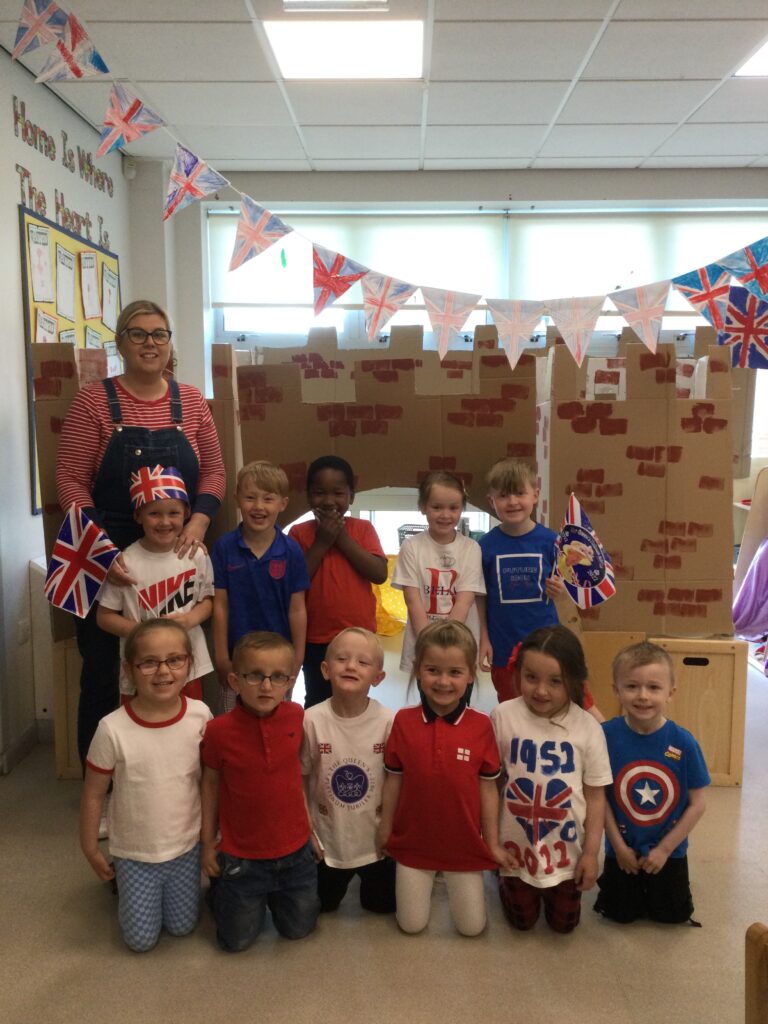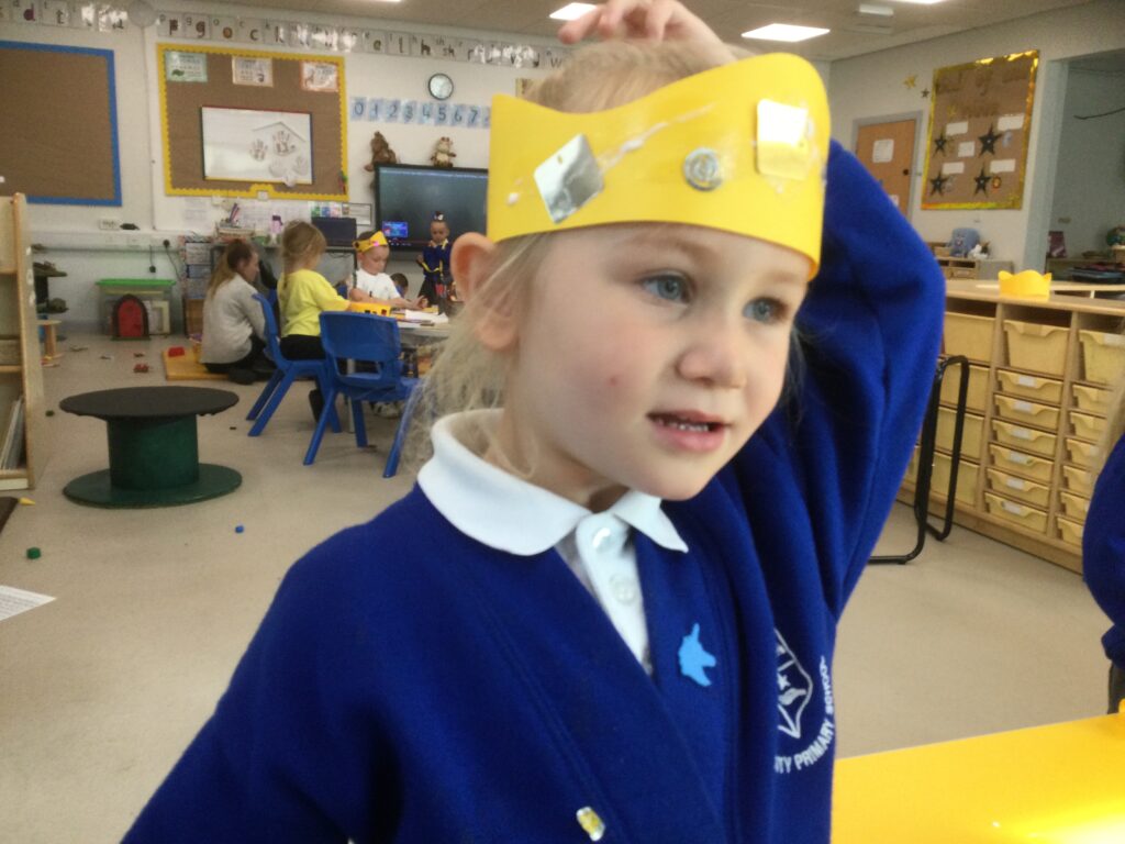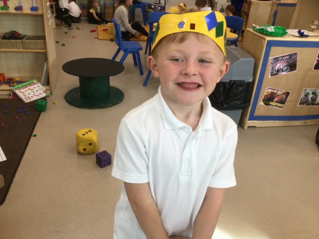 In Reception we have been learning all about the Platinum Jubilee and preparing for the upcoming celebration. We have made and turned our role play area into a royal castle. We have been dressing up as royalty and using this to inspire our role play narrative. We have also been learning all about the Queen and her role as Queen. We have researched and learned all about the history of the Queen and her family, and have also been looking at money and how the Queen face is present on this. We have made flags of the united Kingdom to hold and wave at our Jubilee party. We have also designed and made our very own crowns, paper chains and bunting which we have decorated our classroom with. Outside we have decorated our fence by weaving red , blue and white ribbon to represent the colours of the United kingdom. We have also used stamps to create portraits of the Queen, using our cutting skills to create these. In the construction area we have been using the resources to build models of castles, we have also been doing this in the malleable area using the playdough to create models of crowns, Buckingham Palace and Windsor Castle.