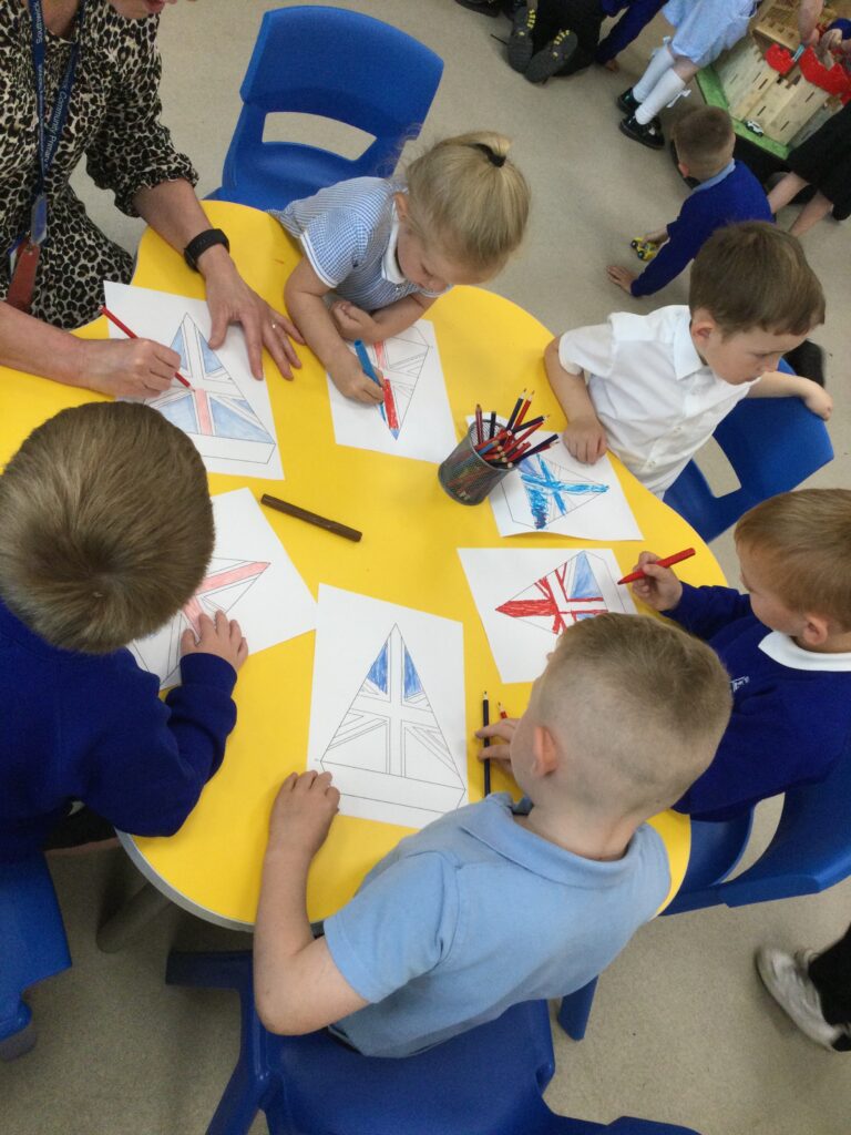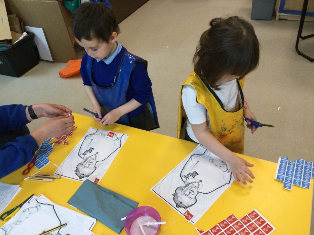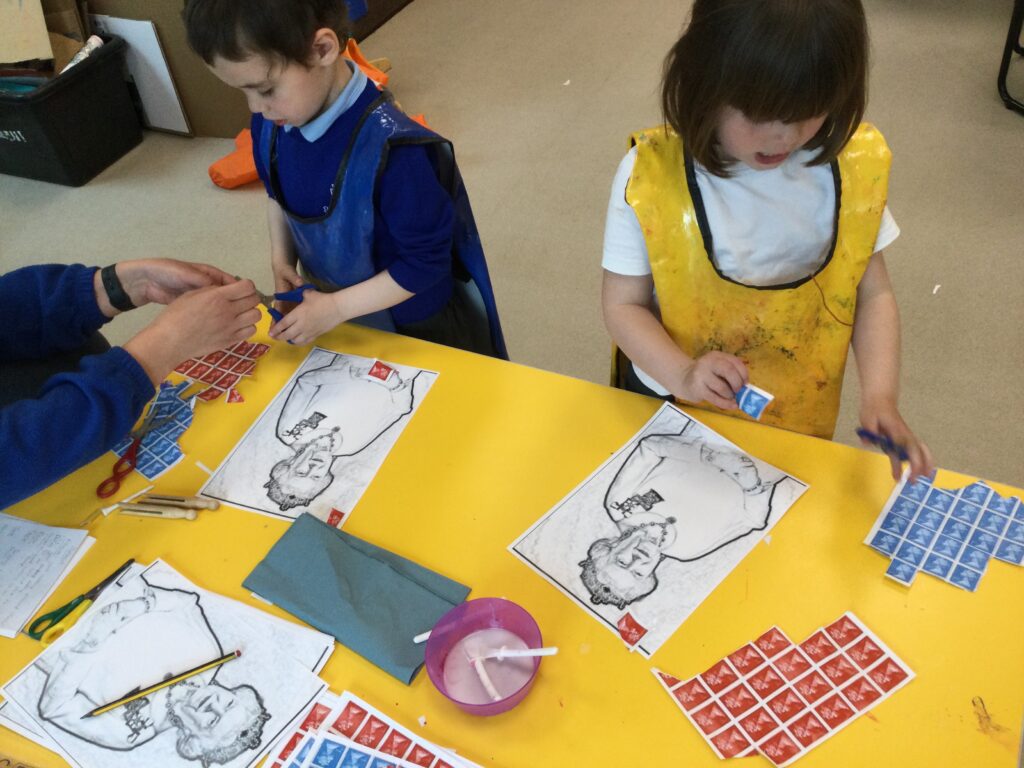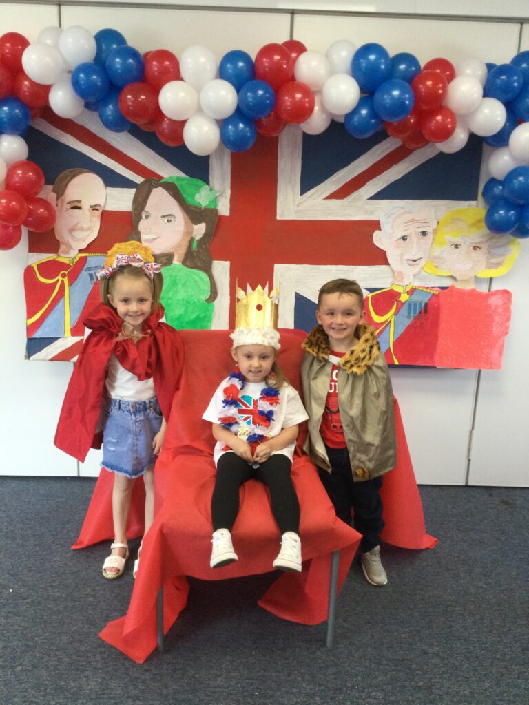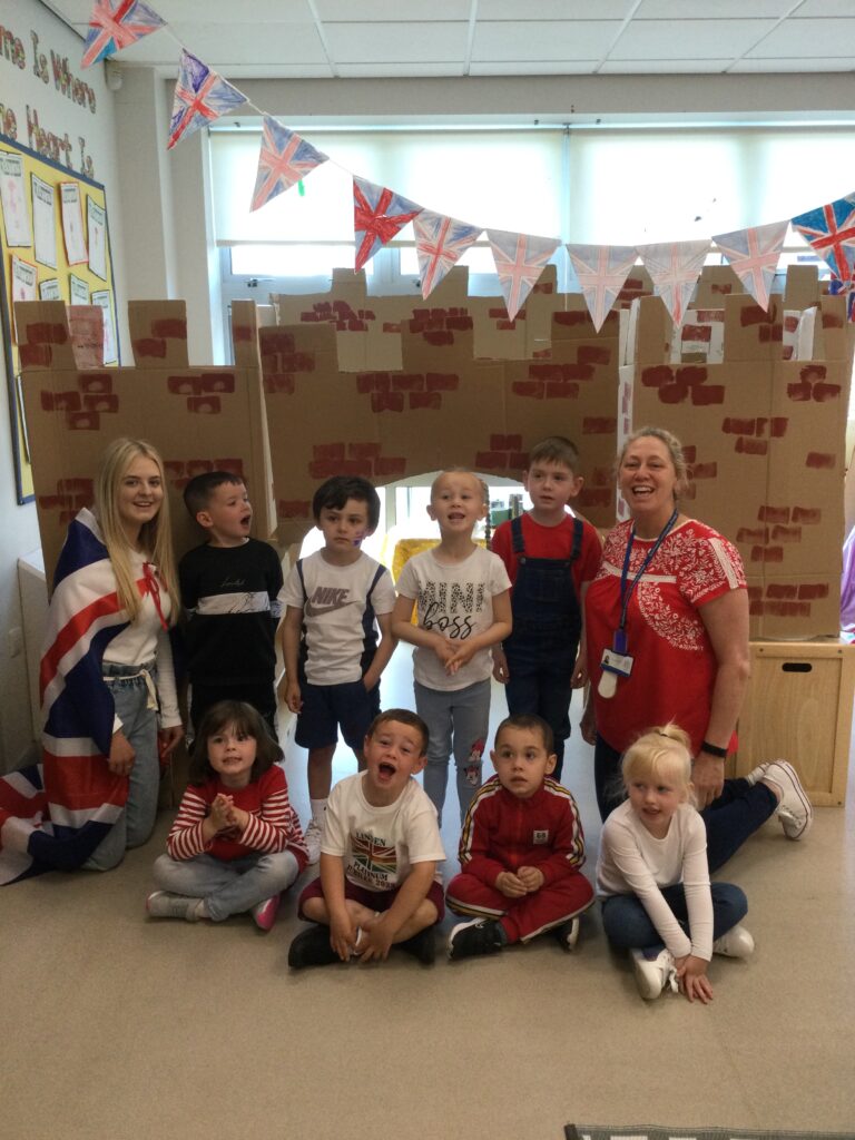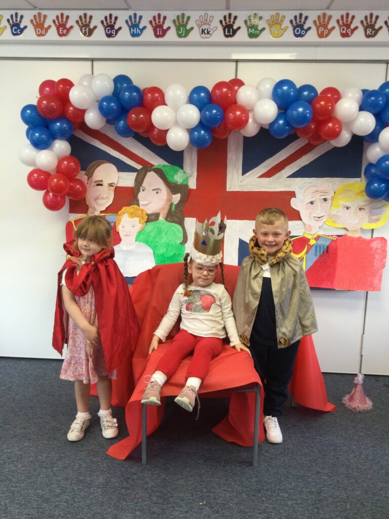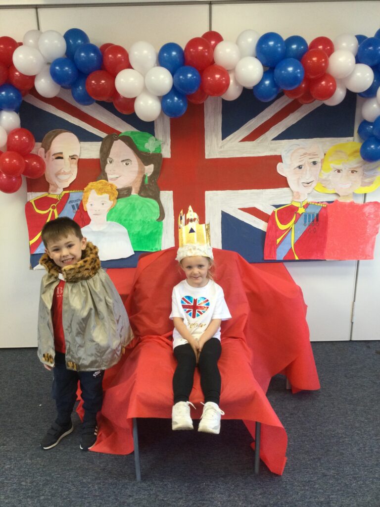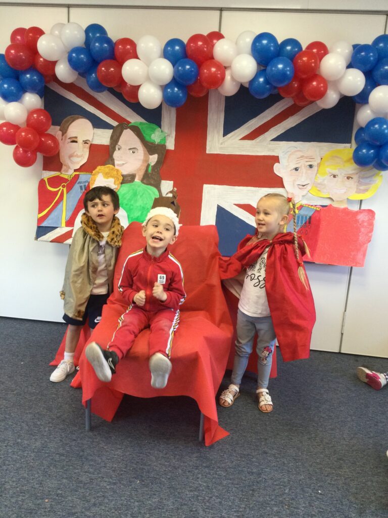 In Reception we have been learning all about the Platinum Jubilee and preparing for the upcoming celebration. We have made and turned our role play area into a royal castle. We have been dressing up as royalty and using this to inspire our role play narrative. We have also been learning all about the Queen and her role as Queen. We have researched and learned all about the history of the Queen and her family, and have also been looking at money and how the Queen face is present on this. We have made flags of the united Kingdom to hold and wave at our Jubilee party. We have also designed and made our very own crowns, paper chains and bunting which we have decorated our classroom with. Outside we have decorated our fence by weaving red , blue and white ribbon to represent the colours of the United kingdom. We have also used stamps to create portraits of the Queen, using our cutting skills to create these. In the construction area we have been using the resources to build models of castles, we have also been doing this in the malleable area using the playdough to create models of crowns, Buckingham Palace and Windsor Castle.