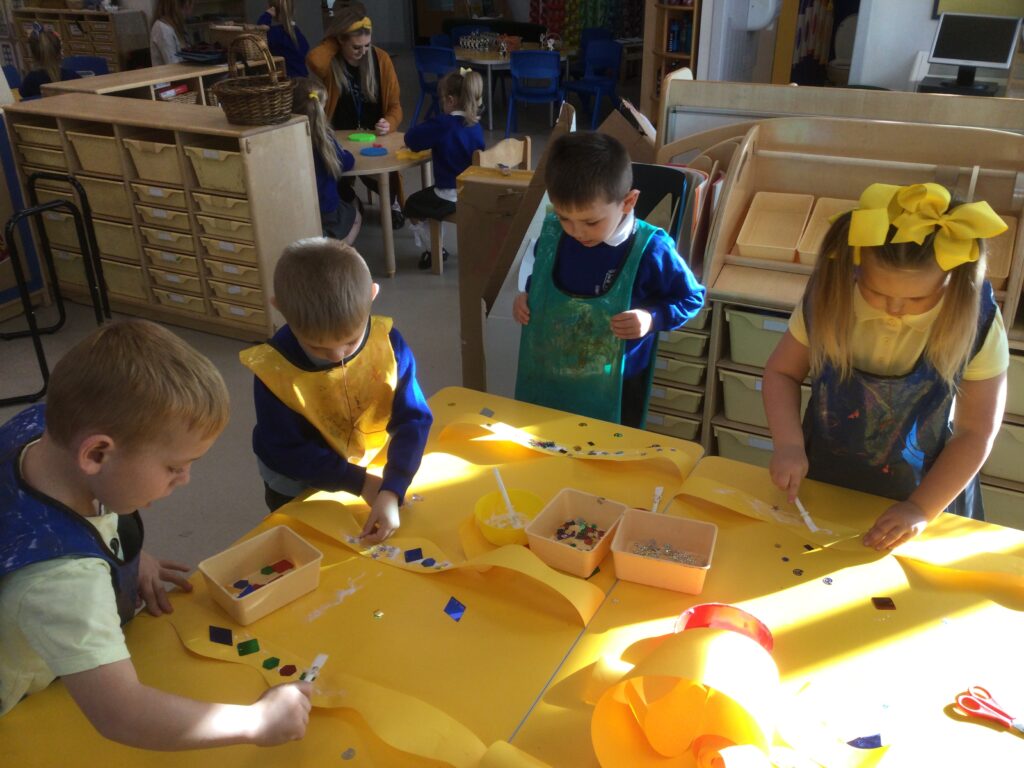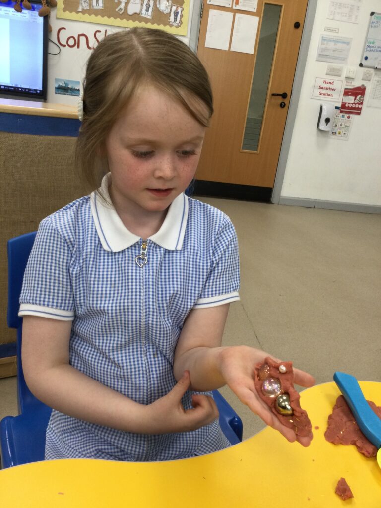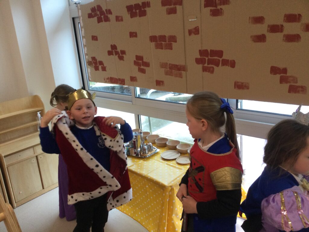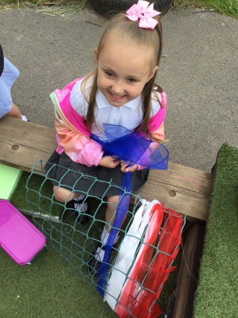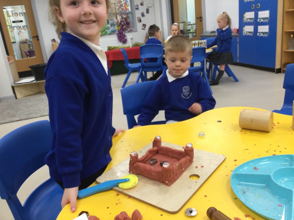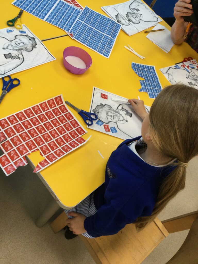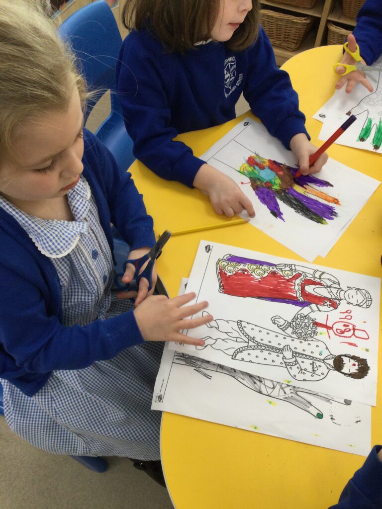 In Reception we have been learning all about the Platinum Jubilee and preparing for the upcoming celebration. We have made and turned our role play area into a royal castle. We have been dressing up as royalty and using this to inspire our role play narrative. We have also been learning all about the Queen and her role as Queen. We have researched and learned all about the history of the Queen and her family, and have also been looking at money and how the Queen face is present on this. We have made flags of the united Kingdom to hold and wave at our Jubilee party. We have also designed and made our very own crowns, paper chains and bunting which we have decorated our classroom with. Outside we have decorated our fence by weaving red , blue and white ribbon to represent the colours of the United kingdom. We have also used stamps to create portraits of the Queen, using our cutting skills to create these. In the construction area we have been using the resources to build models of castles, we have also been doing this in the malleable area using the playdough to create models of crowns, Buckingham Palace and Windsor Castle.