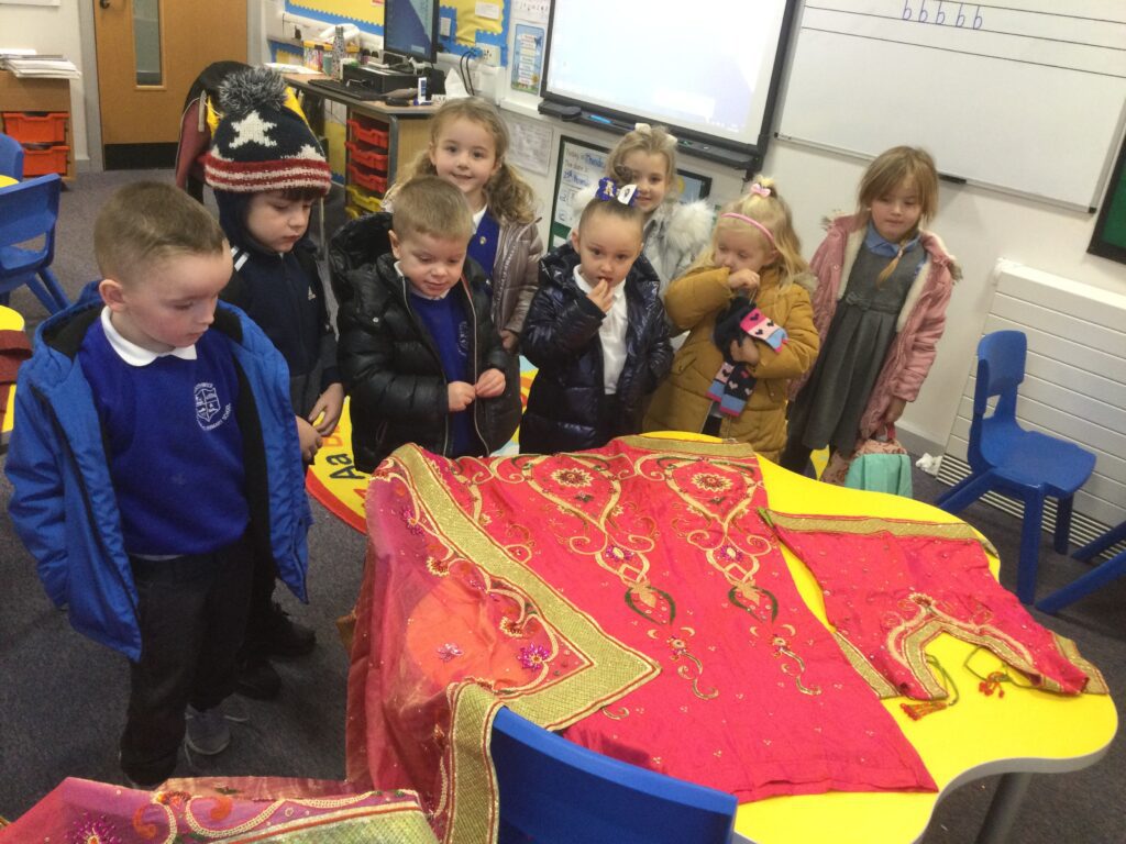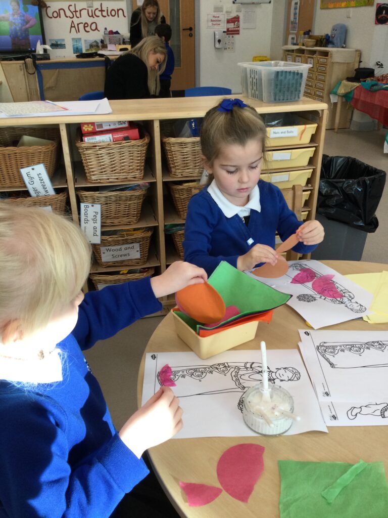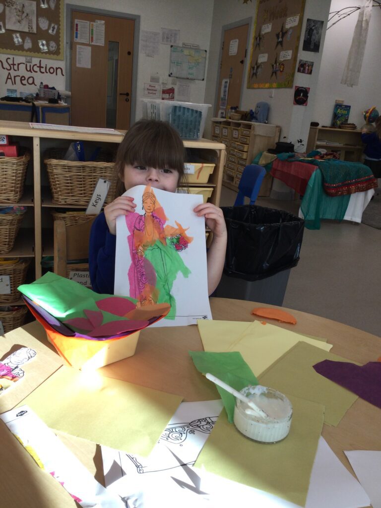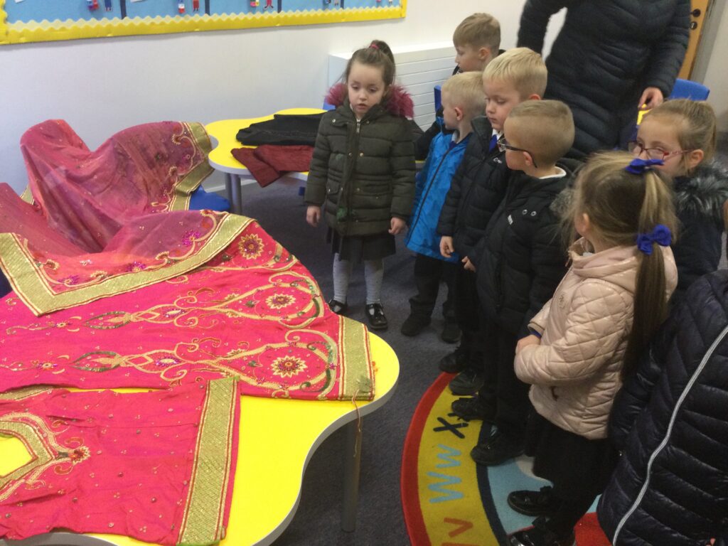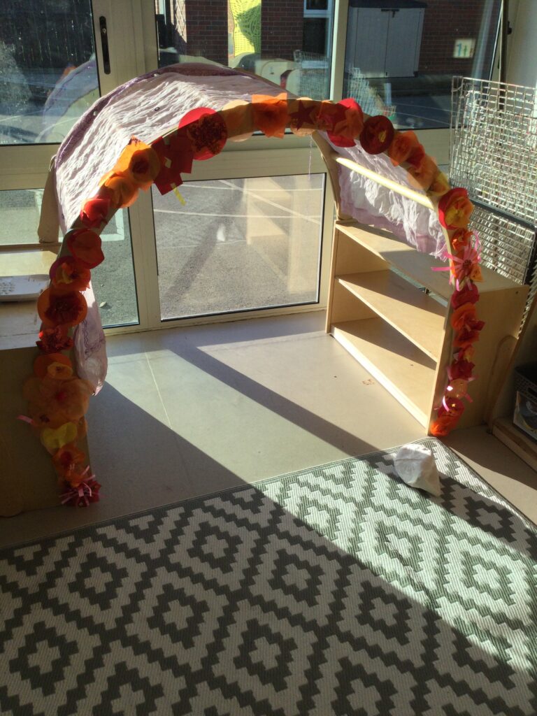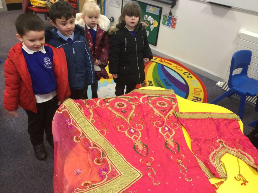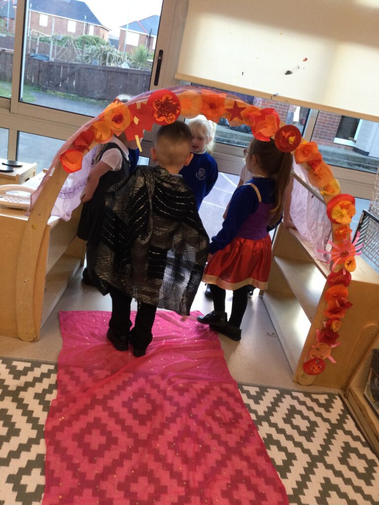 This week we have been learning all about Hindu weddings and traditions. We watched video clips of different Hindu weddings, read books, and learned lots of new facts in topic groups. In the creative area we made our own flowers using different materials. We looked at images of a range of flowers to inspire our work and then used these flowers to decorate our role play area arch and turn it into a canopy of flowers , as we learned this is a key tradition of a Hindu wedding. Once our Canopy was complete we wore Saree’s and traditional Hindu wedding clothes to act out our own Hindu wedding. In the malleable area we manipulated the play dough to create,decorate and design our own Hindu wedding cake’s whilst looking and comparing how they are similar and different to Christian wedding cakes. We also designed,decorated and drew our own Mehndi patterns as we learned Mehndi parties are a key tradition that a Hindu bride takes part in. We explored real Hindu wedding artifacts including traditional wedding clothing.