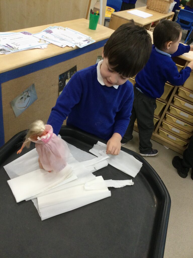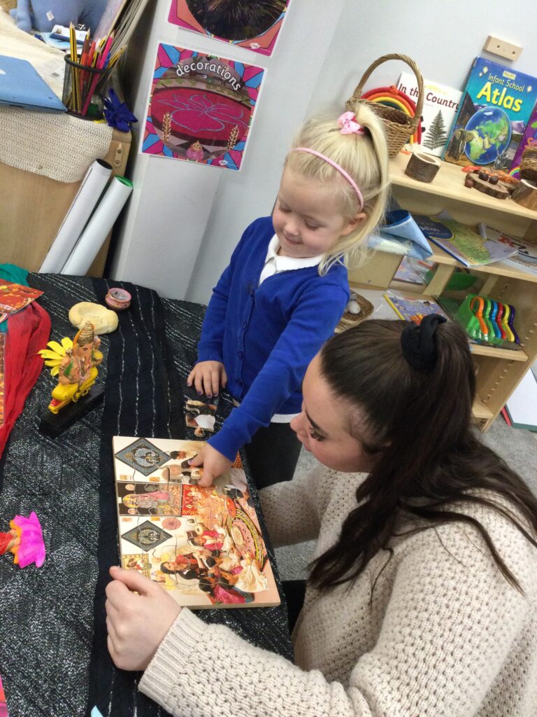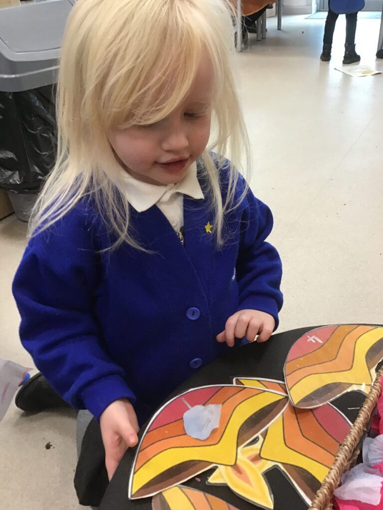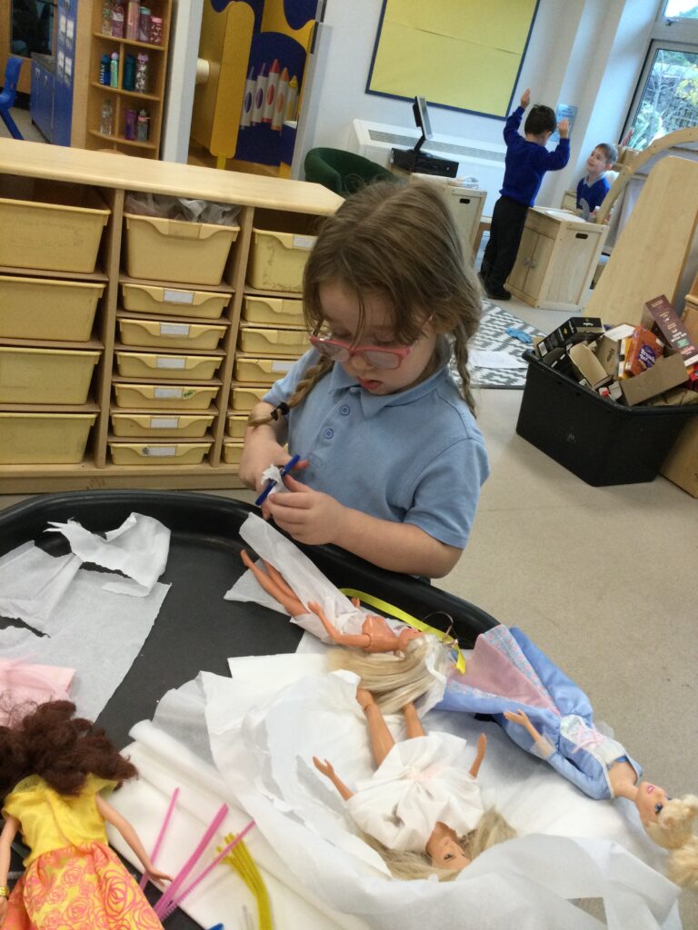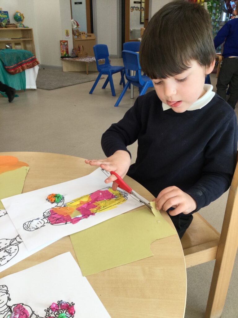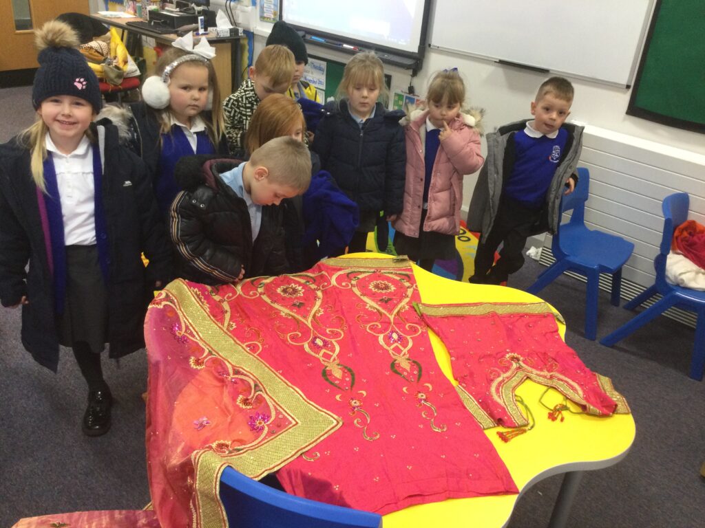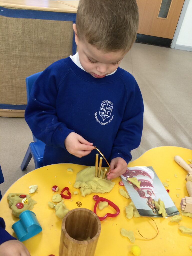 This week we have been learning all about Hindu weddings and traditions. We watched video clips of different Hindu weddings, read books, and learned lots of new facts in topic groups. In the creative area we made our own flowers using different materials. We looked at images of a range of flowers to inspire our work and then used these flowers to decorate our role play area arch and turn it into a canopy of flowers , as we learned this is a key tradition of a Hindu wedding. Once our Canopy was complete we wore Saree’s and traditional Hindu wedding clothes to act out our own Hindu wedding. In the malleable area we manipulated the play dough to create,decorate and design our own Hindu wedding cake’s whilst looking and comparing how they are similar and different to Christian wedding cakes. We also designed,decorated and drew our own Mehndi patterns as we learned Mehndi parties are a key tradition that a Hindu bride takes part in. We explored real Hindu wedding artifacts including traditional wedding clothing.