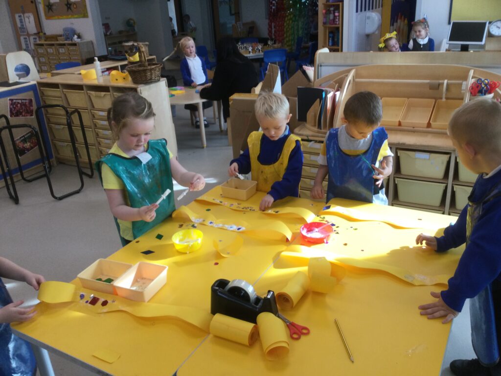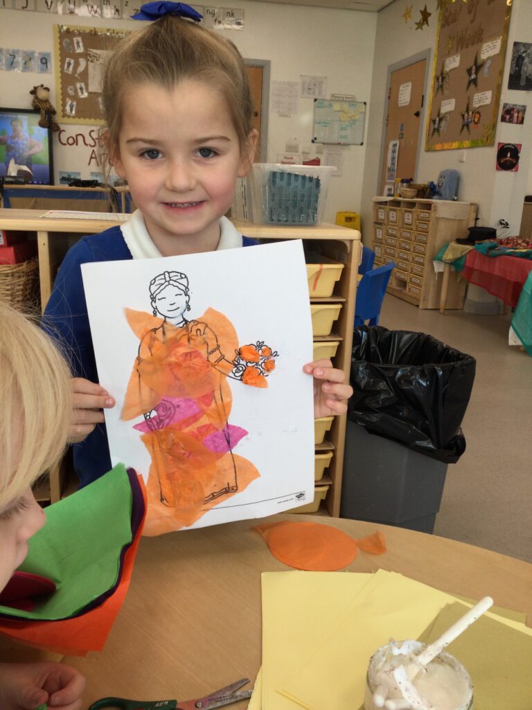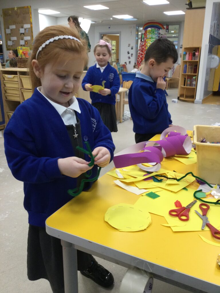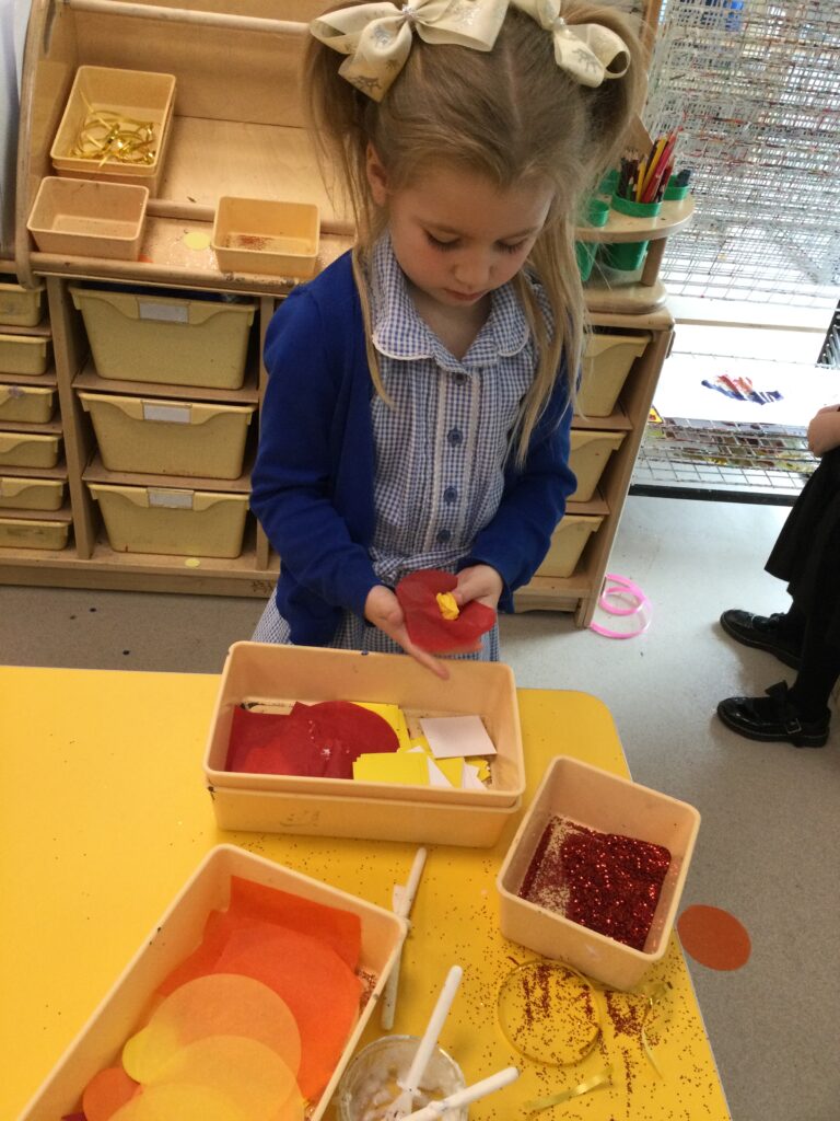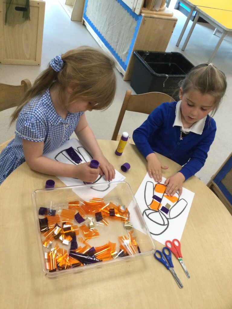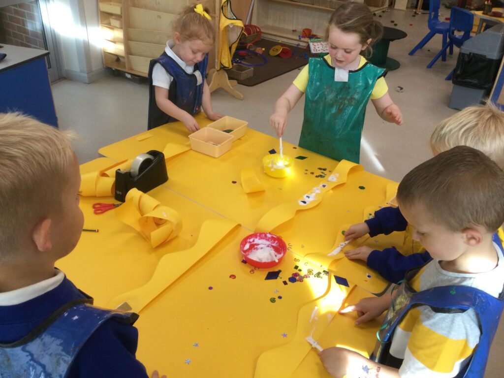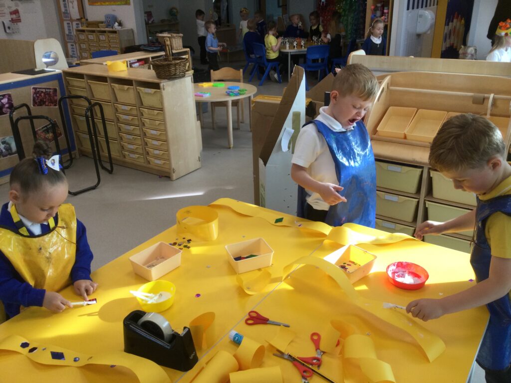 This week we have been learning all about Hindu weddings and traditions. We watched video clips of different Hindu weddings, read books, and learned lots of new facts in topic groups. In the creative area we made our own flowers using different materials. We looked at images of a range of flowers to inspire our work and then used these flowers to decorate our role play area arch and turn it into a canopy of flowers , as we learned this is a key tradition of a Hindu wedding. Once our Canopy was complete we wore Saree’s and traditional Hindu wedding clothes to act out our own Hindu wedding. In the malleable area we manipulated the play dough to create,decorate and design our own Hindu wedding cake’s whilst looking and comparing how they are similar and different to Christian wedding cakes. We also designed,decorated and drew our own Mehndi patterns as we learned Mehndi parties are a key tradition that a Hindu bride takes part in. We explored real Hindu wedding artifacts including traditional wedding clothing.