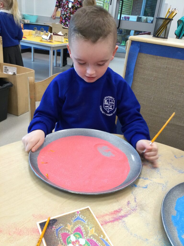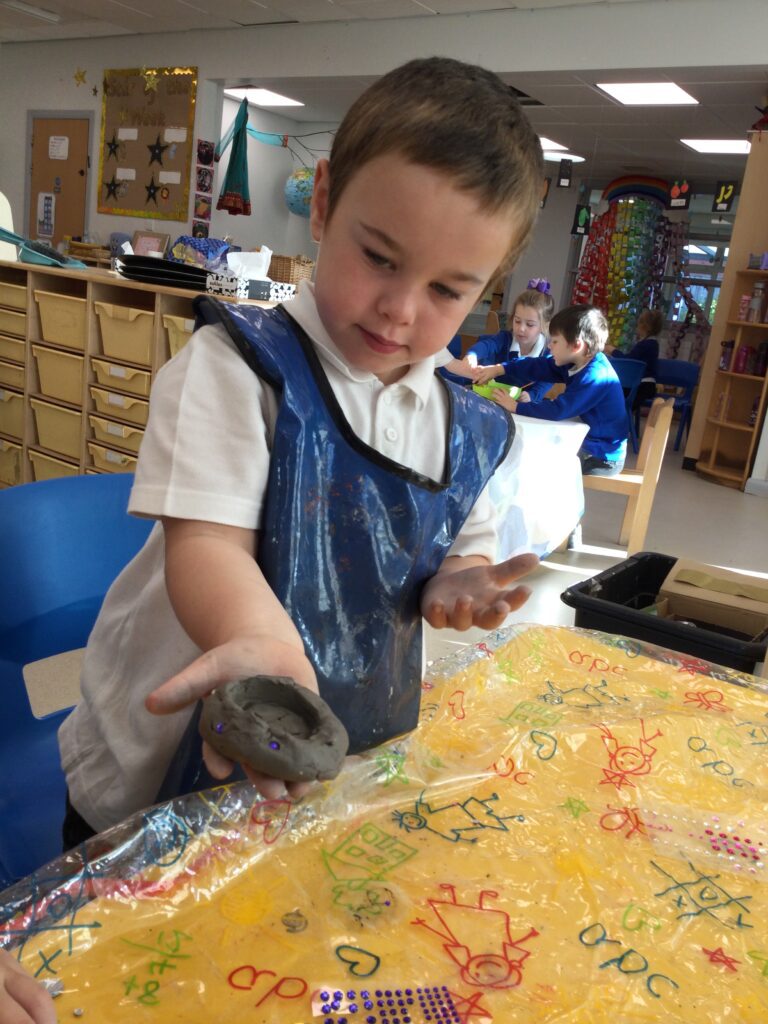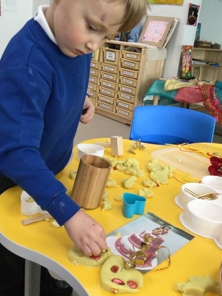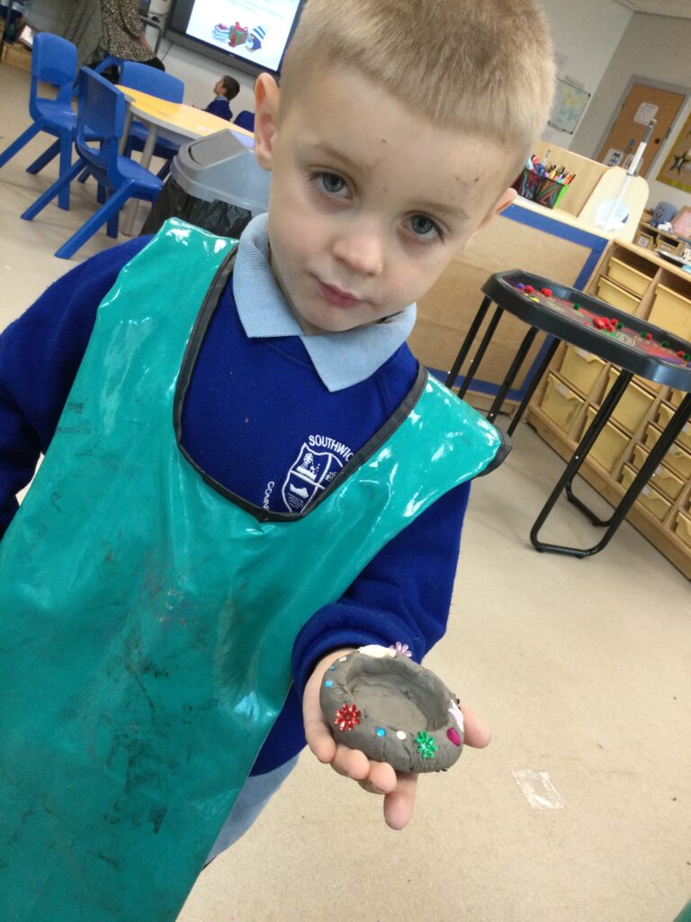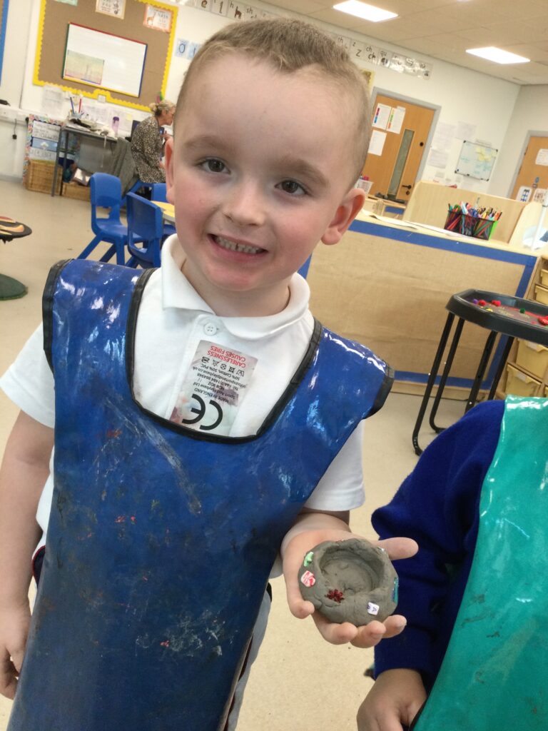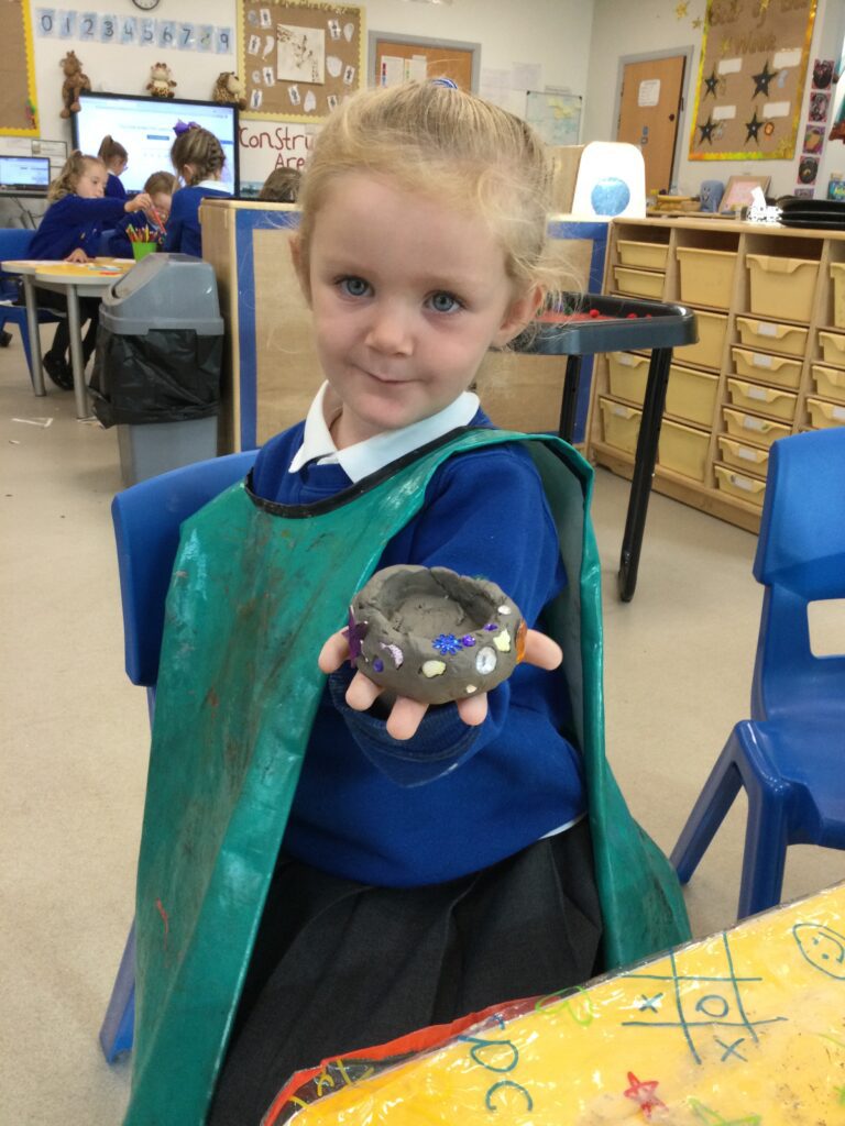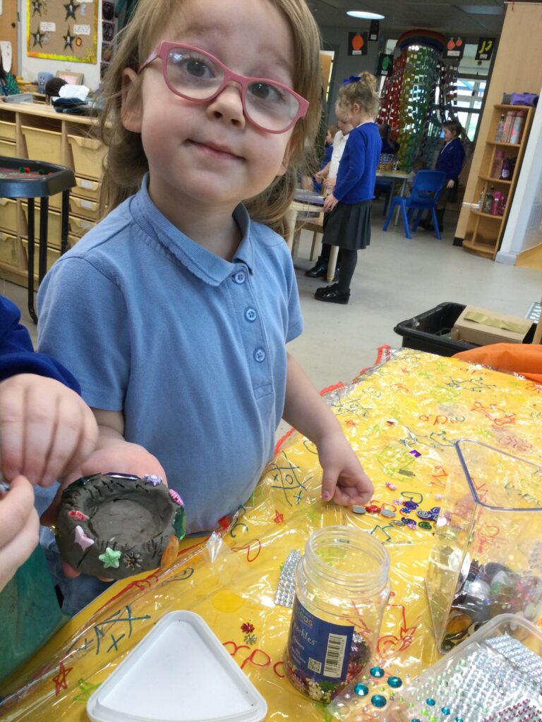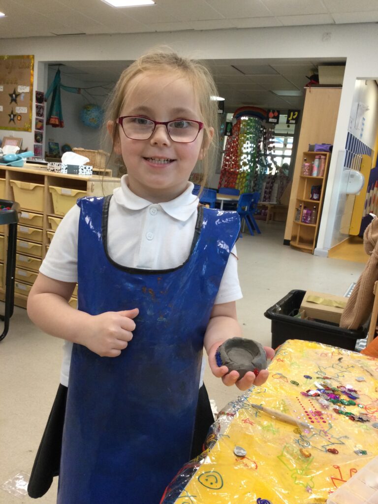 This week in Reception we have been learning all about ‘Diwali’ the festival of light and also Bonfire night. We have been making our very own Rangoli patterns in the glitter sand using tools such as paintbrushes and forks. We have also been making our very own Diya lamps using clay and decorative materials such as beads and sequins. We have been reading stories and watching videos all about the festival and what happens at this special time. We looked at the special clothing wore when celebrating Diwali and the preparation and traditions that Diwali en-tales. We learned about the Gods and Goddesses that Diwali is associated with such as Lakshmi, Rama and Sita.