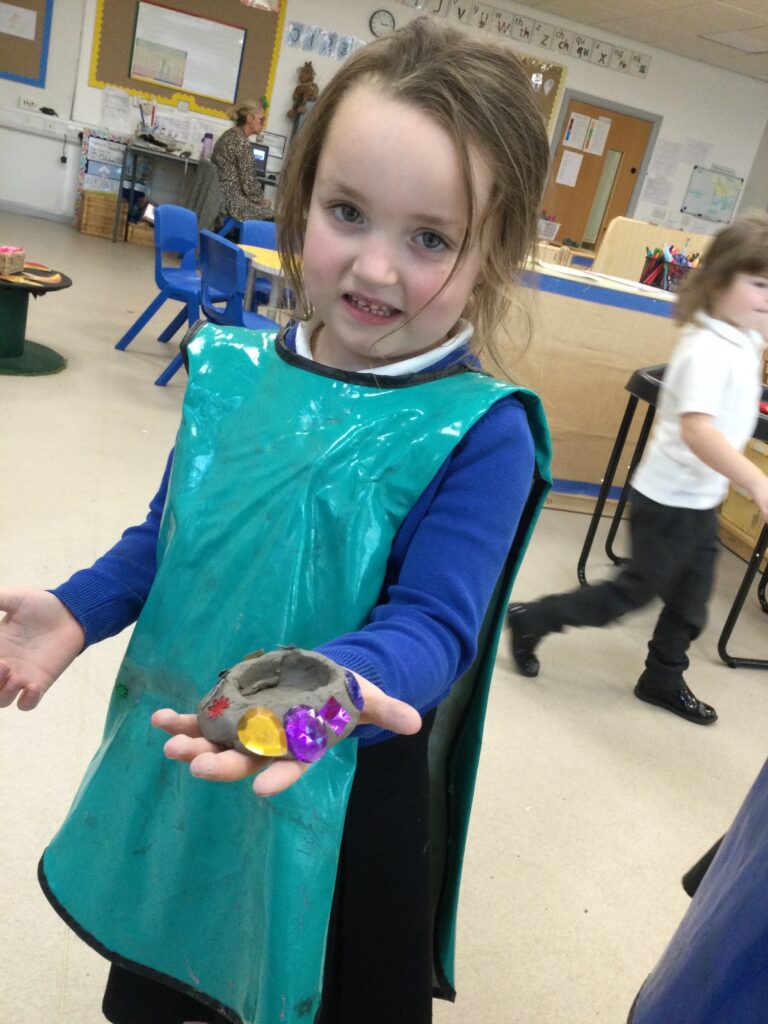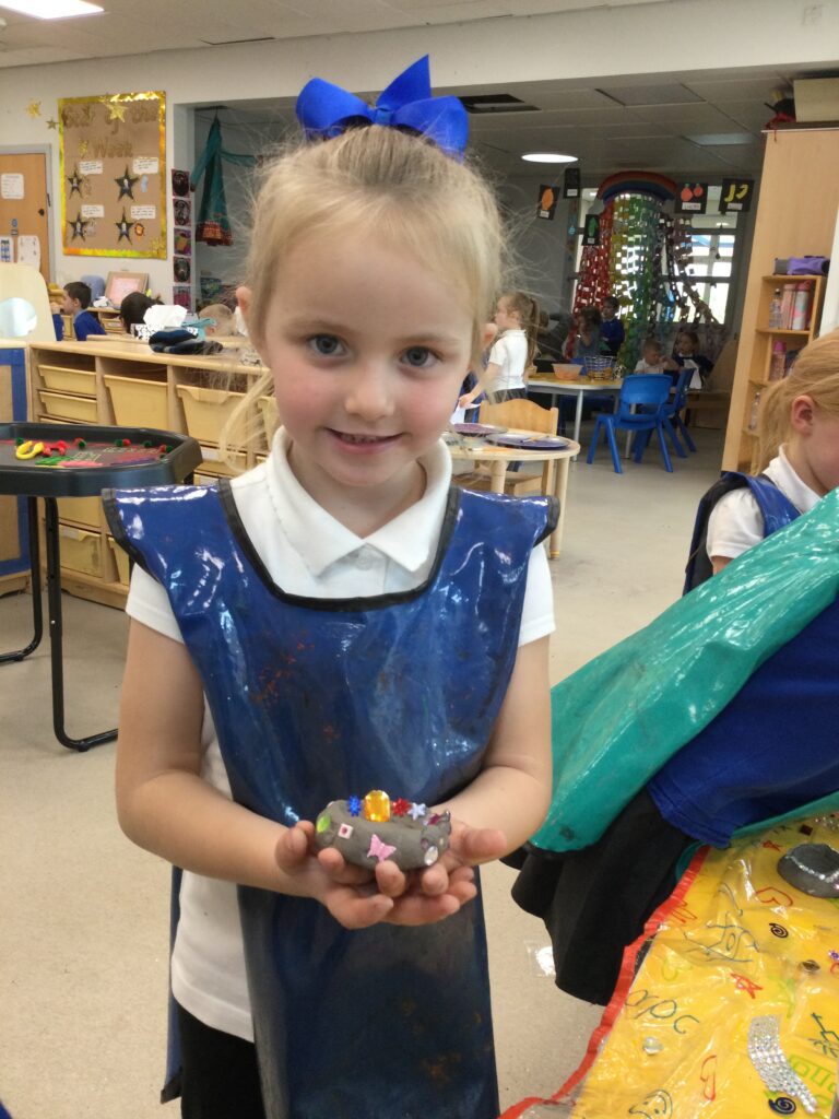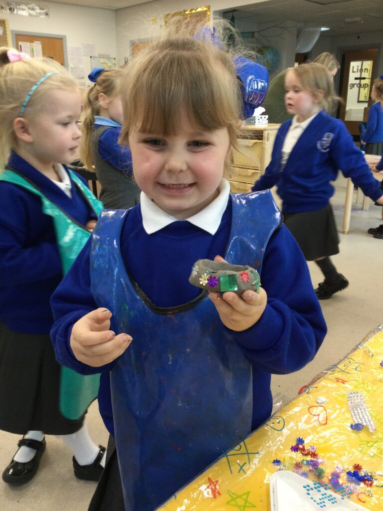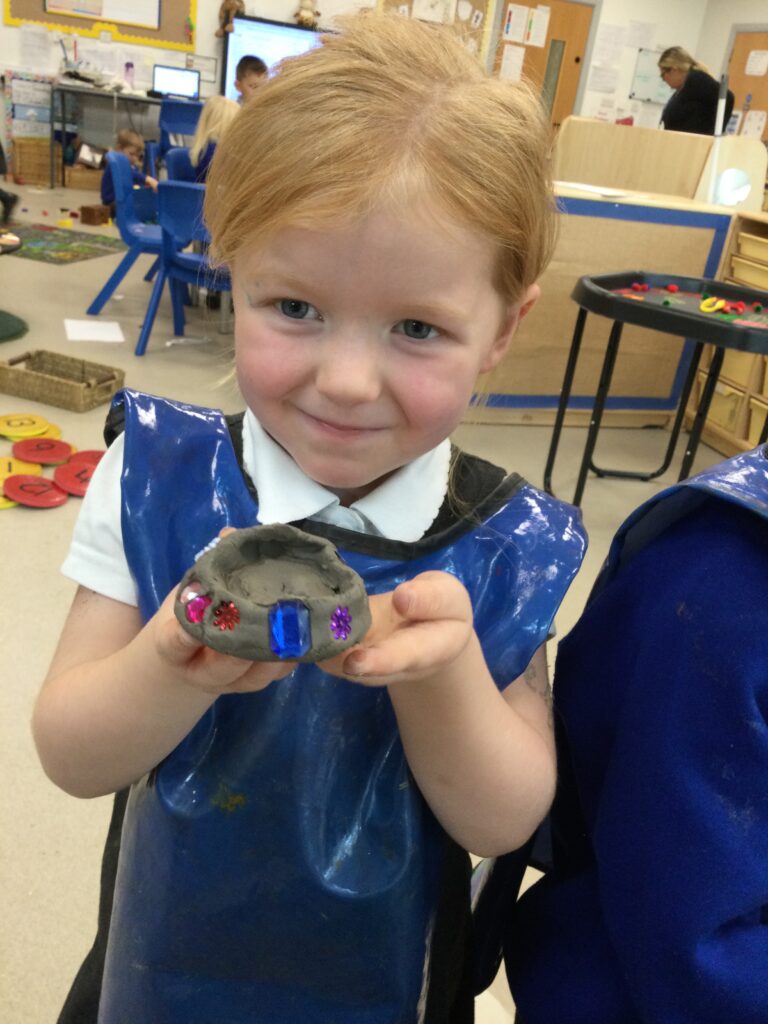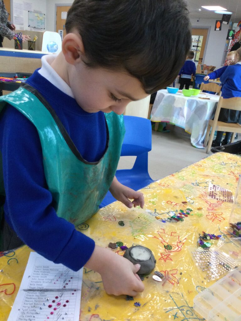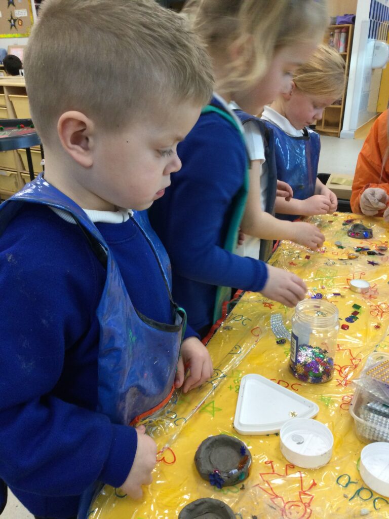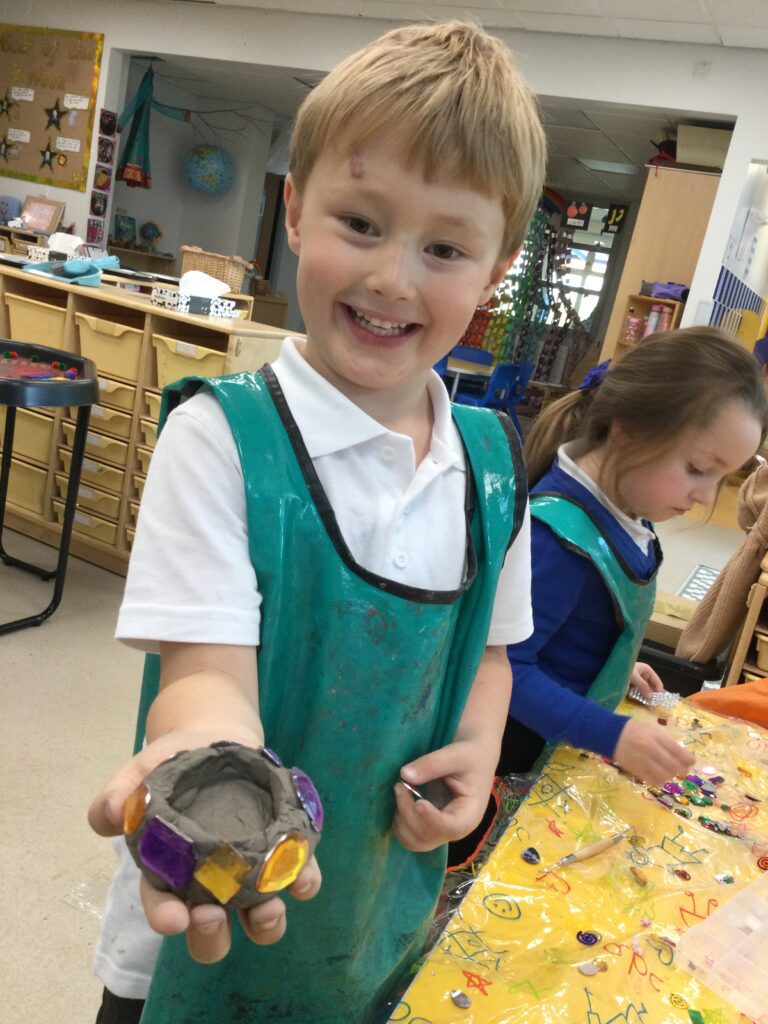 This week in Reception we have been learning all about ‘Diwali’ the festival of light and also Bonfire night. We have been making our very own Rangoli patterns in the glitter sand using tools such as paintbrushes and forks. We have also been making our very own Diya lamps using clay and decorative materials such as beads and sequins. We have been reading stories and watching videos all about the festival and what happens at this special time. We looked at the special clothing wore when celebrating Diwali and the preparation and traditions that Diwali en-tales. We learned about the Gods and Goddesses that Diwali is associated with such as Lakshmi, Rama and Sita.
