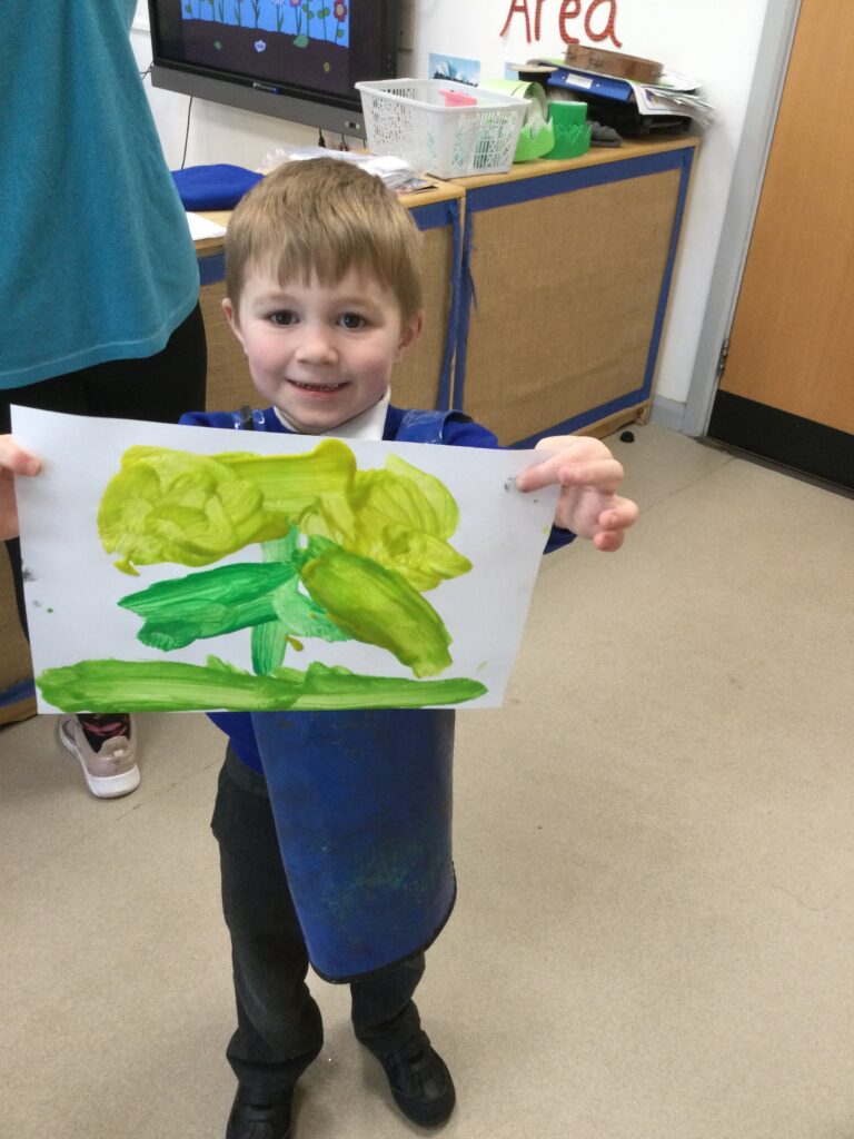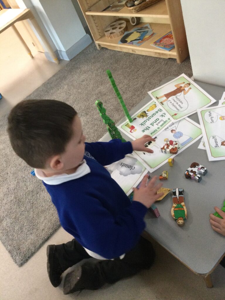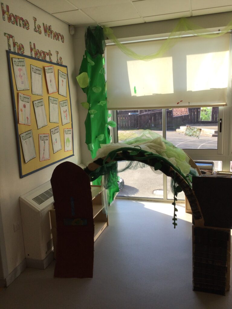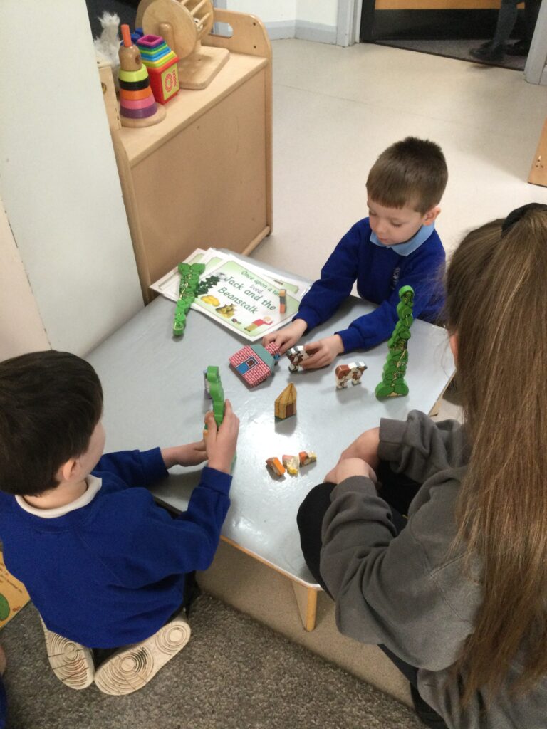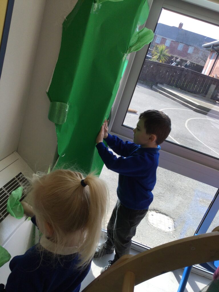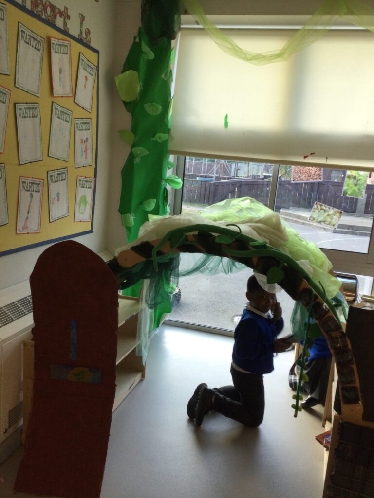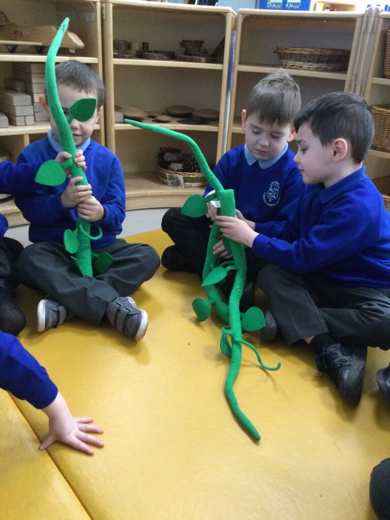 This week in Reception we have been learning all about the traditional tale ‘Jack and the beanstalk’ . We have been using the wooden characters to act out the story and repeat key phrases from the tale. We have turned our role play area into the Giants castle and made our very own beanstalk which we made and put up ourselves. We were very good at using our cutting and drawing skills to make the leaves for the beanstalk. In the tuff tray we explored the soil and different gardening tools, we enjoyed digging the beans out of the soil and exploring the different textures. We also used the story mats to sequence the story into the correct order and retell key events from the tale. We also took part in a singing and dancing activity where we stomped and shouted like the Giant singing ‘Fe Fi Fo Fum’ we were all very good at remembering the actions to the routine and remembering the lyrics.