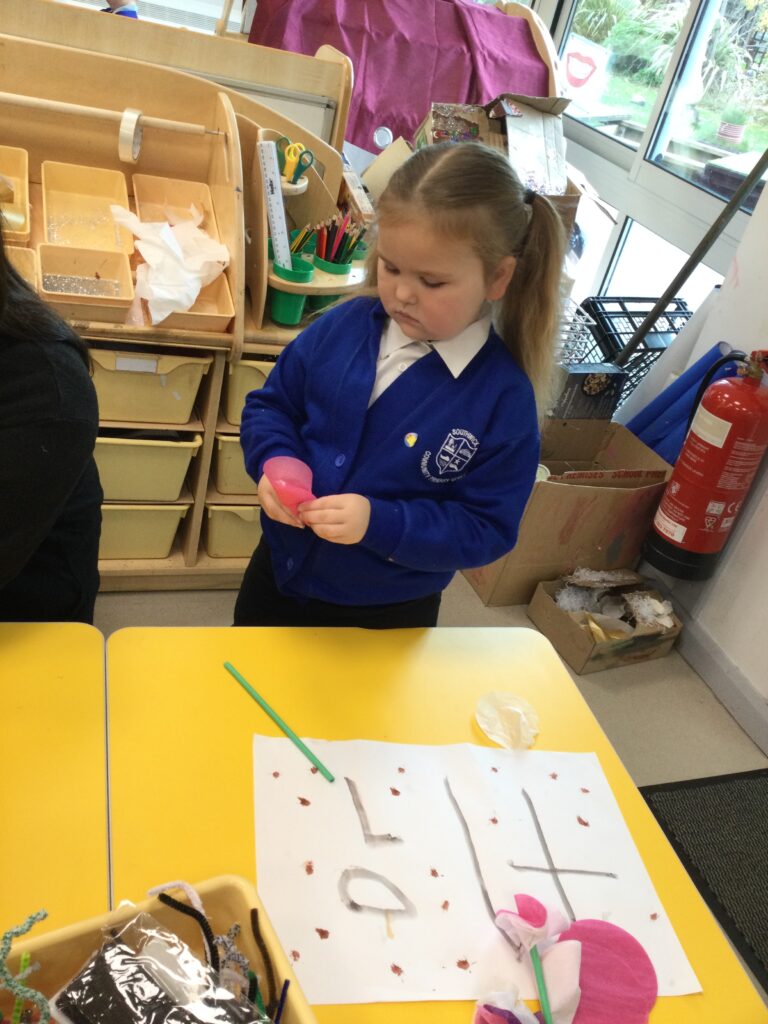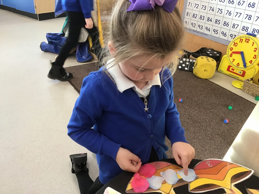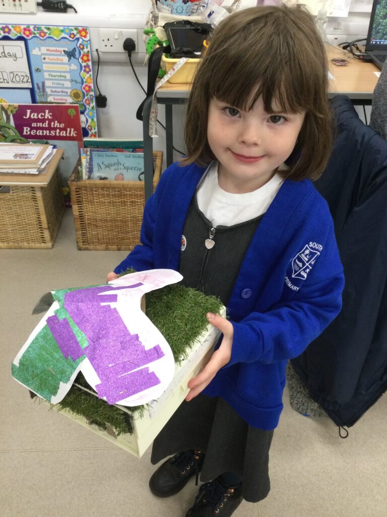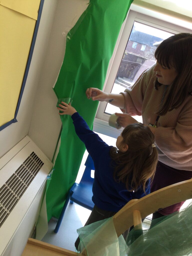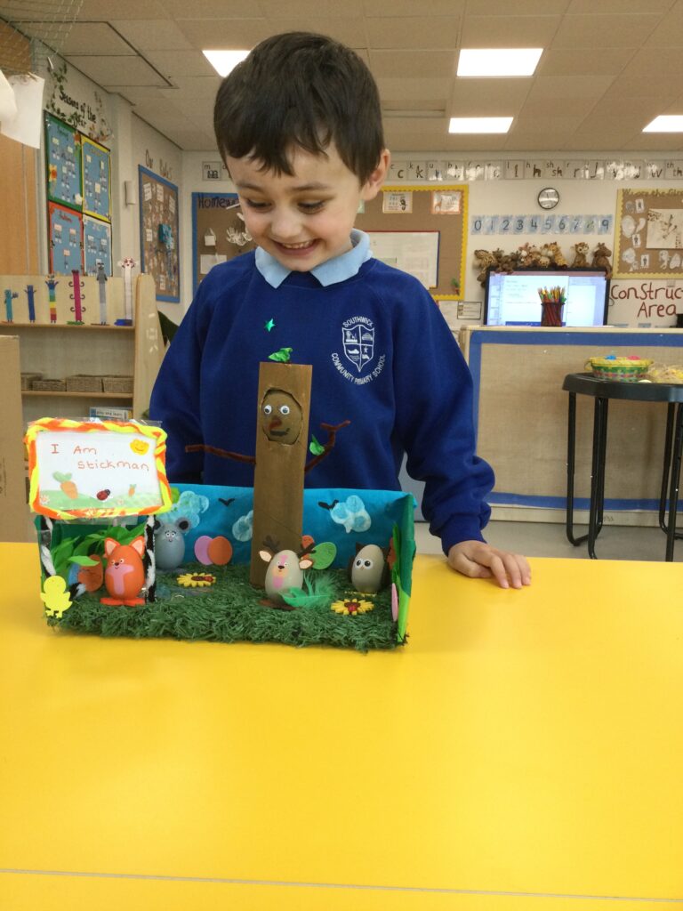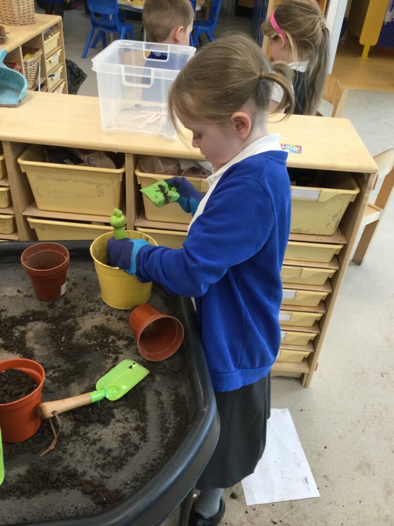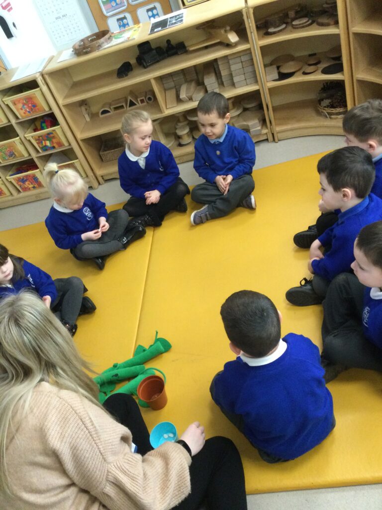 This week in Reception we have been learning all about the traditional tale ‘Jack and the beanstalk’ . We have been using the wooden characters to act out the story and repeat key phrases from the tale. We have turned our role play area into the Giants castle and made our very own beanstalk which we made and put up ourselves. We were very good at using our cutting and drawing skills to make the leaves for the beanstalk. In the tuff tray we explored the soil and different gardening tools, we enjoyed digging the beans out of the soil and exploring the different textures. We also used the story mats to sequence the story into the correct order and retell key events from the tale. We also took part in a singing and dancing activity where we stomped and shouted like the Giant singing ‘Fe Fi Fo Fum’ we were all very good at remembering the actions to the routine and remembering the lyrics.