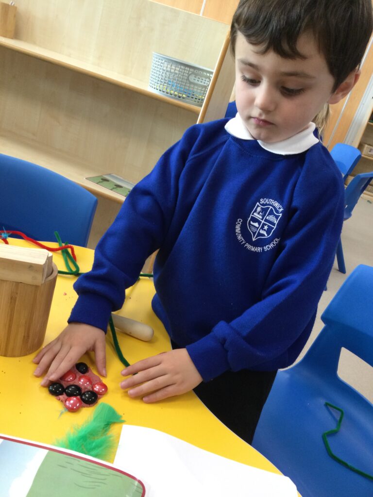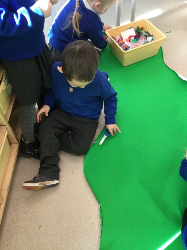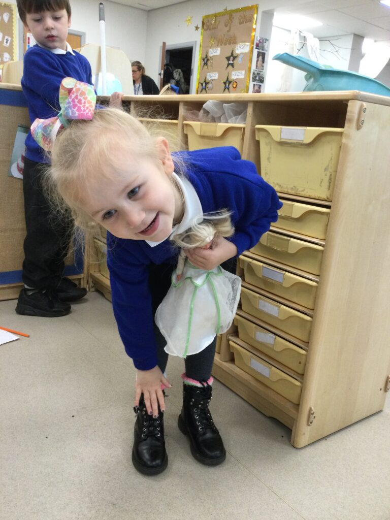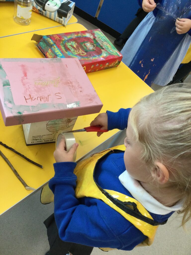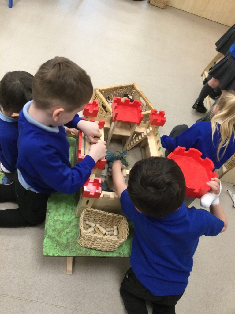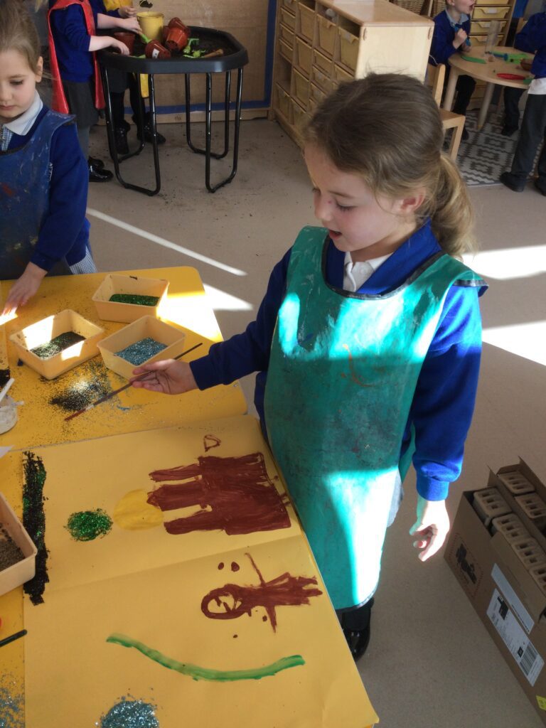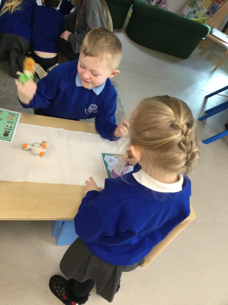 This week in Reception we have been learning all about the traditional tale ‘Jack and the beanstalk’ . We have been using the wooden characters to act out the story and repeat key phrases from the tale. We have turned our role play area into the Giants castle and made our very own beanstalk which we made and put up ourselves. We were very good at using our cutting and drawing skills to make the leaves for the beanstalk. In the tuff tray we explored the soil and different gardening tools, we enjoyed digging the beans out of the soil and exploring the different textures. We also used the story mats to sequence the story into the correct order and retell key events from the tale. We also took part in a singing and dancing activity where we stomped and shouted like the Giant singing ‘Fe Fi Fo Fum’ we were all very good at remembering the actions to the routine and remembering the lyrics.