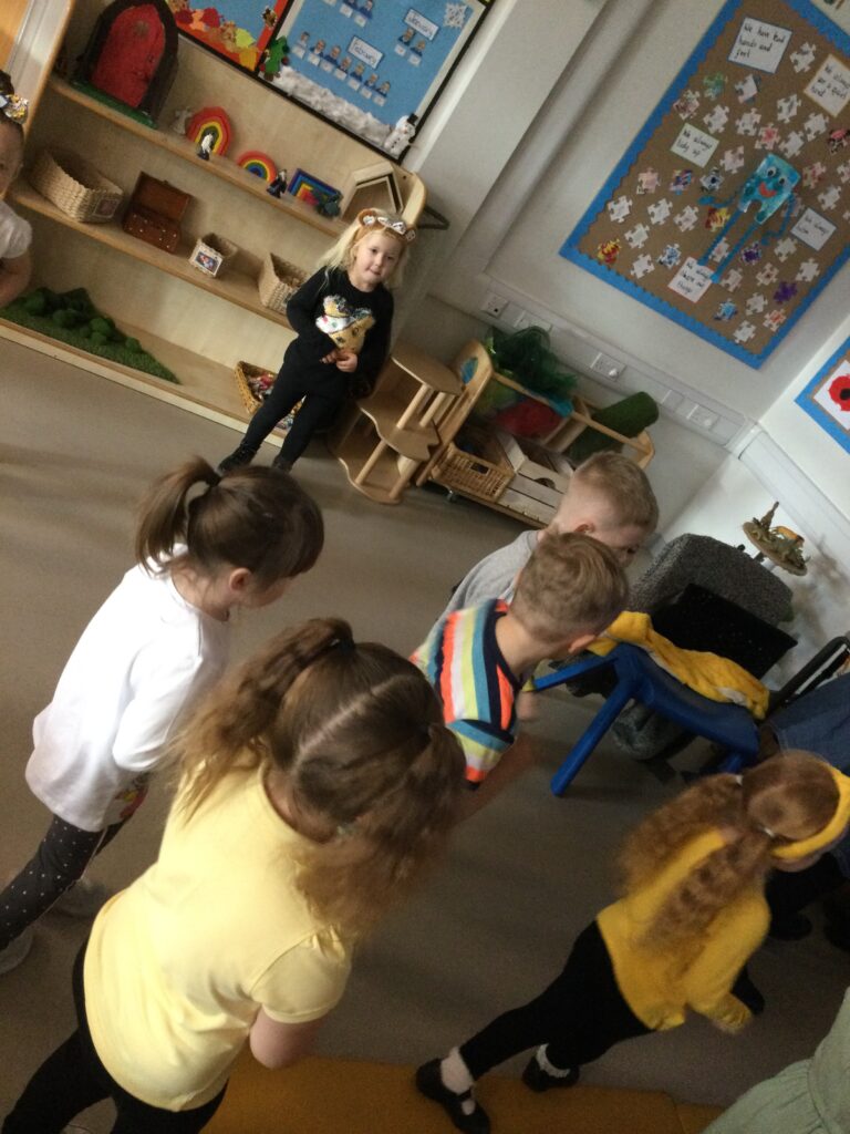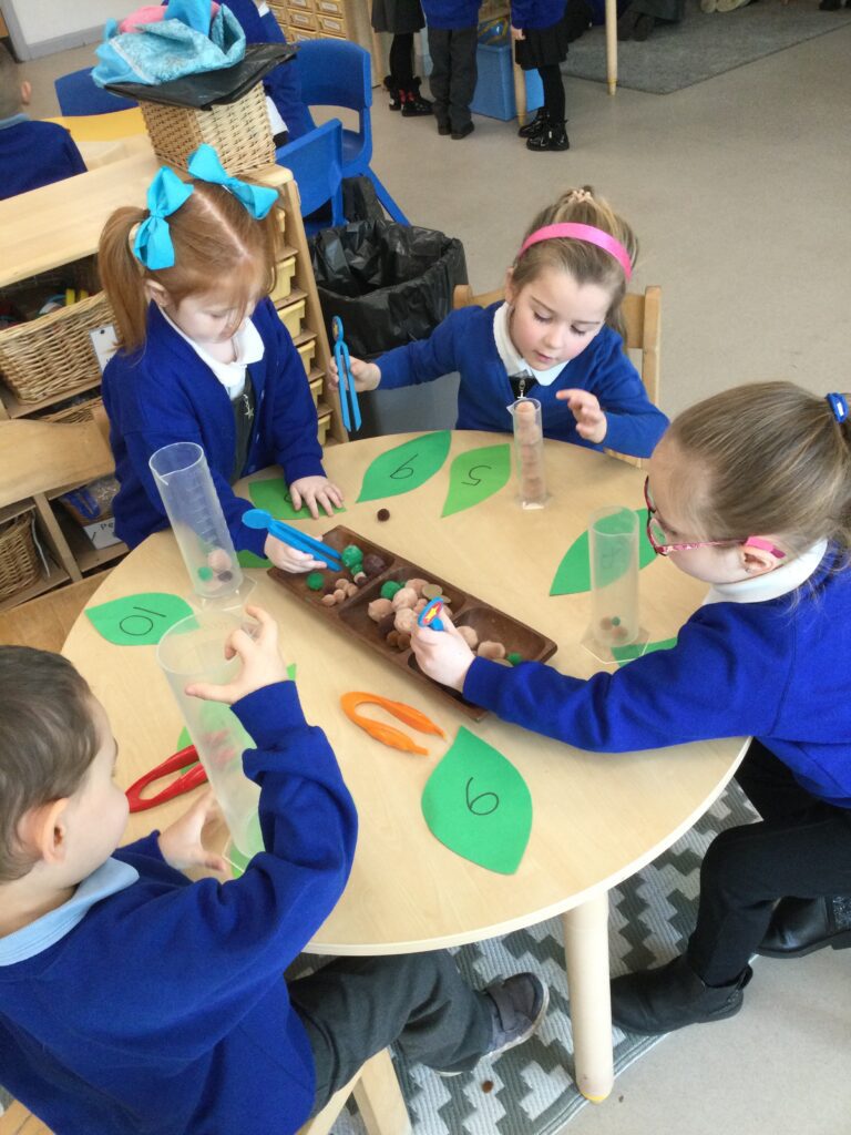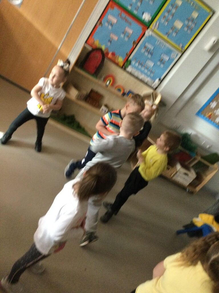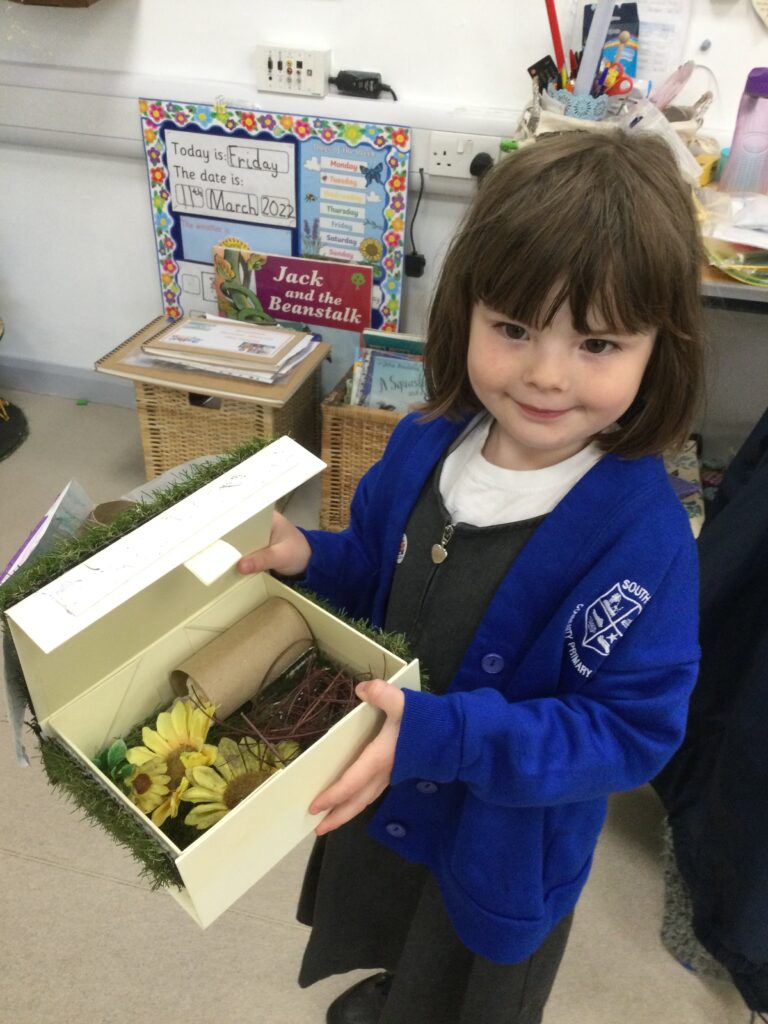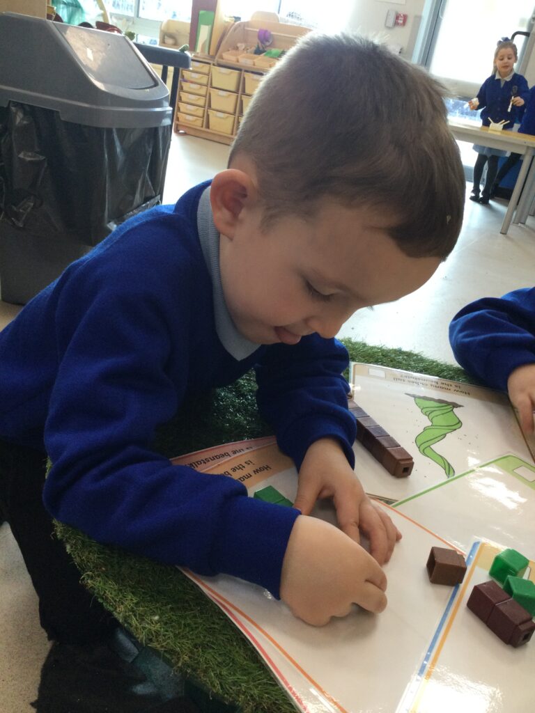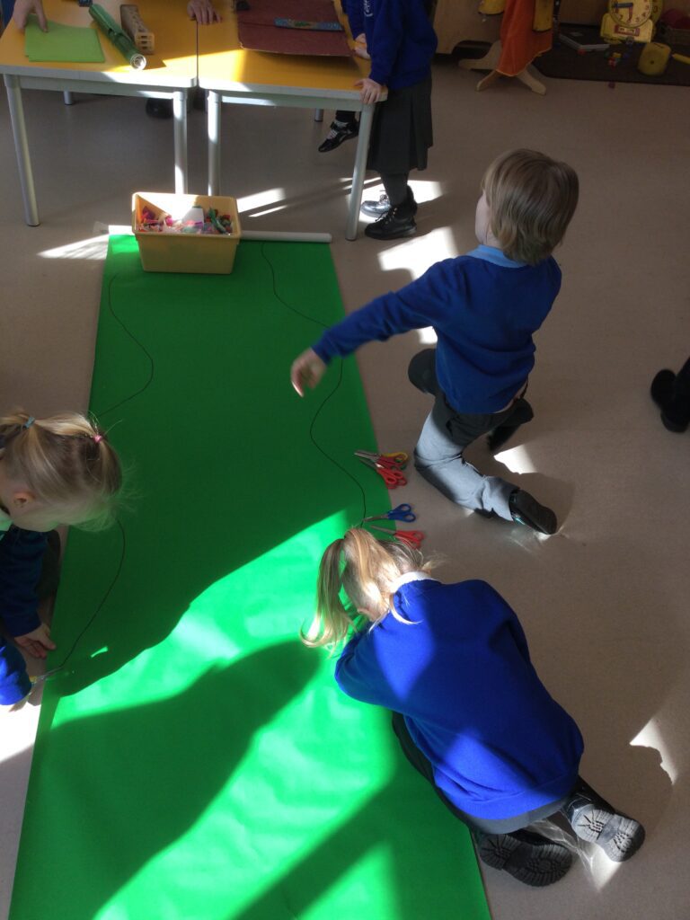 This week in Reception we have been learning all about the traditional tale ‘Jack and the beanstalk’ . We have been using the wooden characters to act out the story and repeat key phrases from the tale. We have turned our role play area into the Giants castle and made our very own beanstalk which we made and put up ourselves. We were very good at using our cutting and drawing skills to make the leaves for the beanstalk. In the tuff tray we explored the soil and different gardening tools, we enjoyed digging the beans out of the soil and exploring the different textures. We also used the story mats to sequence the story into the correct order and retell key events from the tale. We also took part in a singing and dancing activity where we stomped and shouted like the Giant singing ‘Fe Fi Fo Fum’ we were all very good at remembering the actions to the routine and remembering the lyrics.