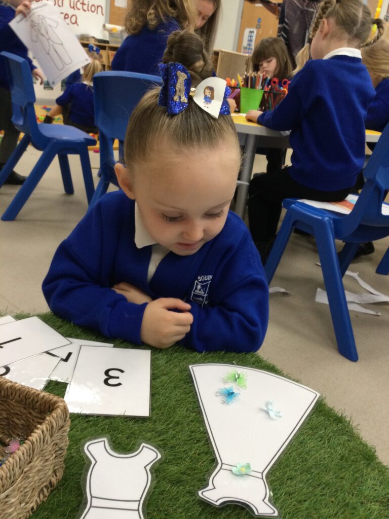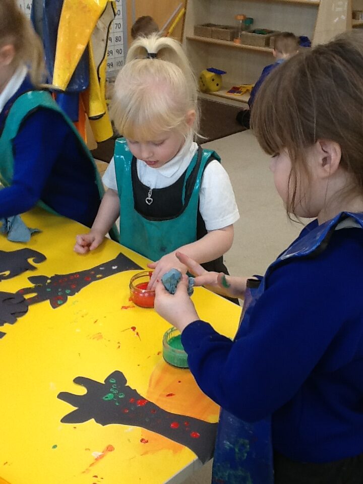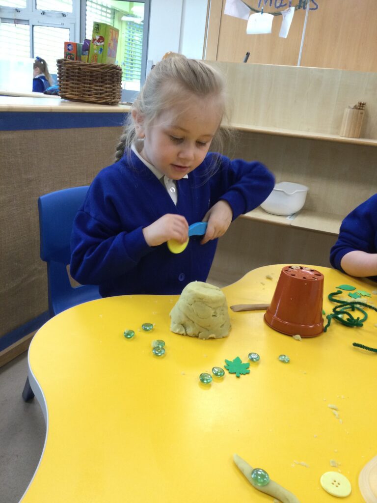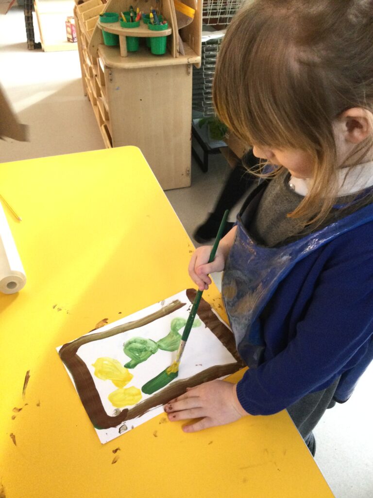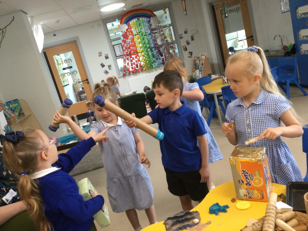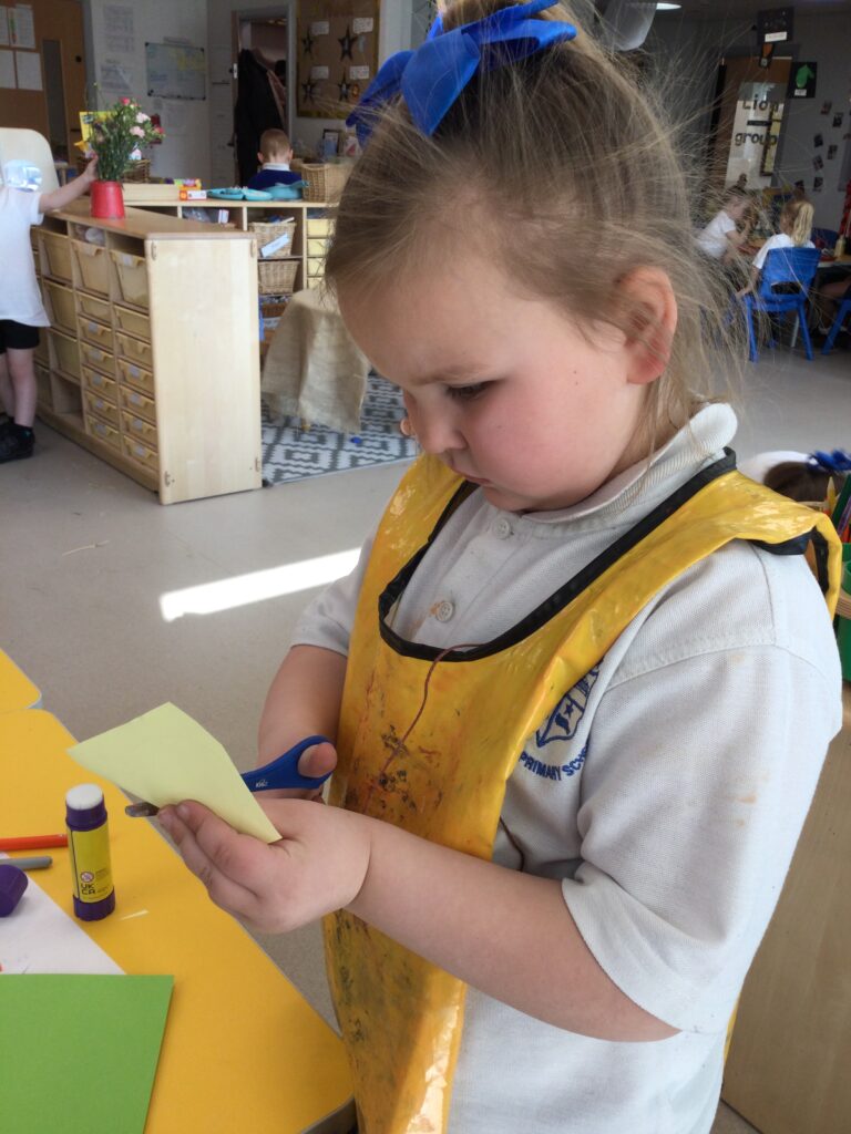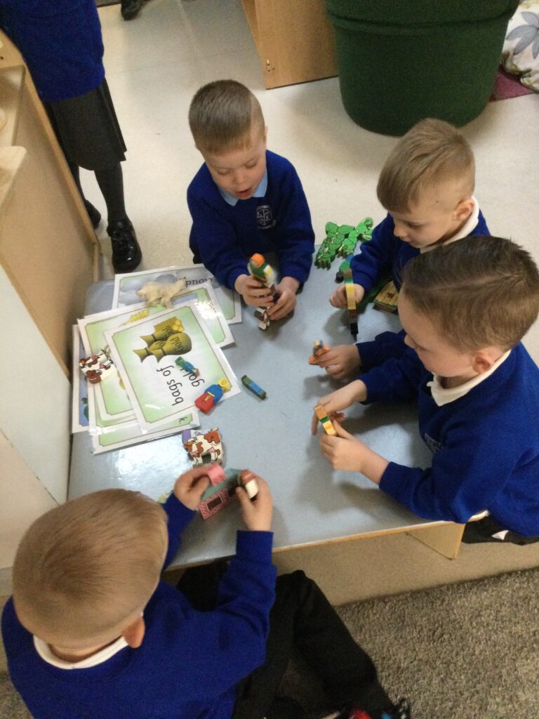 This week in Reception we have been learning all about the traditional tale ‘Jack and the beanstalk’ . We have been using the wooden characters to act out the story and repeat key phrases from the tale. We have turned our role play area into the Giants castle and made our very own beanstalk which we made and put up ourselves. We were very good at using our cutting and drawing skills to make the leaves for the beanstalk. In the tuff tray we explored the soil and different gardening tools, we enjoyed digging the beans out of the soil and exploring the different textures. We also used the story mats to sequence the story into the correct order and retell key events from the tale. We also took part in a singing and dancing activity where we stomped and shouted like the Giant singing ‘Fe Fi Fo Fum’ we were all very good at remembering the actions to the routine and remembering the lyrics.