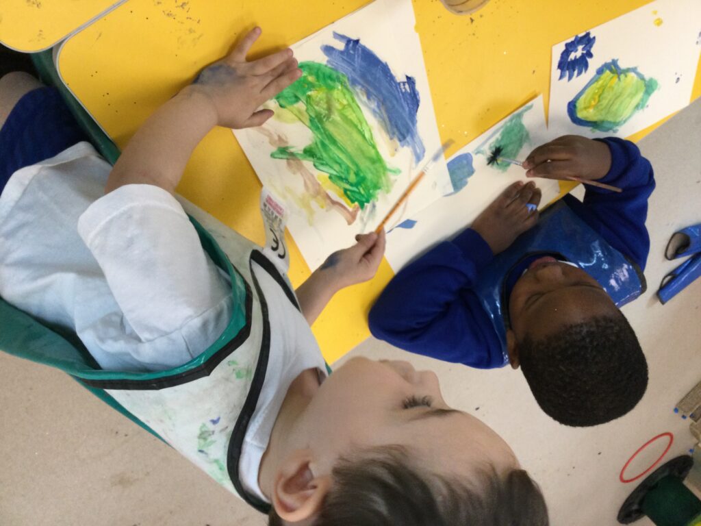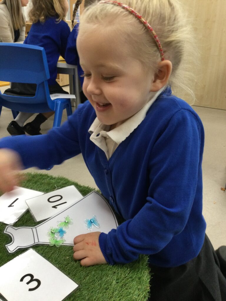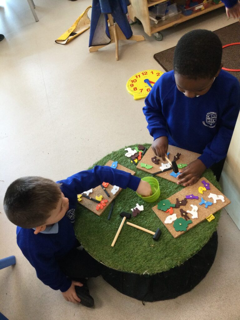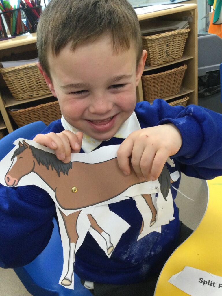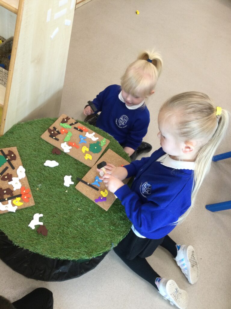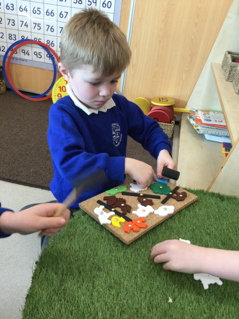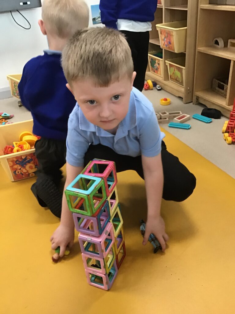 This week in Reception we have been learning all about the traditional tale ‘Jack and the beanstalk’ . We have been using the wooden characters to act out the story and repeat key phrases from the tale. We have turned our role play area into the Giants castle and made our very own beanstalk which we made and put up ourselves. We were very good at using our cutting and drawing skills to make the leaves for the beanstalk. In the tuff tray we explored the soil and different gardening tools, we enjoyed digging the beans out of the soil and exploring the different textures. We also used the story mats to sequence the story into the correct order and retell key events from the tale. We also took part in a singing and dancing activity where we stomped and shouted like the Giant singing ‘Fe Fi Fo Fum’ we were all very good at remembering the actions to the routine and remembering the lyrics.