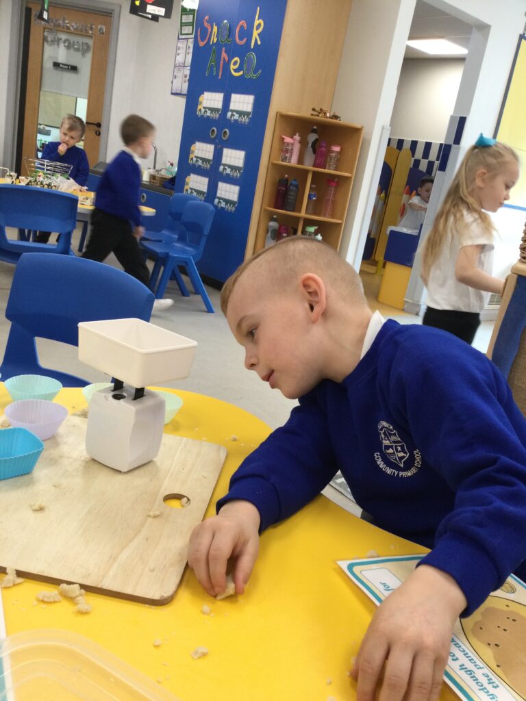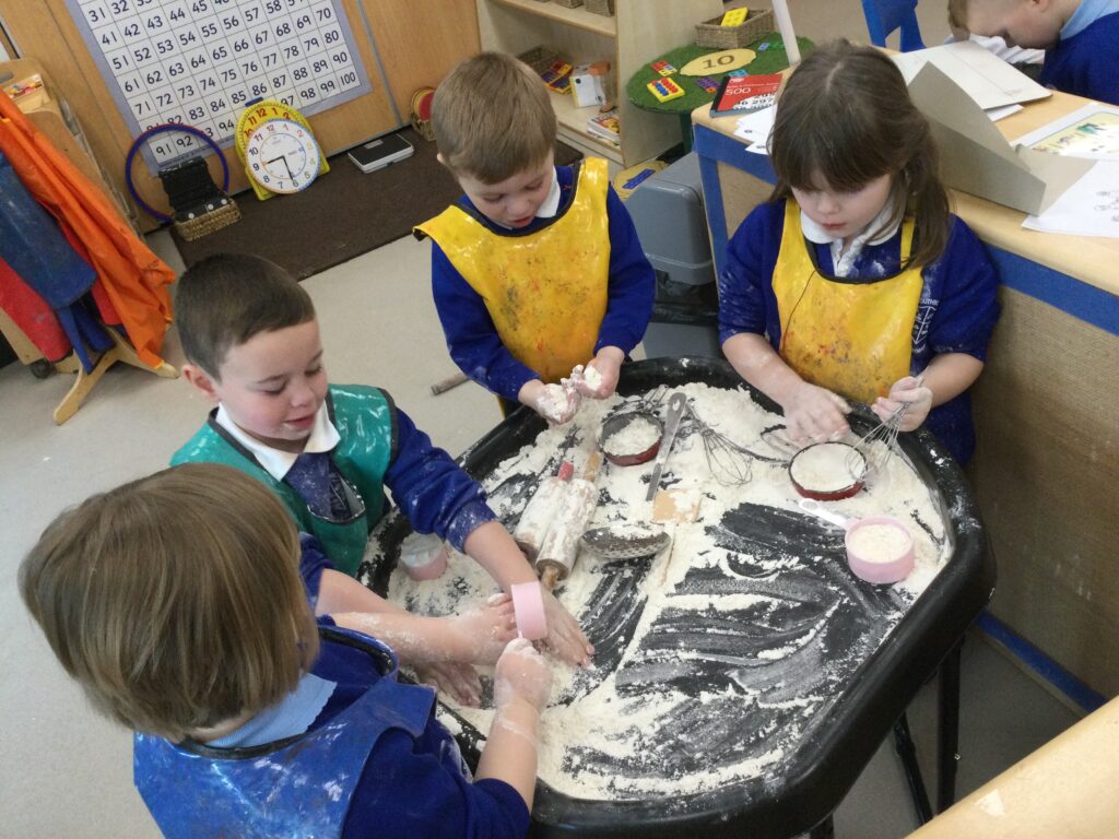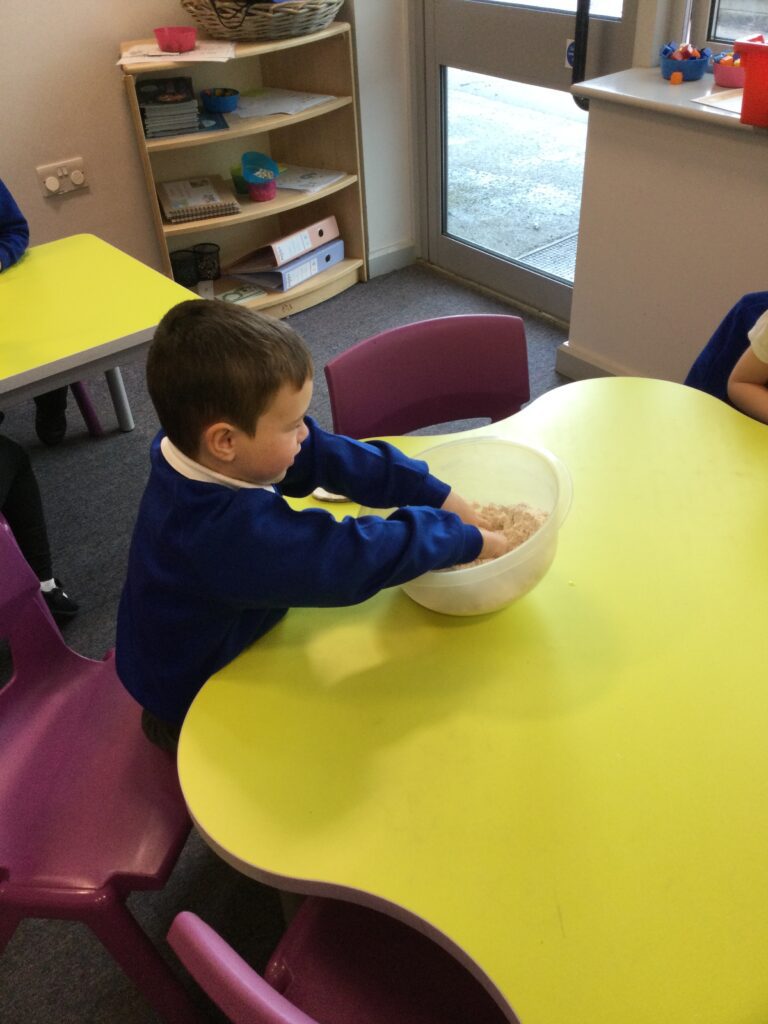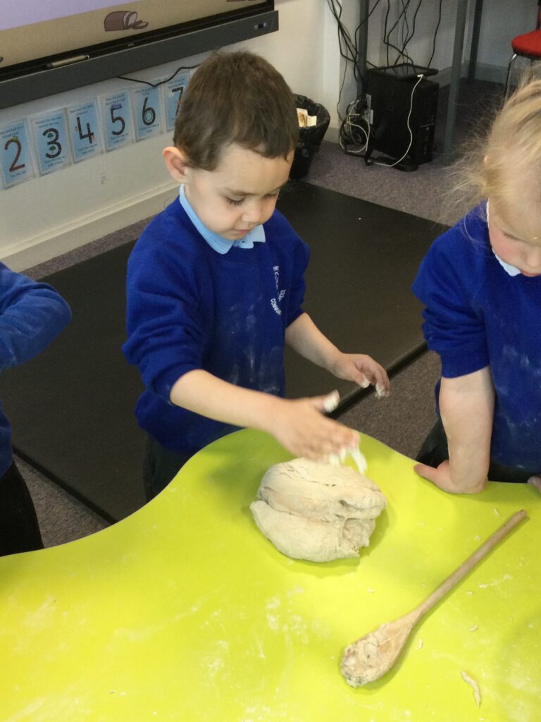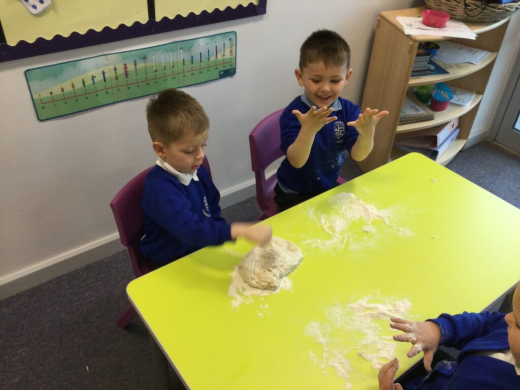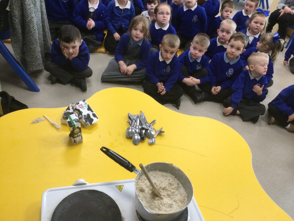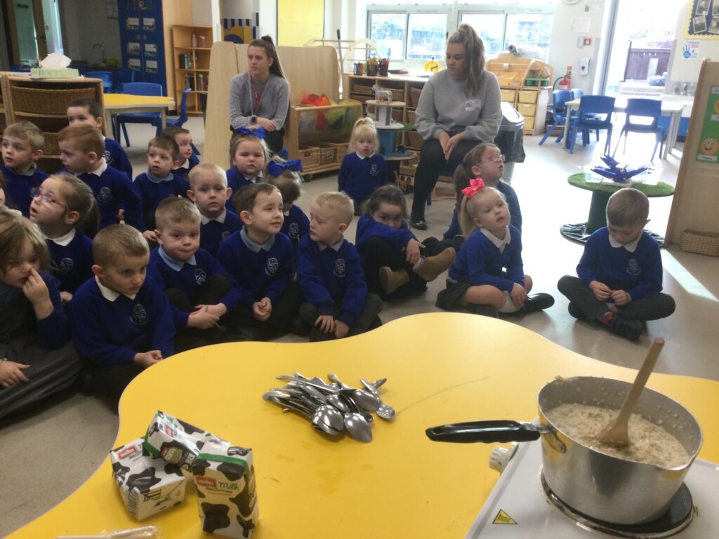 In Reception we have been learning all about the traditional tale ”The Magic porridge pot’ we have been reading the story then completing work and activities all around the tale. We made and taste tested our own porridge. We used our home corner to act out the story using props such as pots and spoons to repeat phrases from the tale. We have also been practicing our number and letter formation in the porridge oats tough tray using the paintbrushes to write them. In the playdough area we made and played with the porridge playdough and used bowls and spoons to serve our friends porridge.