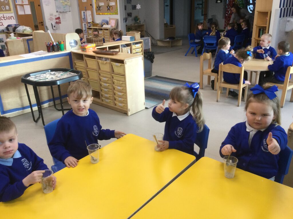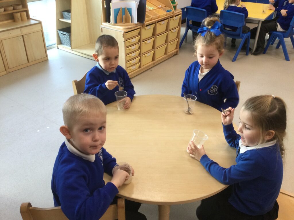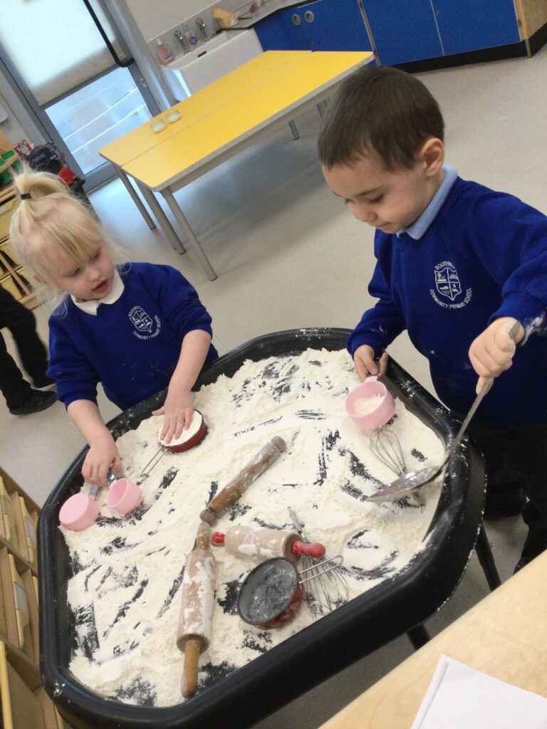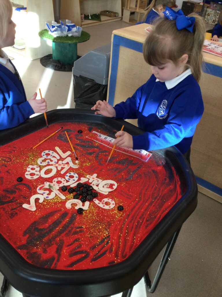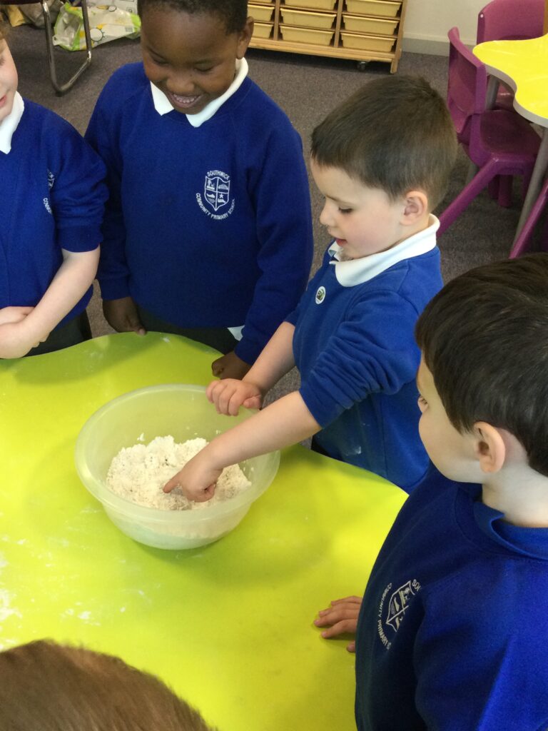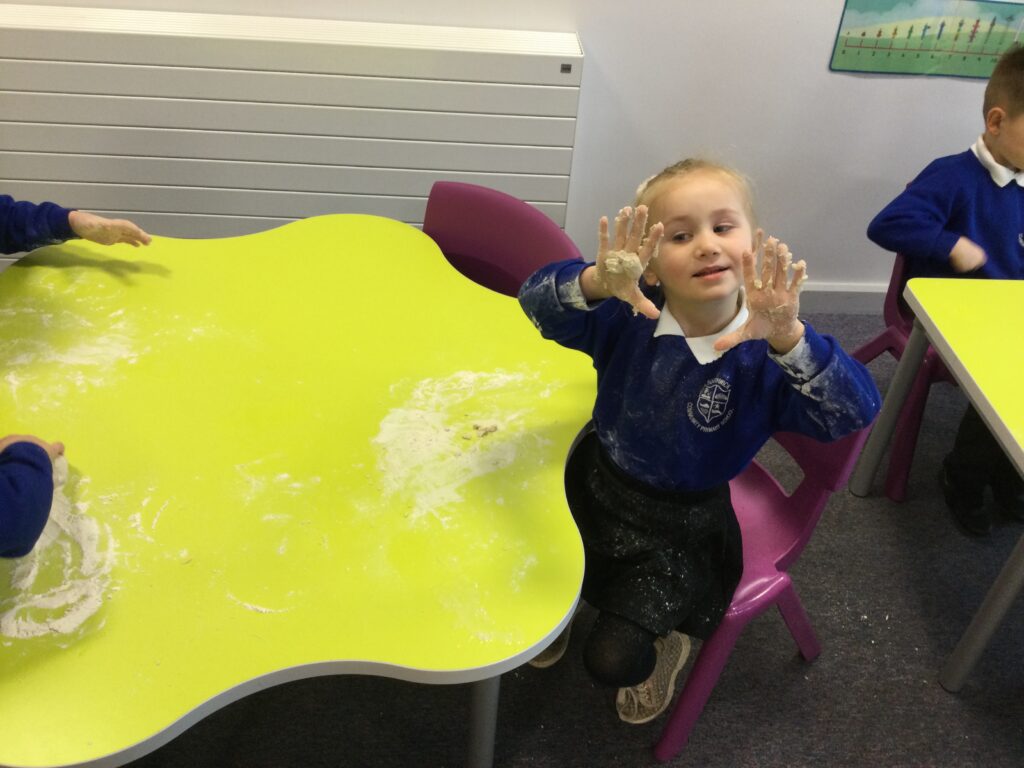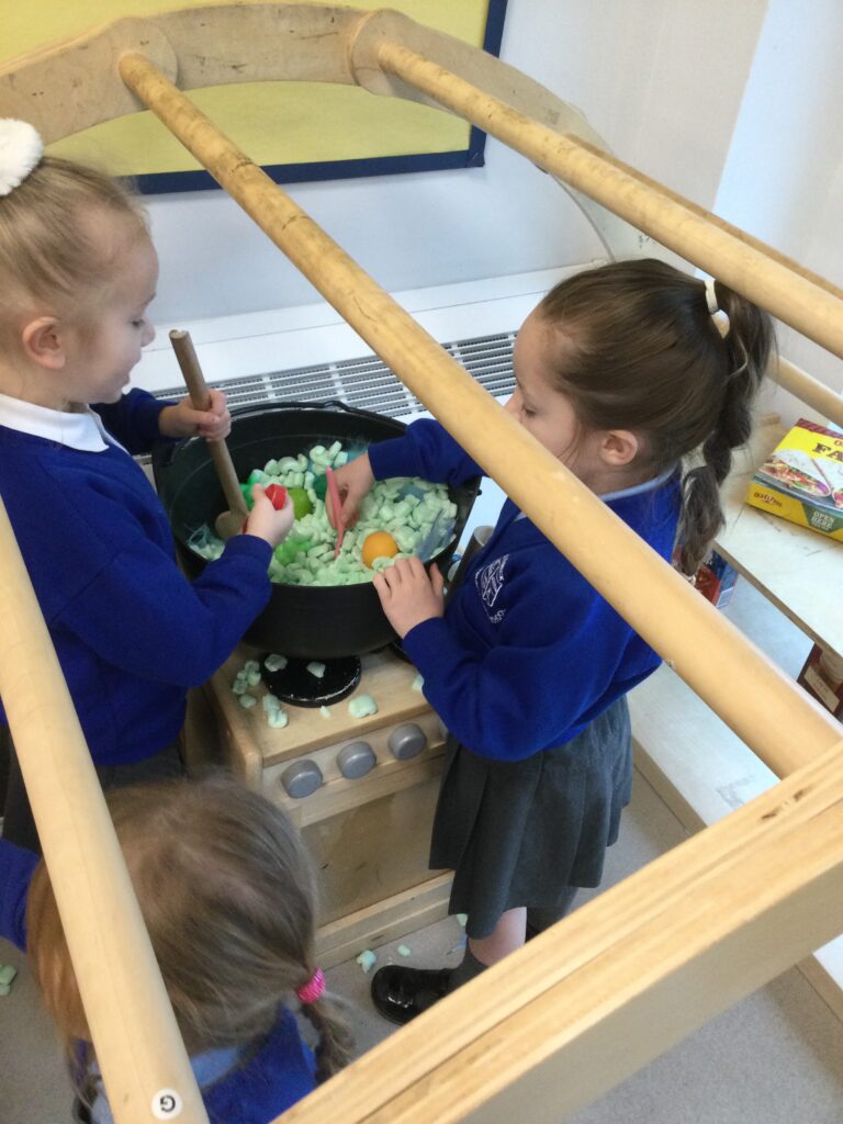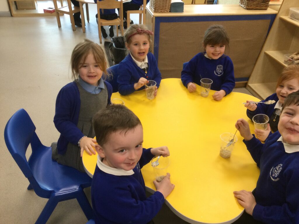 In Reception we have been learning all about the traditional tale ”The Magic porridge pot’ we have been reading the story then completing work and activities all around the tale. We made and taste tested our own porridge. We used our home corner to act out the story using props such as pots and spoons to repeat phrases from the tale. We have also been practicing our number and letter formation in the porridge oats tough tray using the paintbrushes to write them. In the playdough area we made and played with the porridge playdough and used bowls and spoons to serve our friends porridge.
