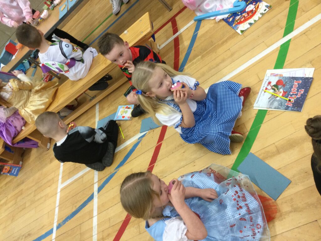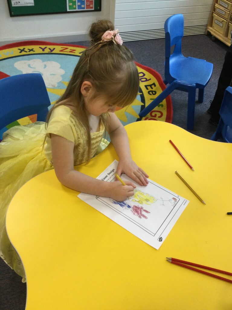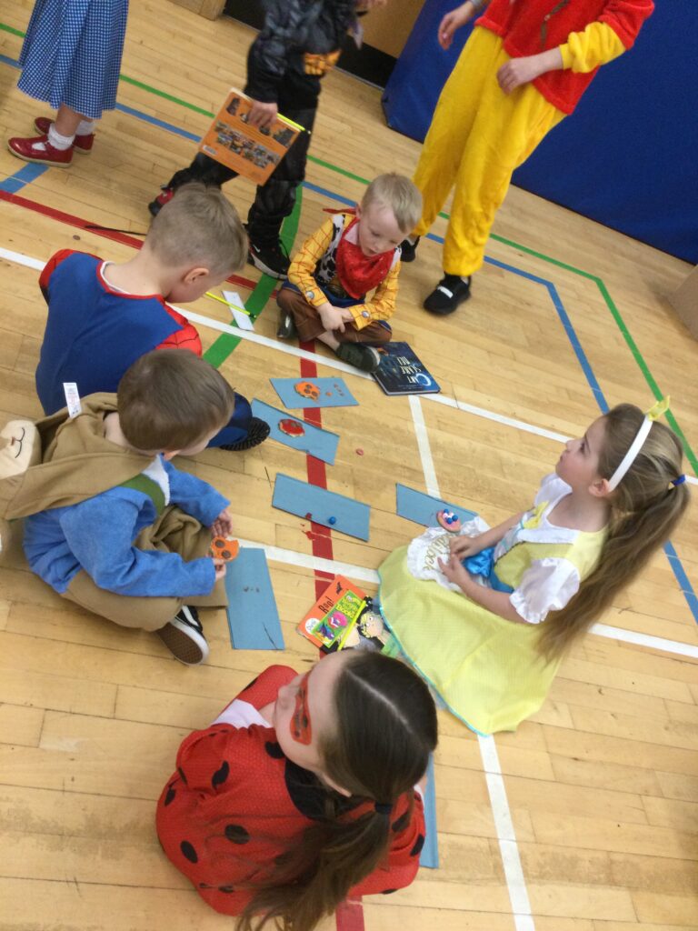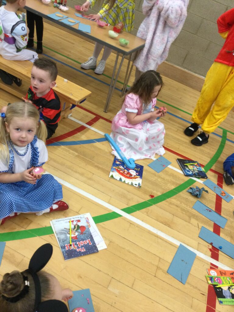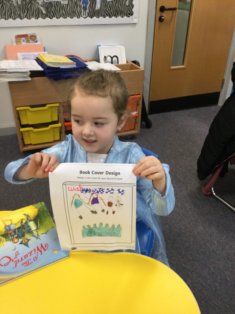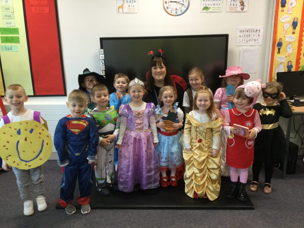 In Reception for World book day we dressed up as a character from our favourite story and brought the book into school to show our friends. Throughout the day we took part in different activities such as drawing and labelling the character we came dressed as, making our own book marks and taking part in story sessions throughout the day. We also read with the year six children, who we very much enjoy spending time with . We went up to the sports hall where there was a ‘world book day fayre’ at the fayre we made and decorated our own biscuits to eat whilst reading books we purchased in the reading den.