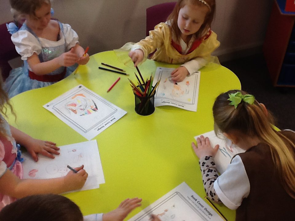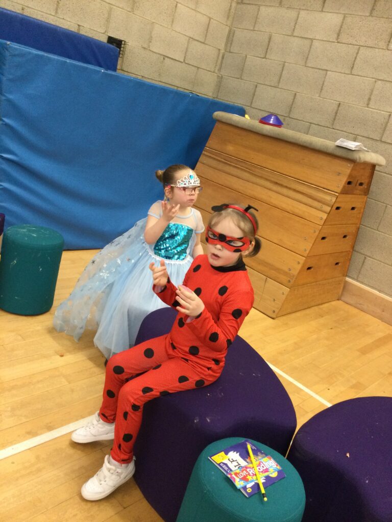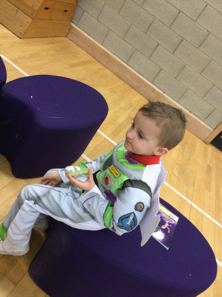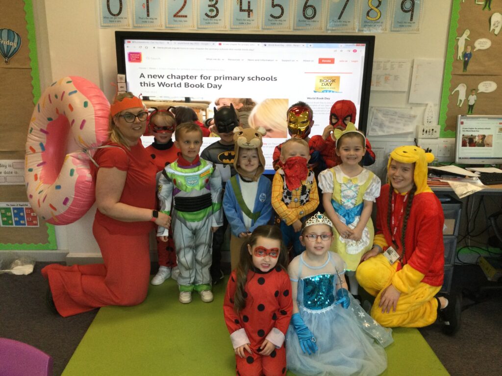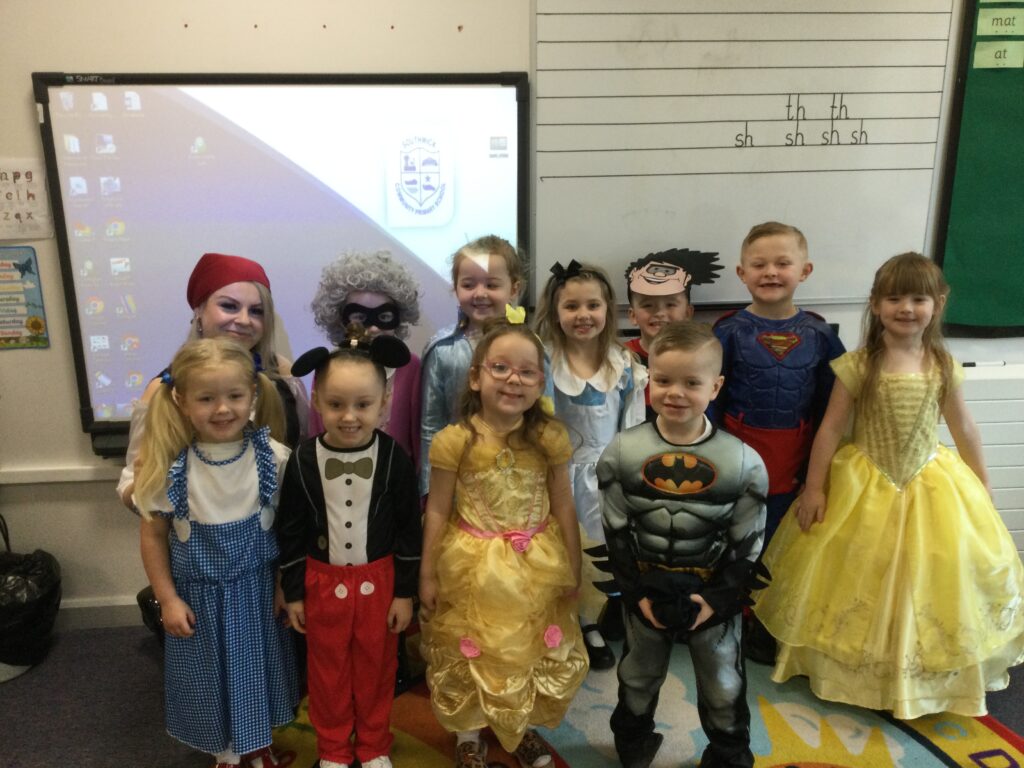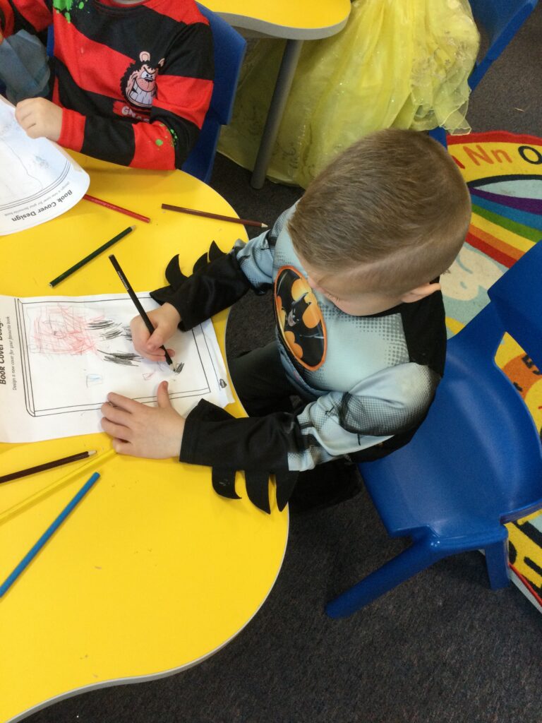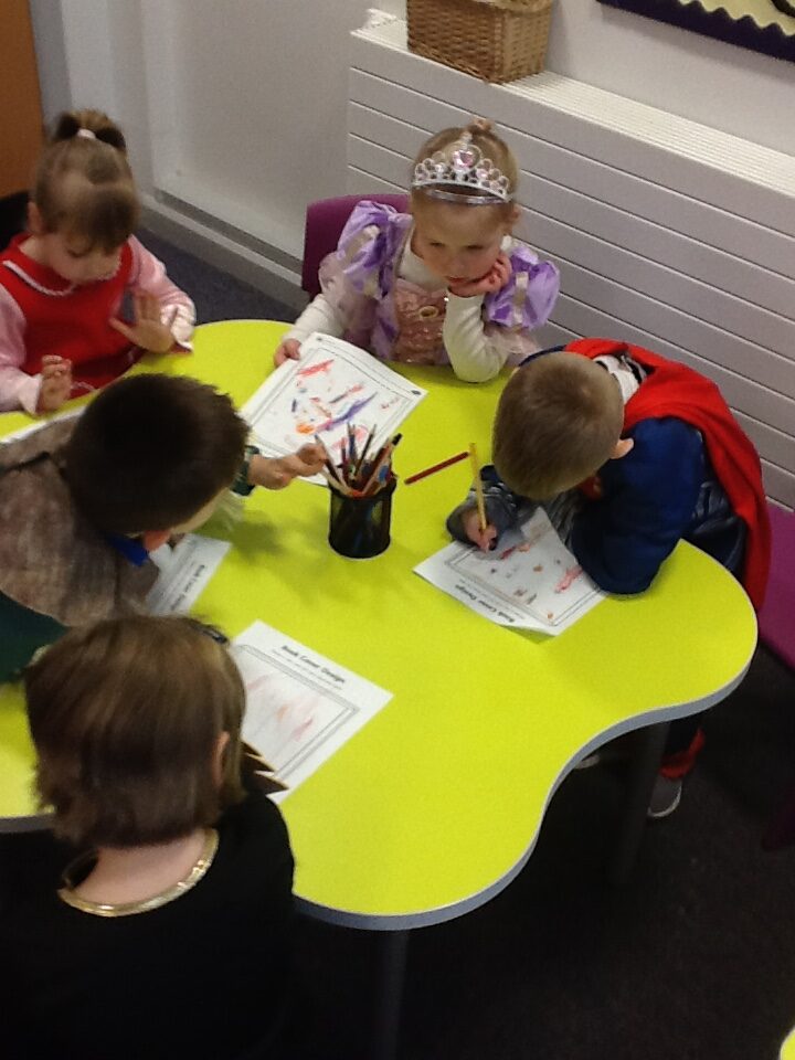 In Reception for World book day we dressed up as a character from our favourite story and brought the book into school to show our friends. Throughout the day we took part in different activities such as drawing and labelling the character we came dressed as, making our own book marks and taking part in story sessions throughout the day. We also read with the year six children, who we very much enjoy spending time with . We went up to the sports hall where there was a ‘world book day fayre’ at the fayre we made and decorated our own biscuits to eat whilst reading books we purchased in the reading den.