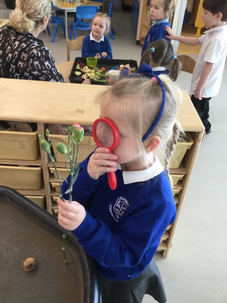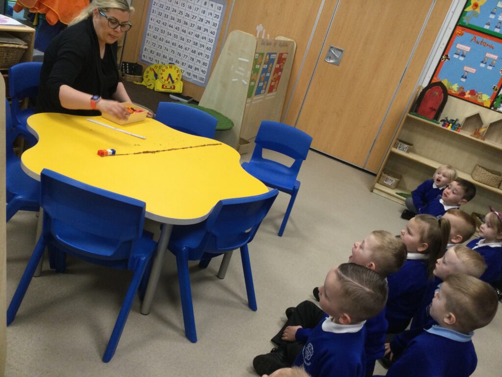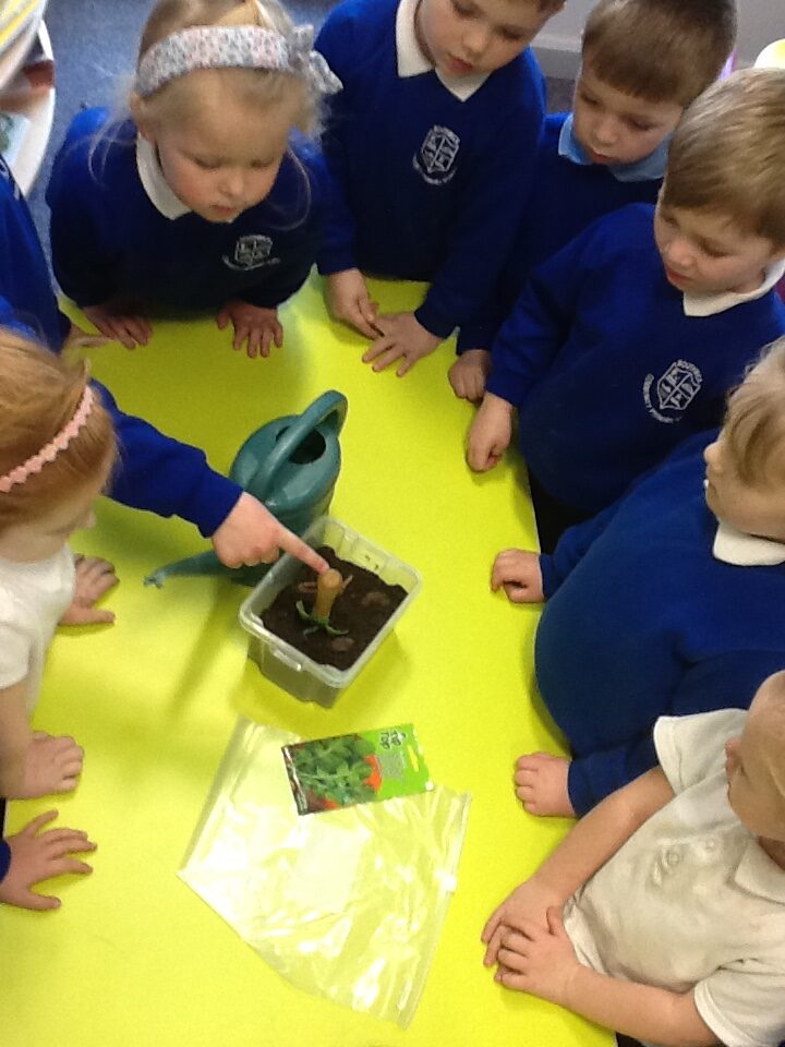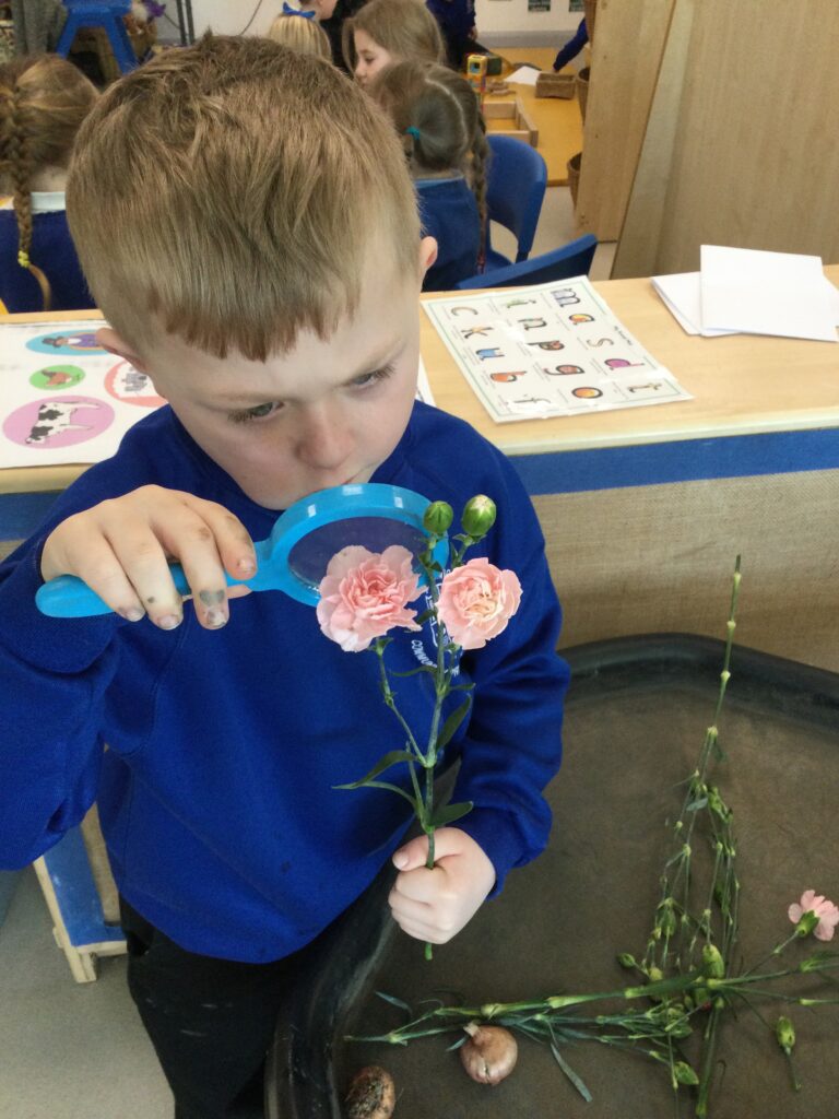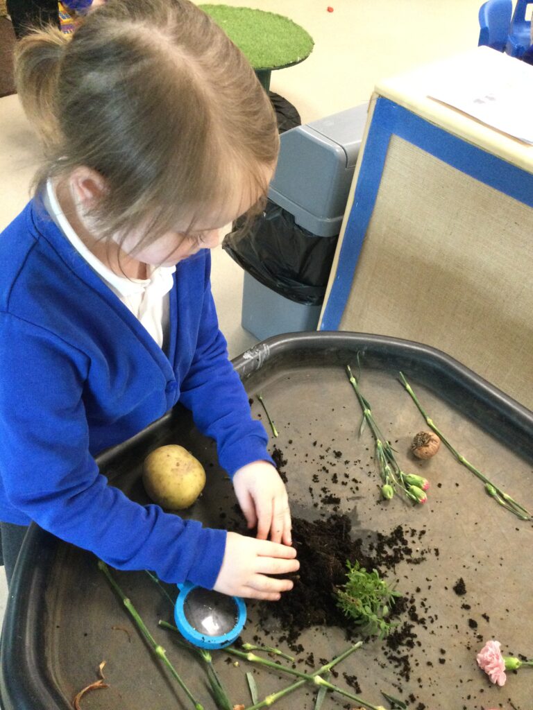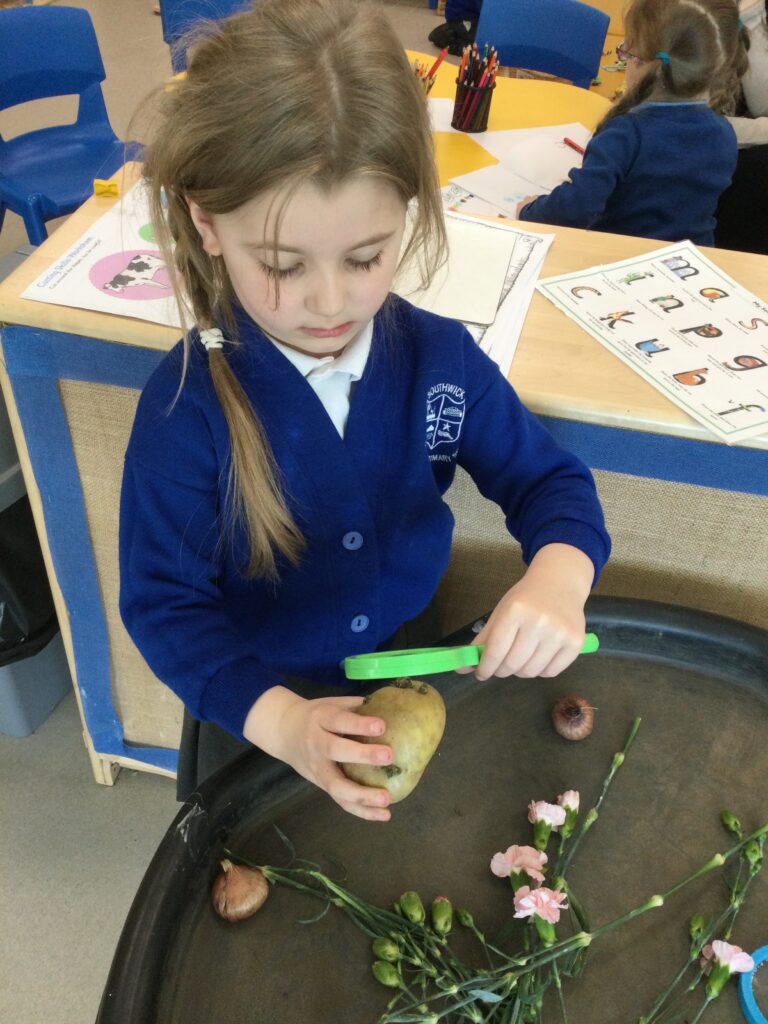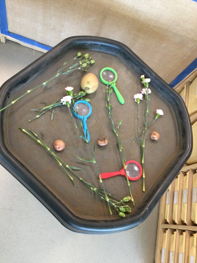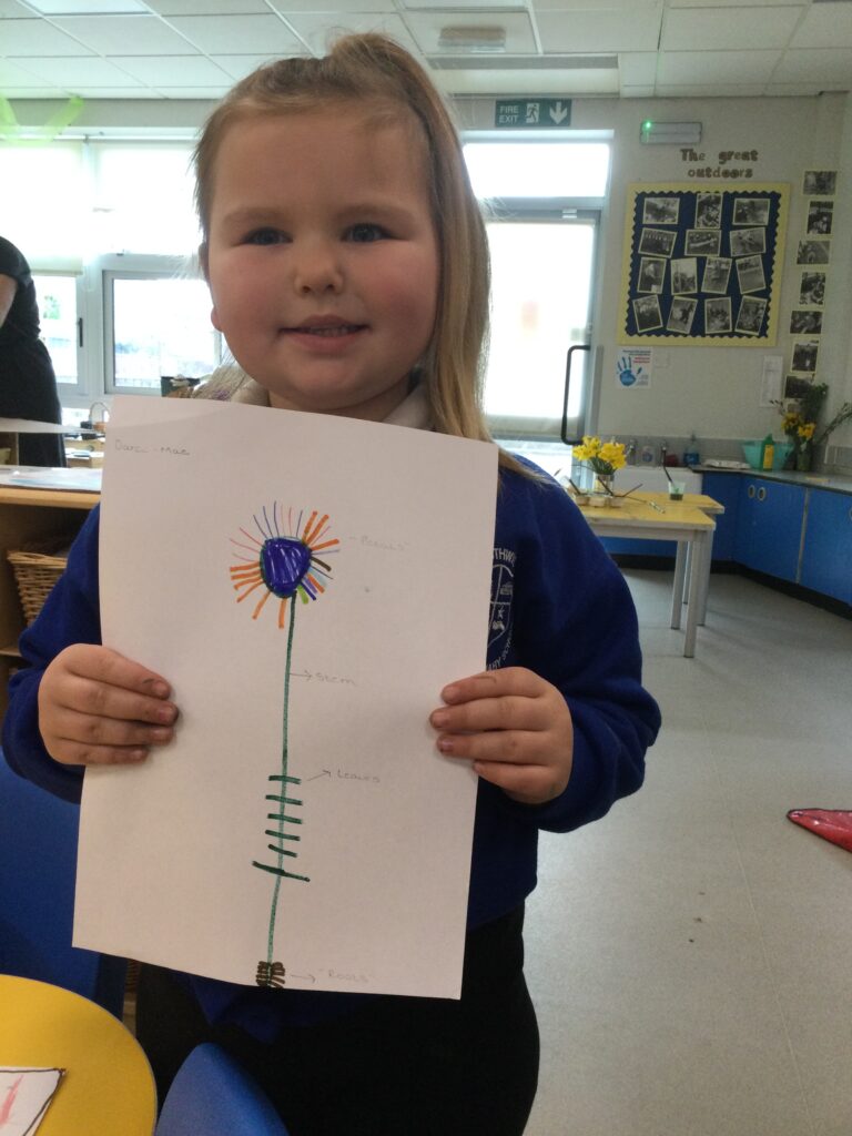 This week has been Science week where we have been learning all about growth. We took part in a whole school activity where we had to stretch playdough as far as we could and measured its length using unit cubes as a non standard measure. We also took part in a whole group activity where we had to stretch a curly whurly chocolate bar and compete against the other year groups to see who stretched it the furthest. We looked at and labelled the different parts of the flower and also learned about the life cycle of a flower. We did observational paintings and drawings of various flowers. We also investigated the inside of different fruits and used our fine motor skills to remove the seeds from within. We did some planting outdoors in our gardening area aswell as inside including an experiment where we looked at how plants survive in different conditions. In the tuff tray we explored the roots of the flower and different vegetables and bulbs.