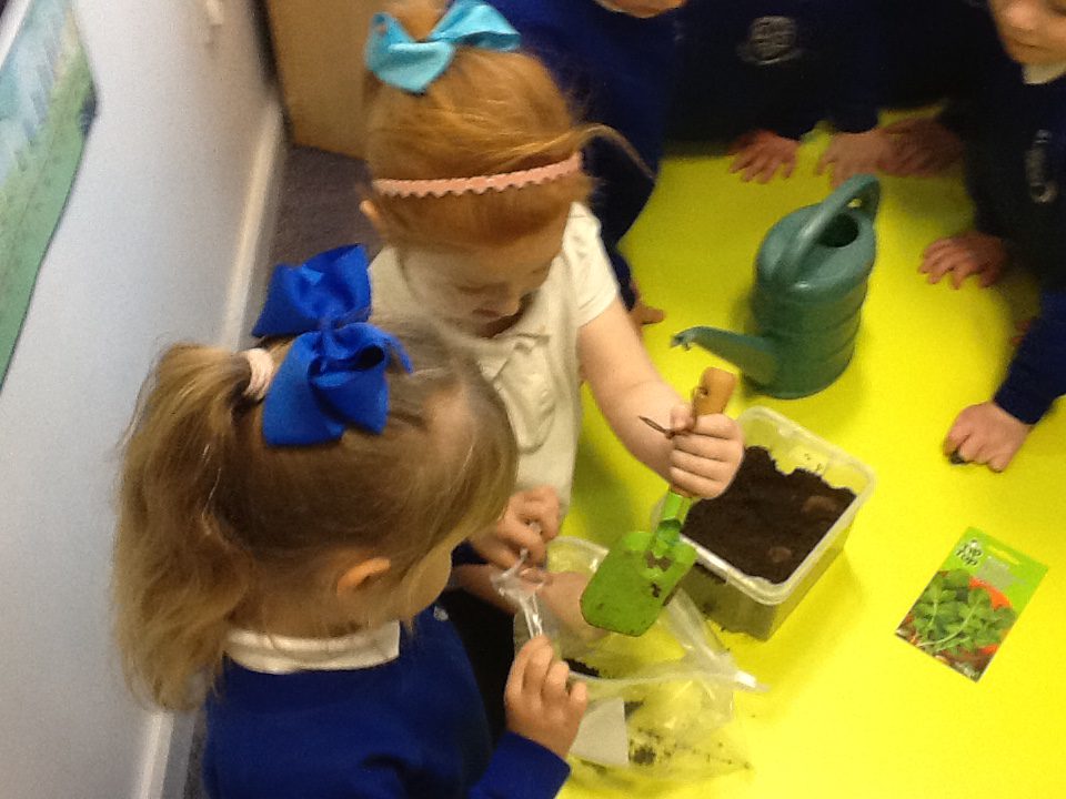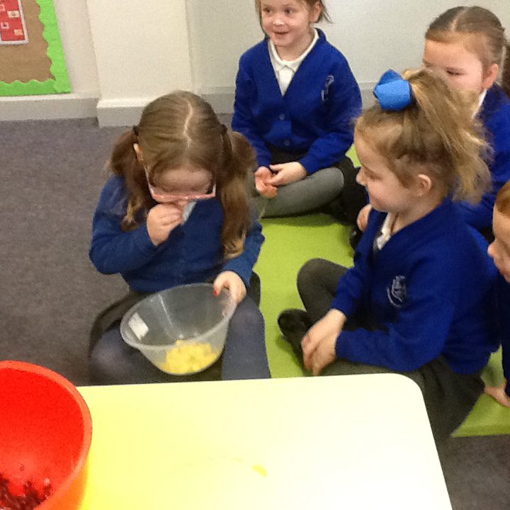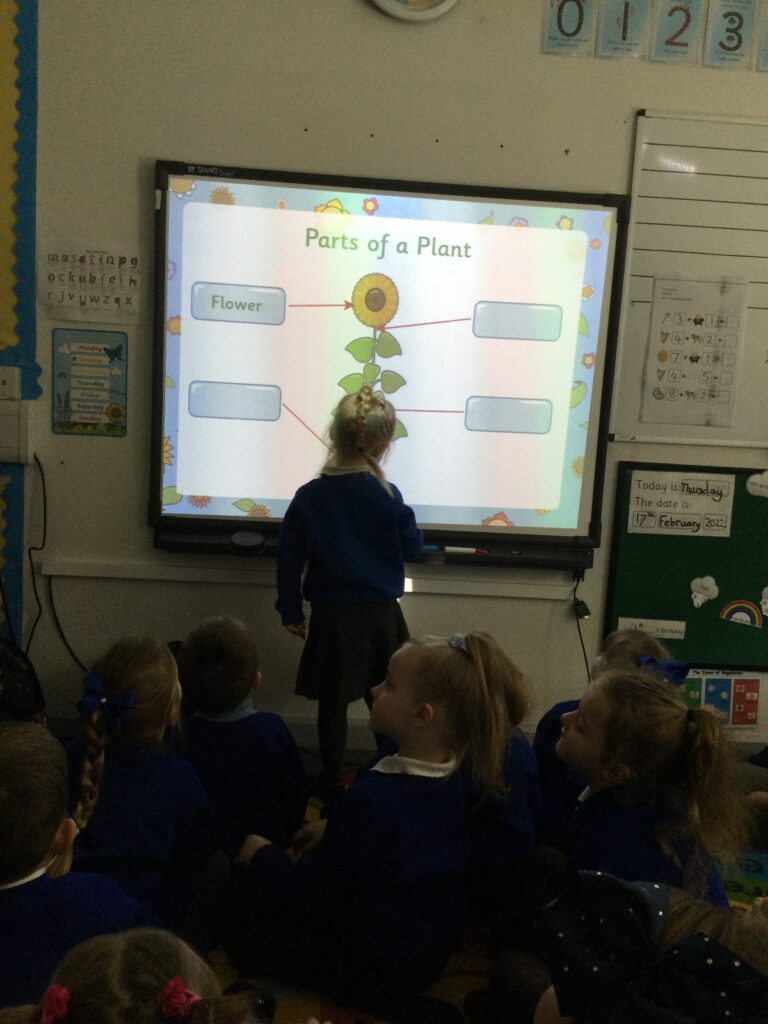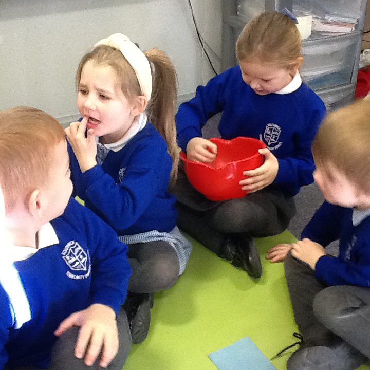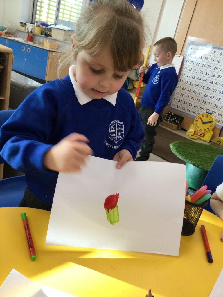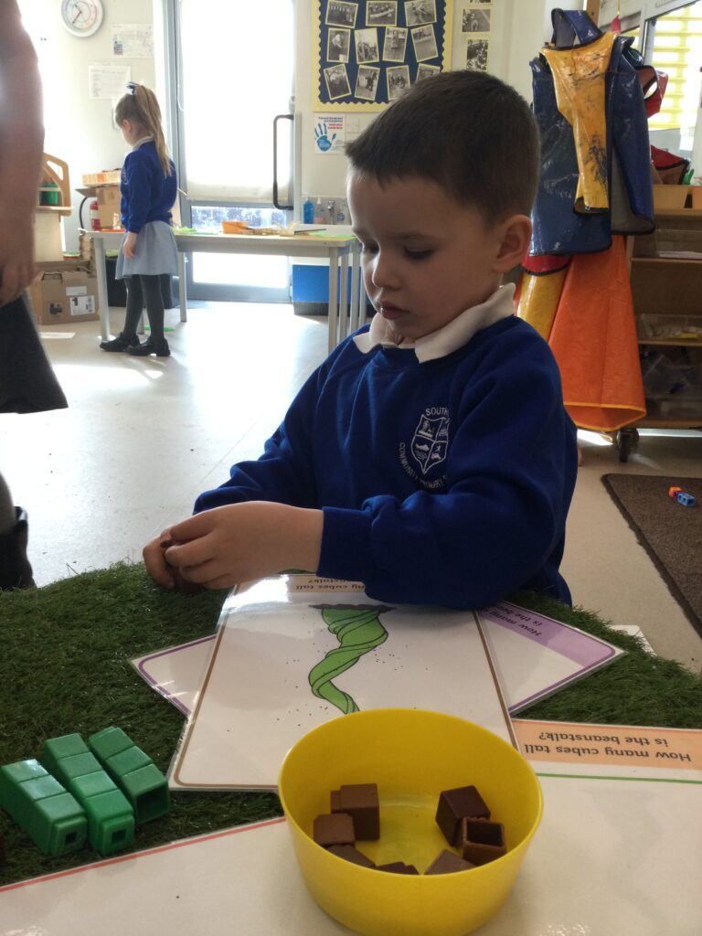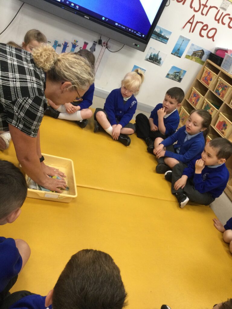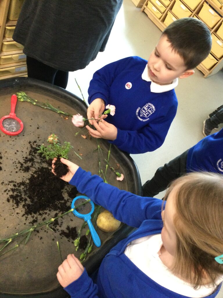 This week has been Science week where we have been learning all about growth. We took part in a whole school activity where we had to stretch playdough as far as we could and measured its length using unit cubes as a non standard measure. We also took part in a whole group activity where we had to stretch a curly whurly chocolate bar and compete against the other year groups to see who stretched it the furthest. We looked at and labelled the different parts of the flower and also learned about the life cycle of a flower. We did observational paintings and drawings of various flowers. We also investigated the inside of different fruits and used our fine motor skills to remove the seeds from within. We did some planting outdoors in our gardening area aswell as inside including an experiment where we looked at how plants survive in different conditions. In the tuff tray we explored the roots of the flower and different vegetables and bulbs.