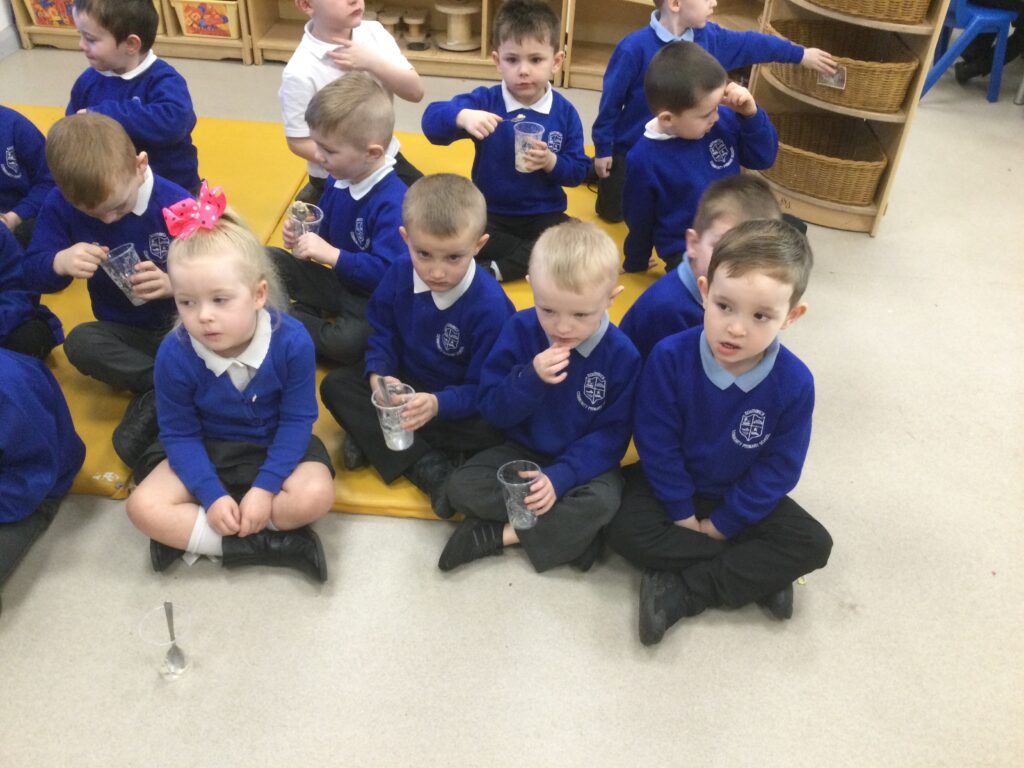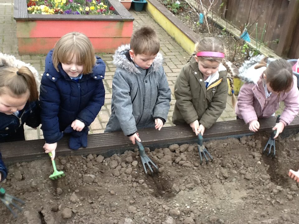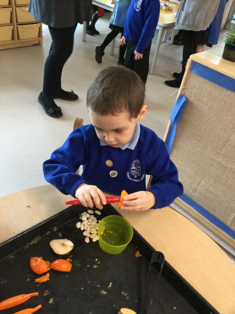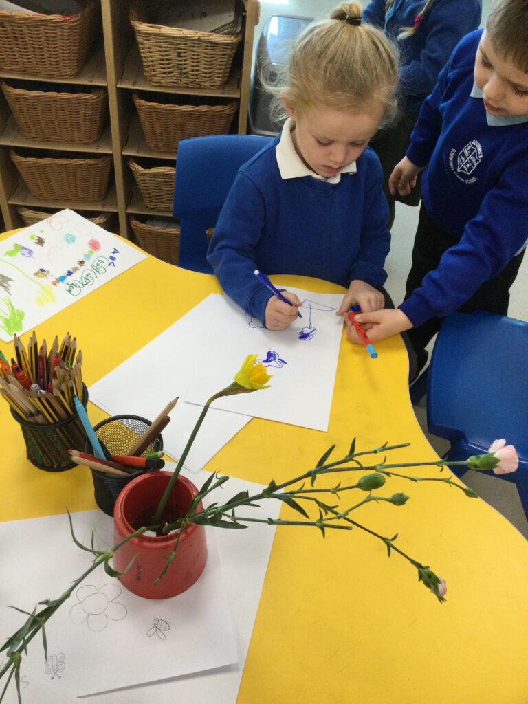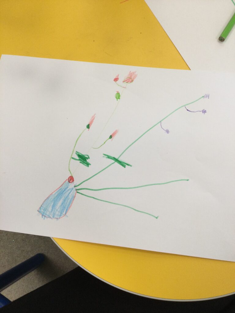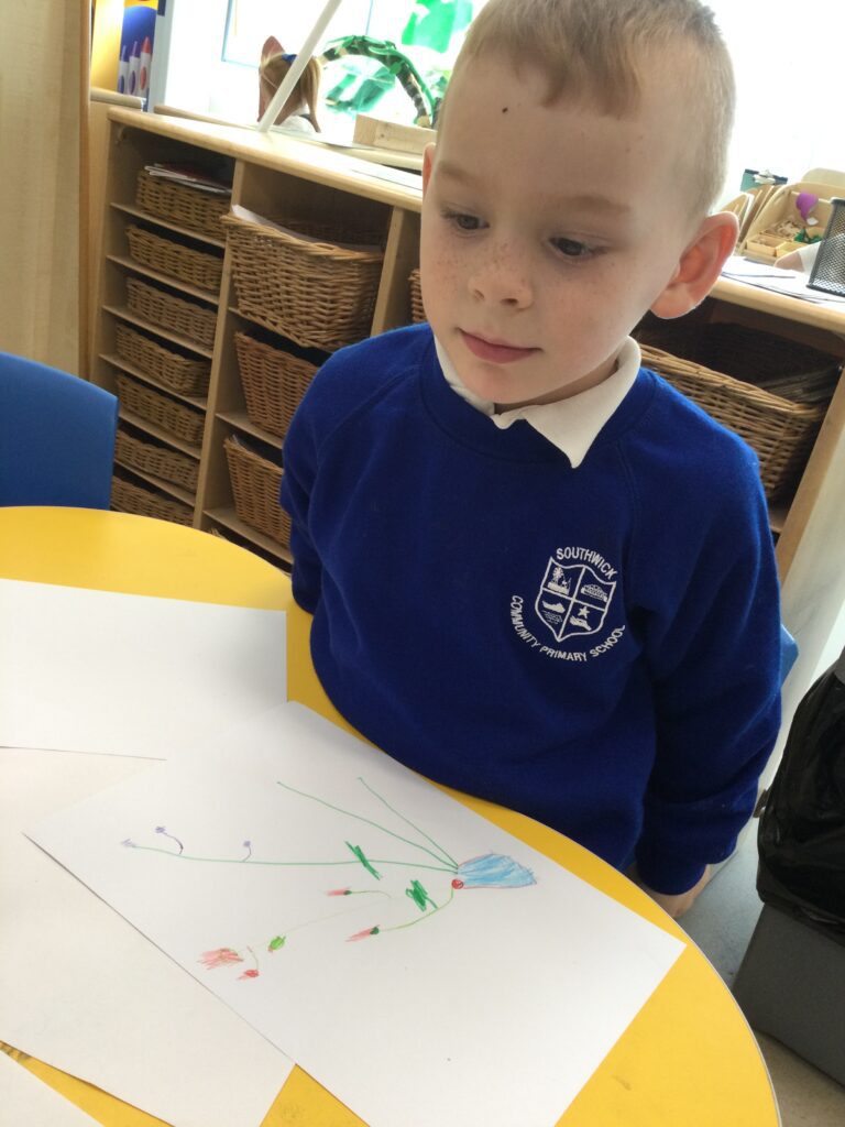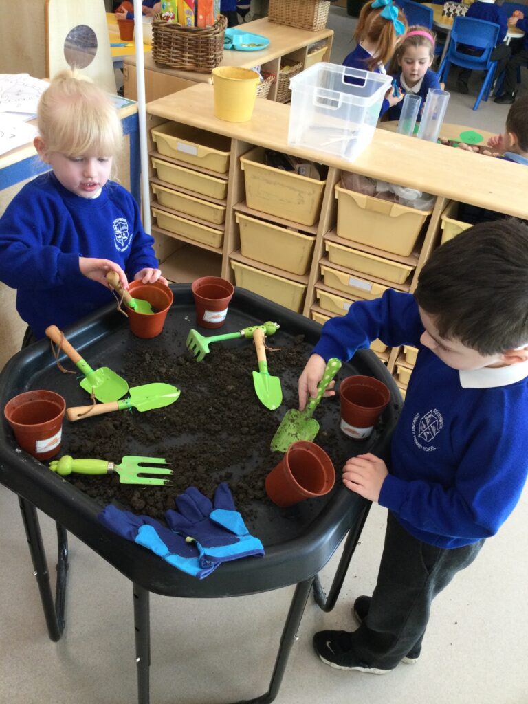 This week has been Science week where we have been learning all about growth. We took part in a whole school activity where we had to stretch playdough as far as we could and measured its length using unit cubes as a non standard measure. We also took part in a whole group activity where we had to stretch a curly whurly chocolate bar and compete against the other year groups to see who stretched it the furthest. We looked at and labelled the different parts of the flower and also learned about the life cycle of a flower. We did observational paintings and drawings of various flowers. We also investigated the inside of different fruits and used our fine motor skills to remove the seeds from within. We did some planting outdoors in our gardening area aswell as inside including an experiment where we looked at how plants survive in different conditions. In the tuff tray we explored the roots of the flower and different vegetables and bulbs.