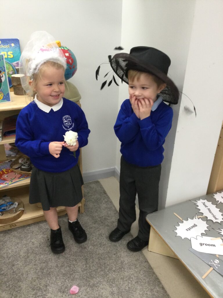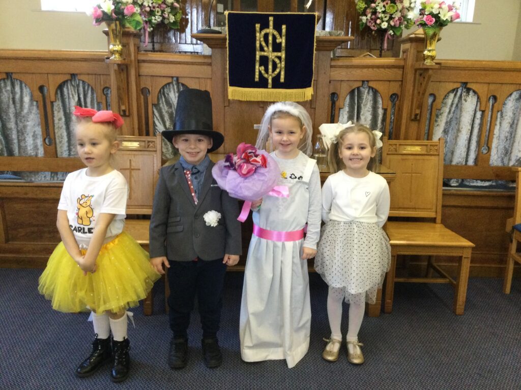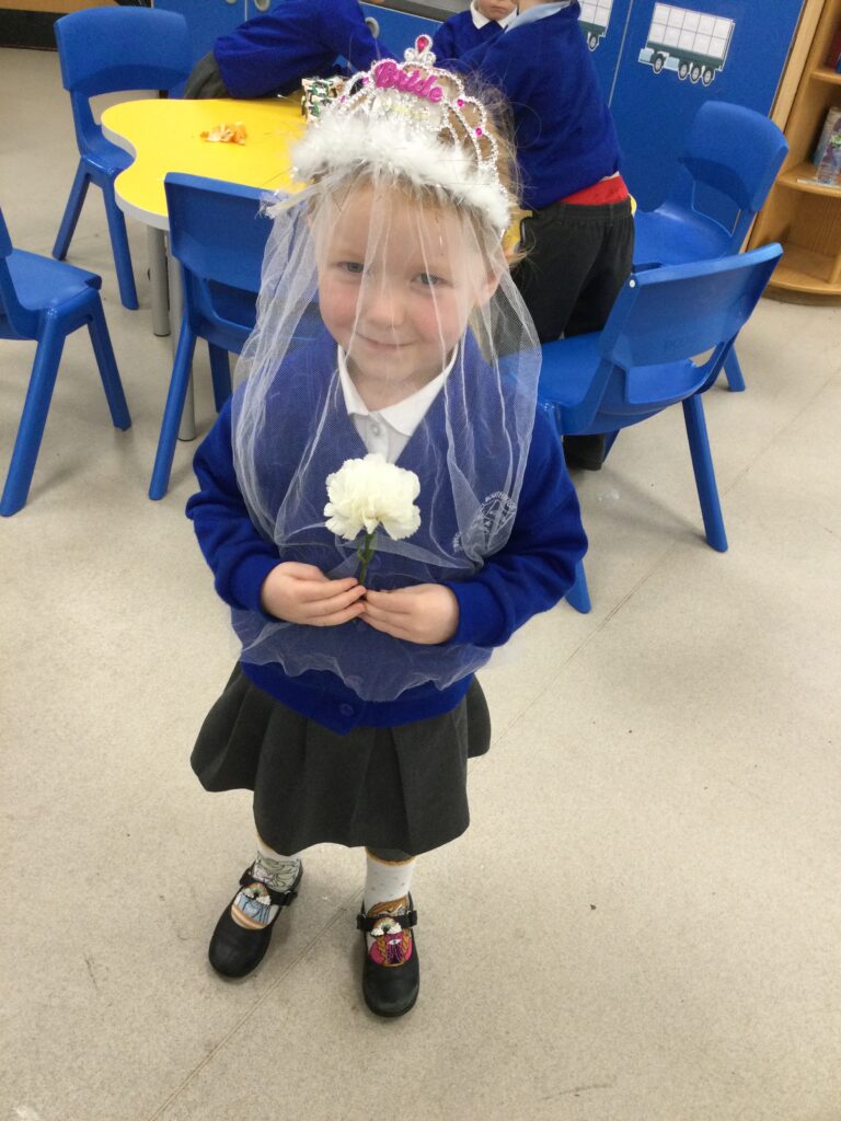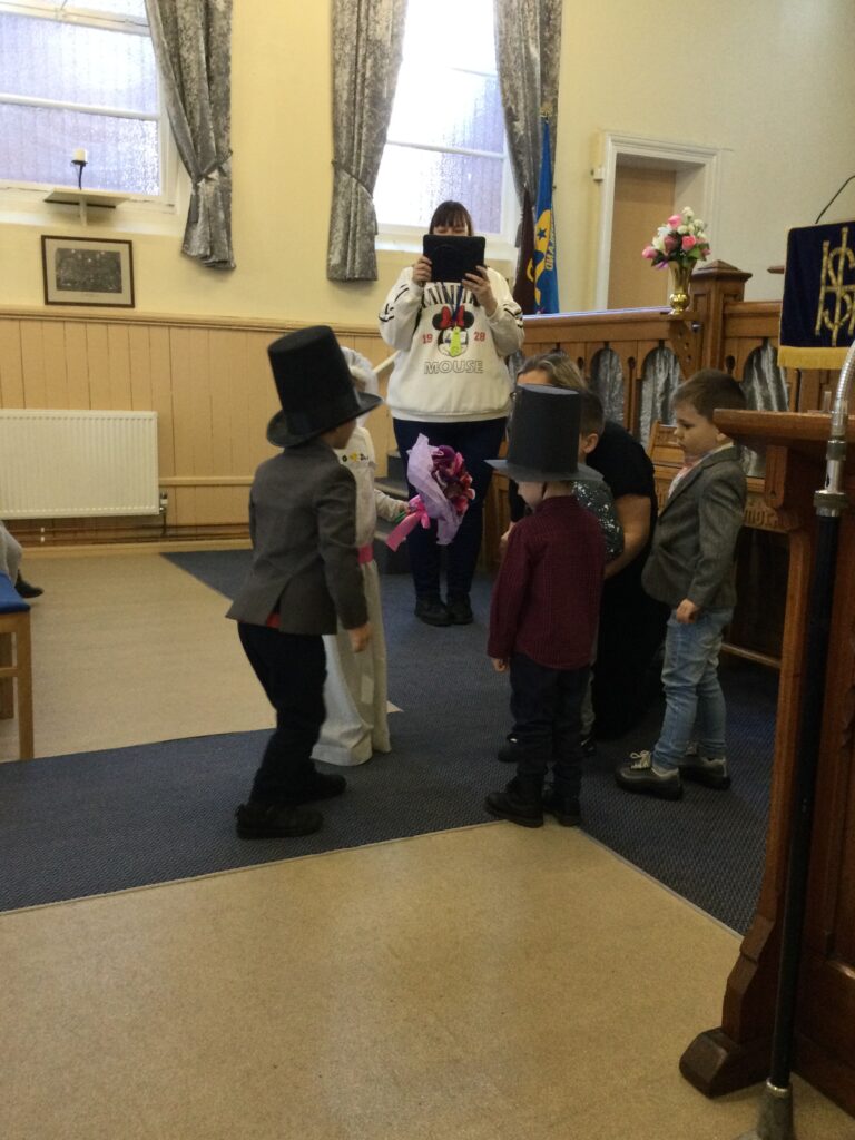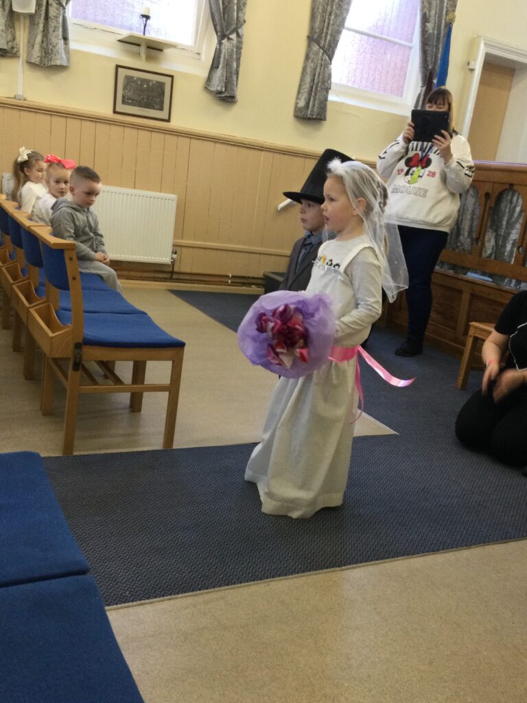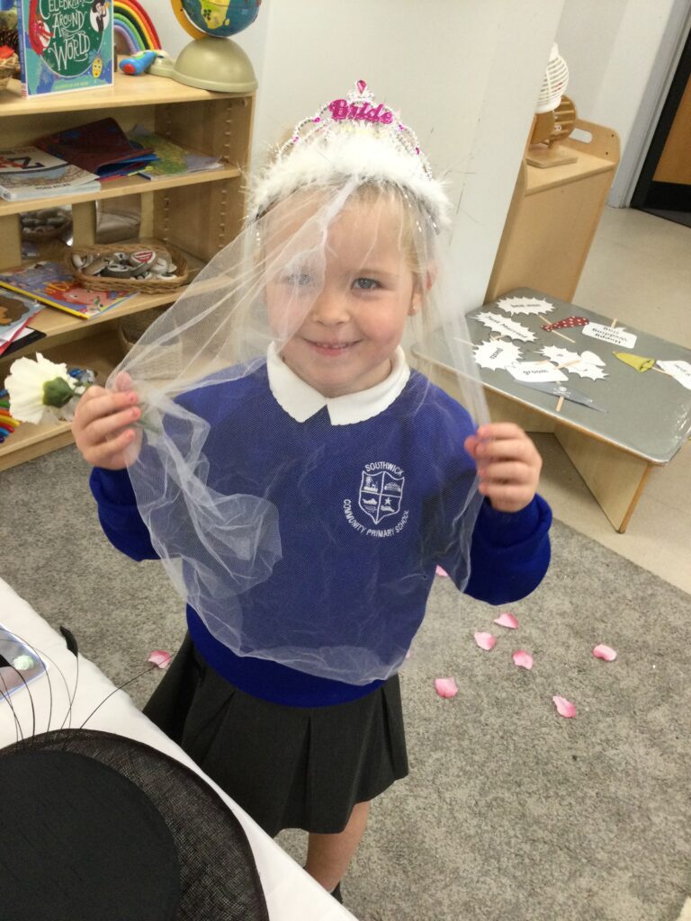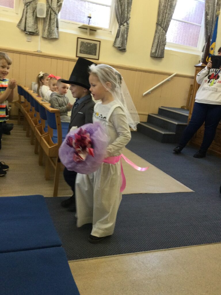 This week in Reception we have been learning all about Christian Weddings and traditions. We have been writing our very own wedding invitations in the writing area, designing, painting and decorating wedding dresses in the creative area. In the maths area we have been using our maths skills to recognise numbers and count the correct amount of decorations to place onto the wedding dresses. We had a tuff tray full of dolls and used tissue paper to make wedding dresses and bouquets for them. We performed our own wedding in Southwick Methodist church. The bride wore a wedding dress that we made by hand sewing and the groom and best man wore top hats that were also made in our creative area. We created our own beautiful bouquet of flowers from tissue paper and ribbon. We returned to school and had a wedding reception where we all witnessed the bride and groom’s first dance and enjoyed our party food which we prepared ourselves of sandwiches and cakes. We took lots of photos using the photo props on the IPad just like we were in a real photo booth. We all had so much fun celebrating together.