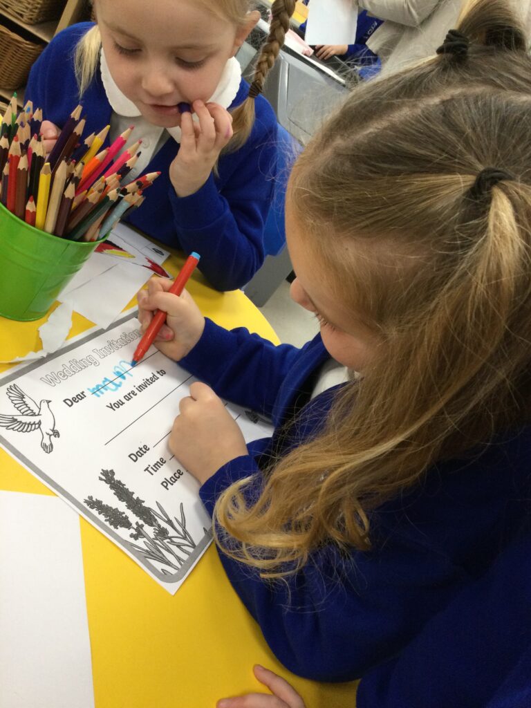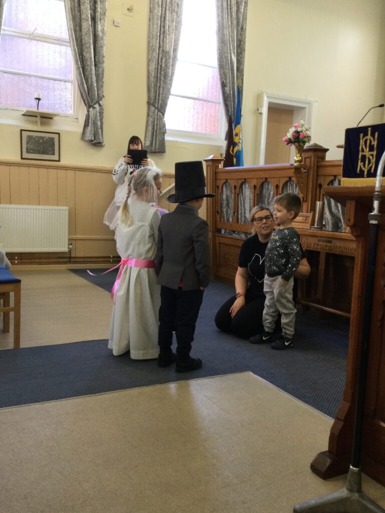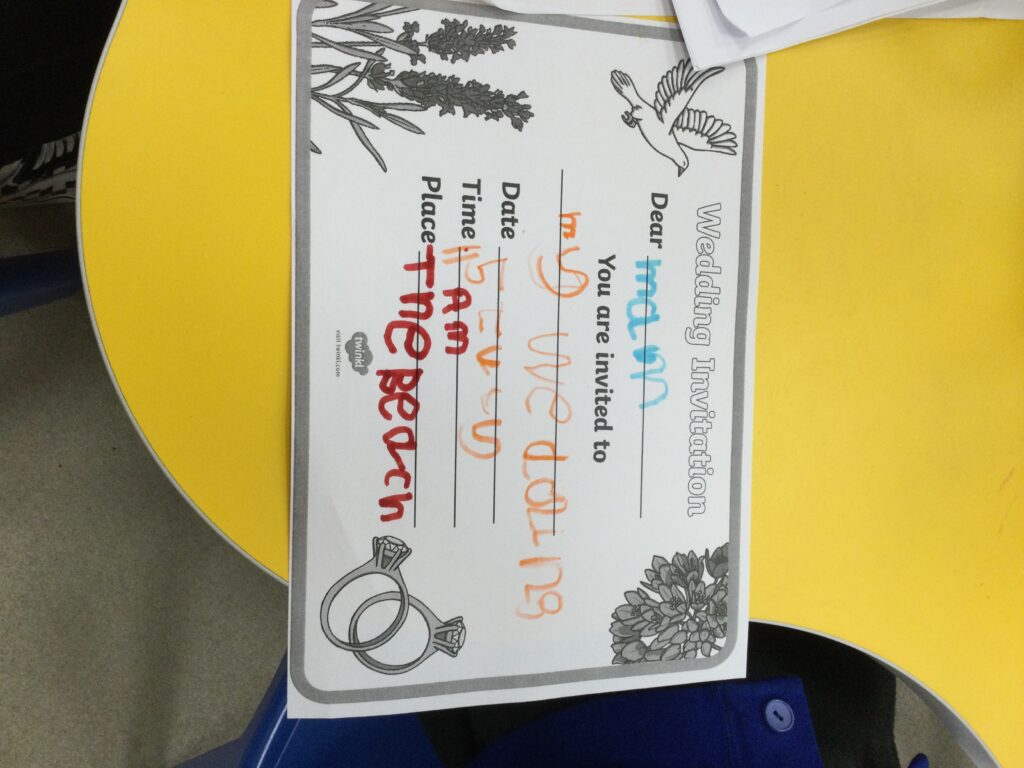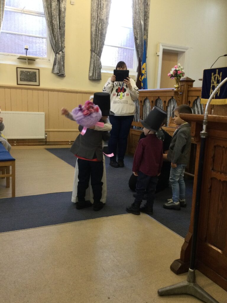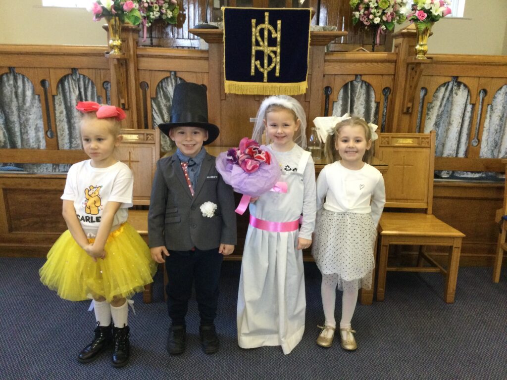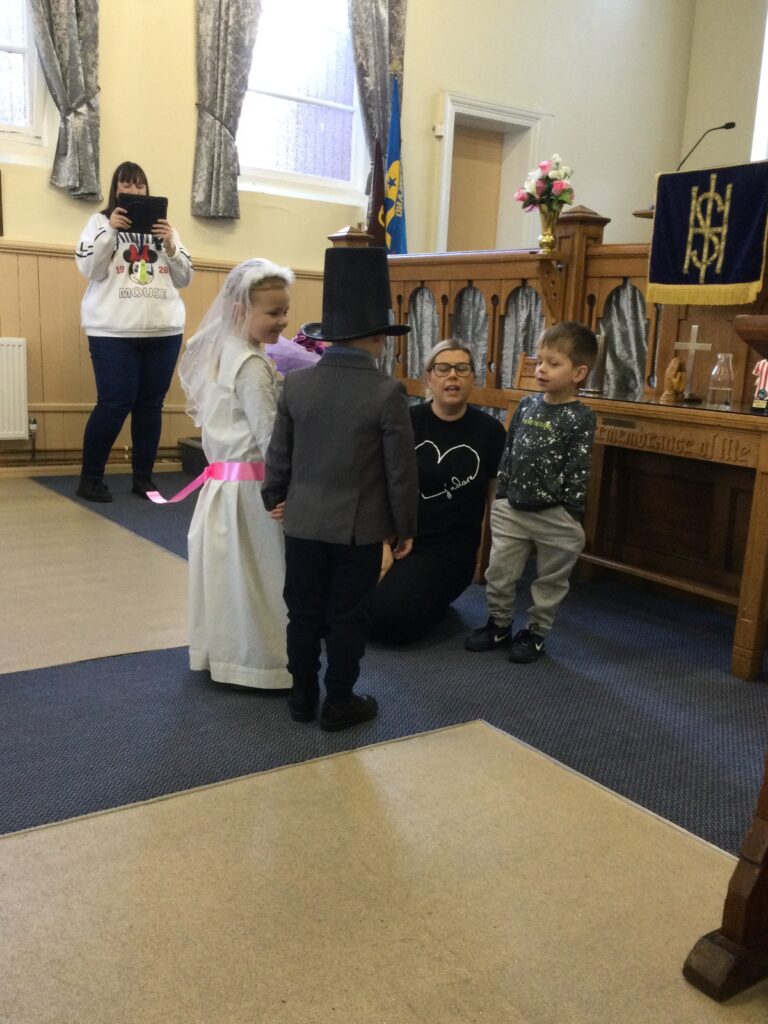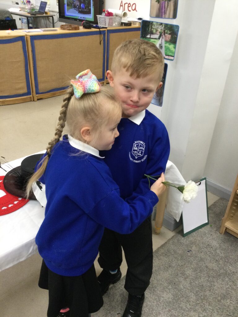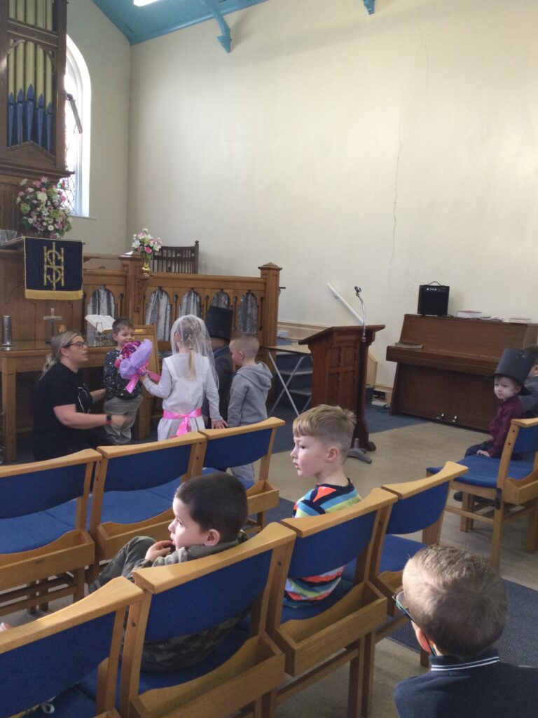 This week in Reception we have been learning all about Christian Weddings and traditions. We have been writing our very own wedding invitations in the writing area, designing, painting and decorating wedding dresses in the creative area. In the maths area we have been using our maths skills to recognise numbers and count the correct amount of decorations to place onto the wedding dresses. We had a tuff tray full of dolls and used tissue paper to make wedding dresses and bouquets for them. We performed our own wedding in Southwick Methodist church. The bride wore a wedding dress that we made by hand sewing and the groom and best man wore top hats that were also made in our creative area. We created our own beautiful bouquet of flowers from tissue paper and ribbon. We returned to school and had a wedding reception where we all witnessed the bride and groom’s first dance and enjoyed our party food which we prepared ourselves of sandwiches and cakes. We took lots of photos using the photo props on the IPad just like we were in a real photo booth. We all had so much fun celebrating together.