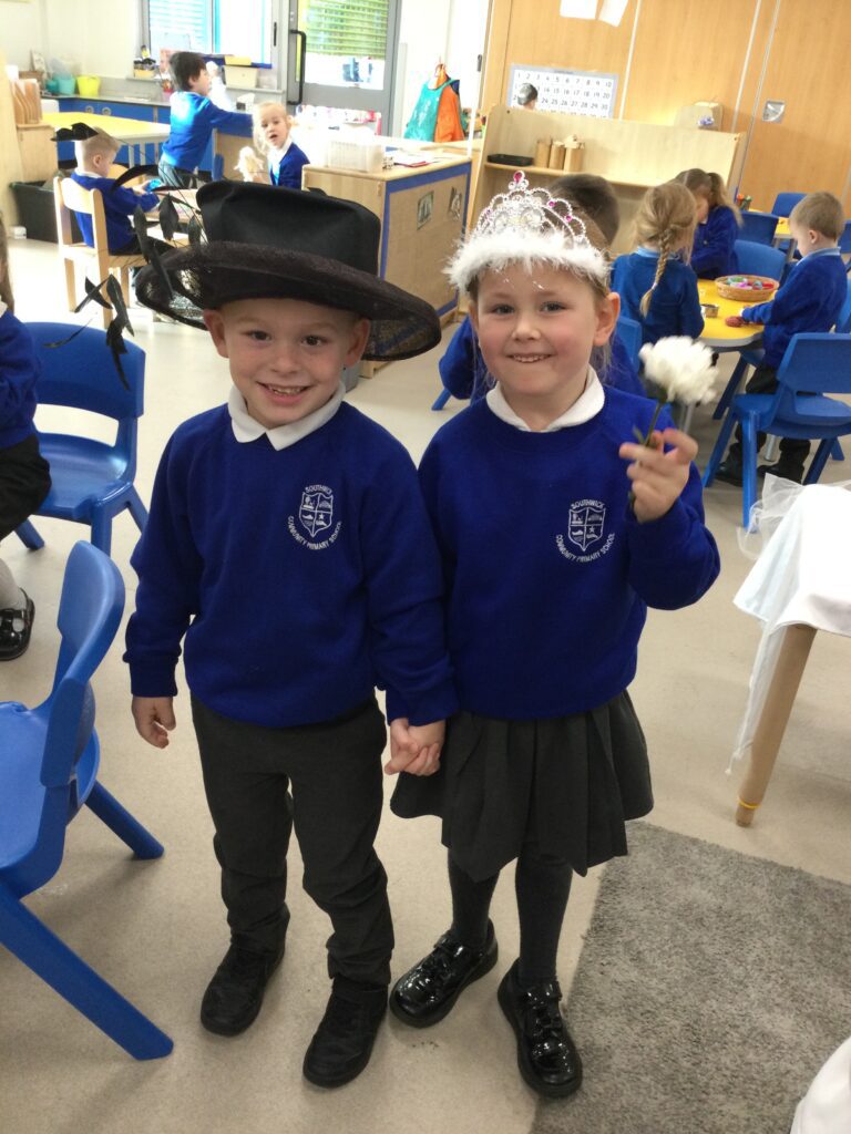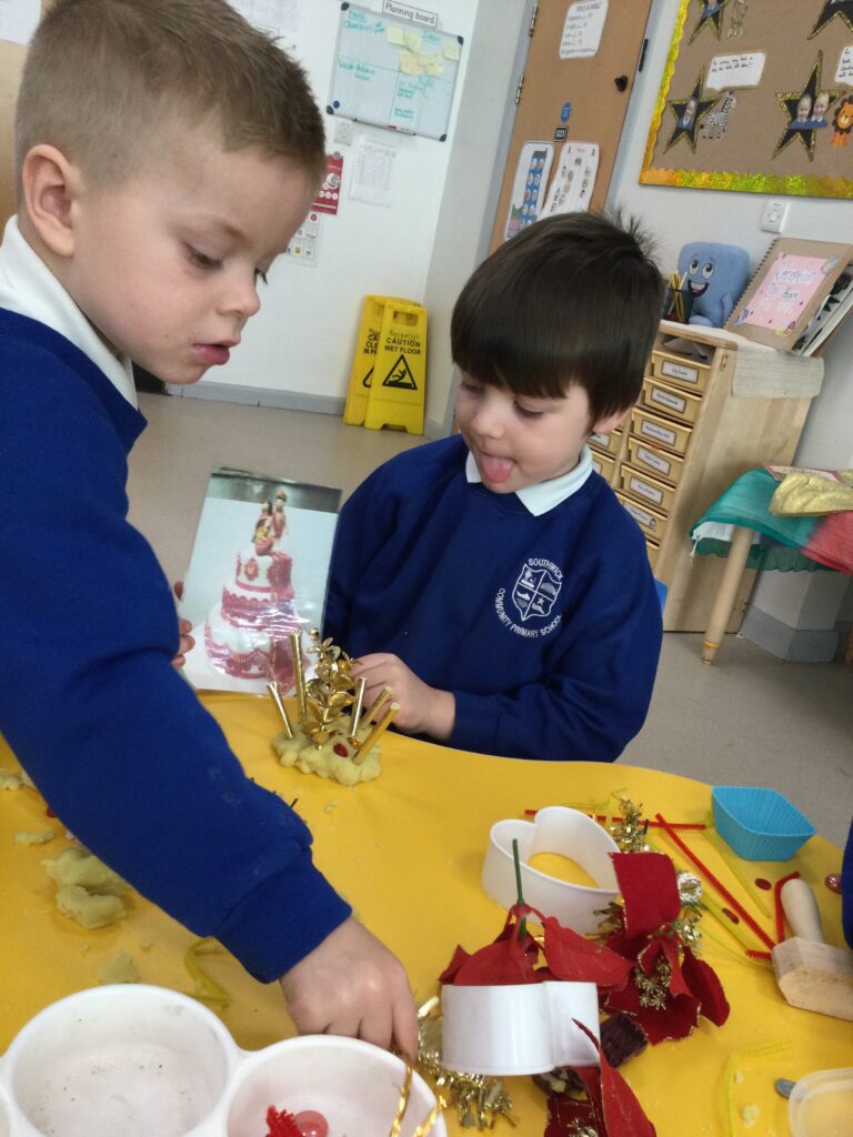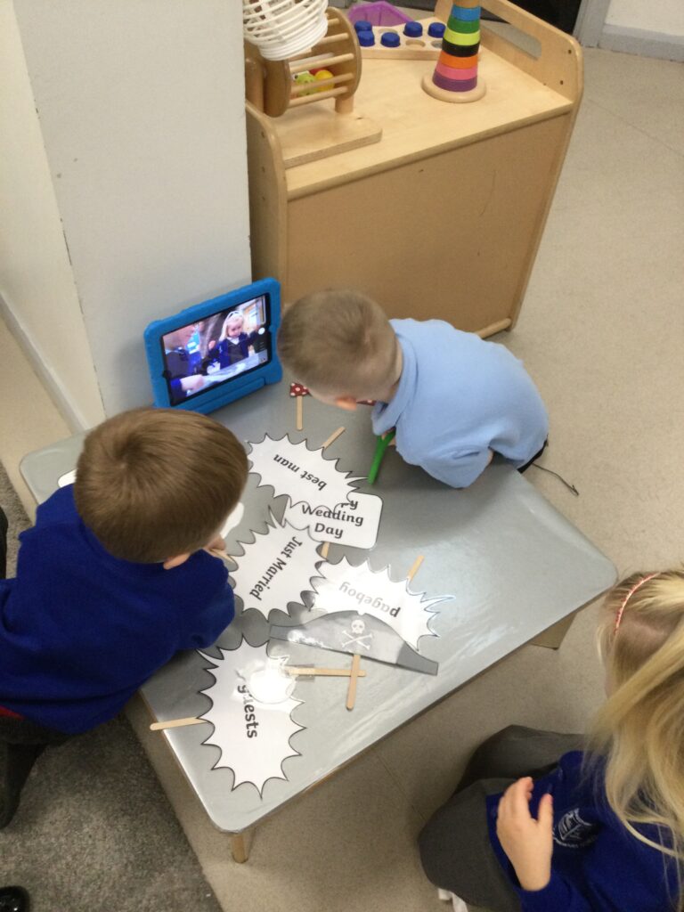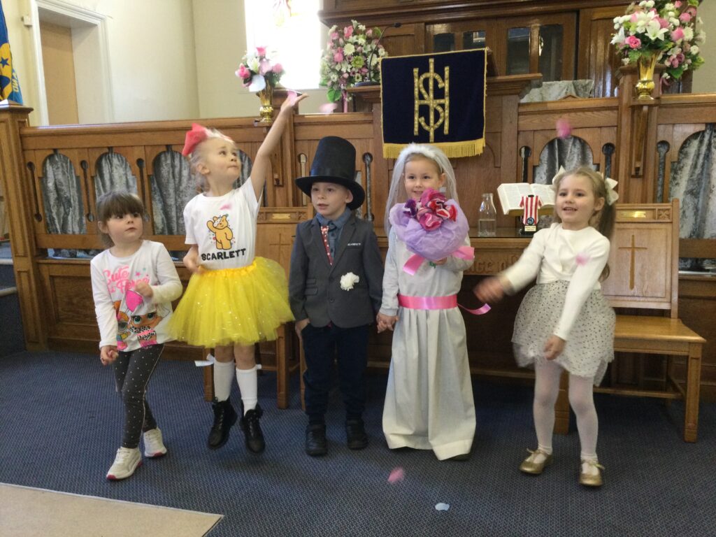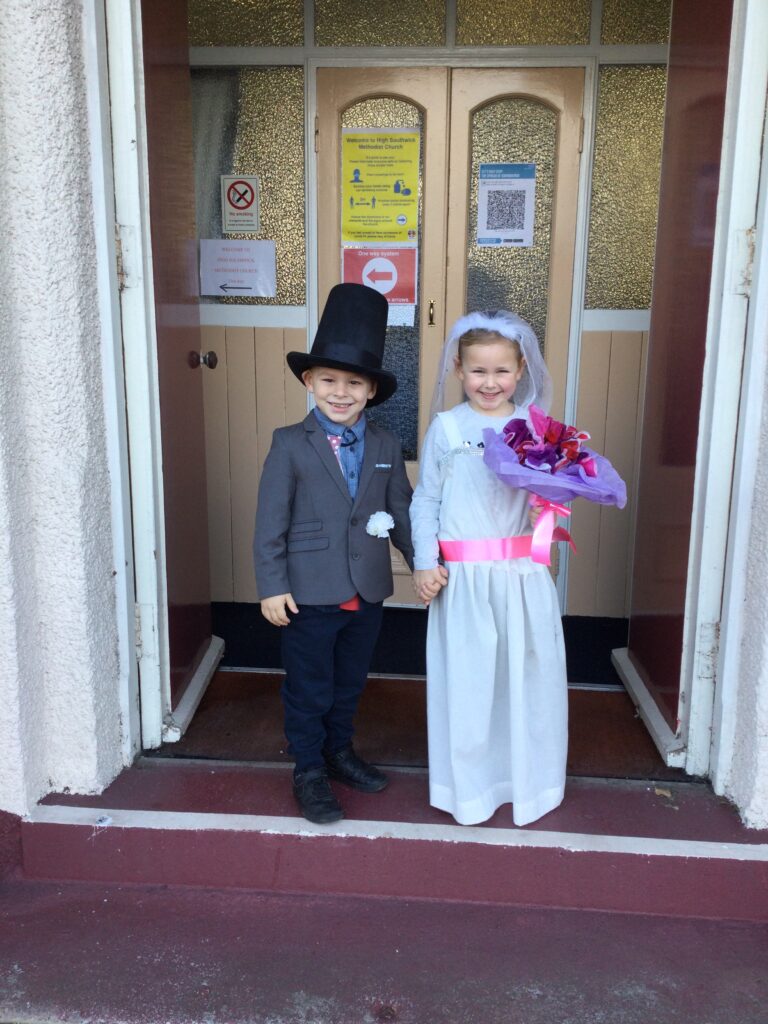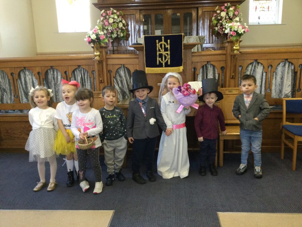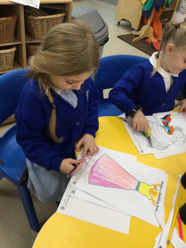 This week in Reception we have been learning all about Christian Weddings and traditions. We have been writing our very own wedding invitations in the writing area, designing, painting and decorating wedding dresses in the creative area. In the maths area we have been using our maths skills to recognise numbers and count the correct amount of decorations to place onto the wedding dresses. We had a tuff tray full of dolls and used tissue paper to make wedding dresses and bouquets for them. We performed our own wedding in Southwick Methodist church. The bride wore a wedding dress that we made by hand sewing and the groom and best man wore top hats that were also made in our creative area. We created our own beautiful bouquet of flowers from tissue paper and ribbon. We returned to school and had a wedding reception where we all witnessed the bride and groom’s first dance and enjoyed our party food which we prepared ourselves of sandwiches and cakes. We took lots of photos using the photo props on the IPad just like we were in a real photo booth. We all had so much fun celebrating together.