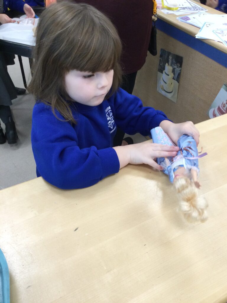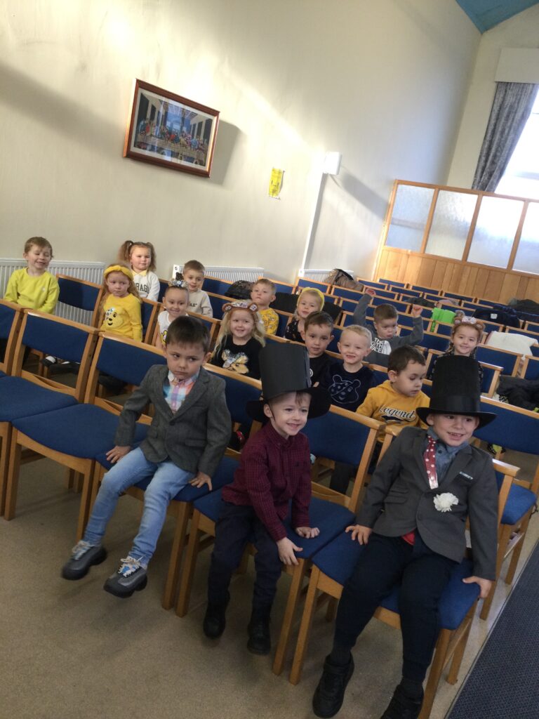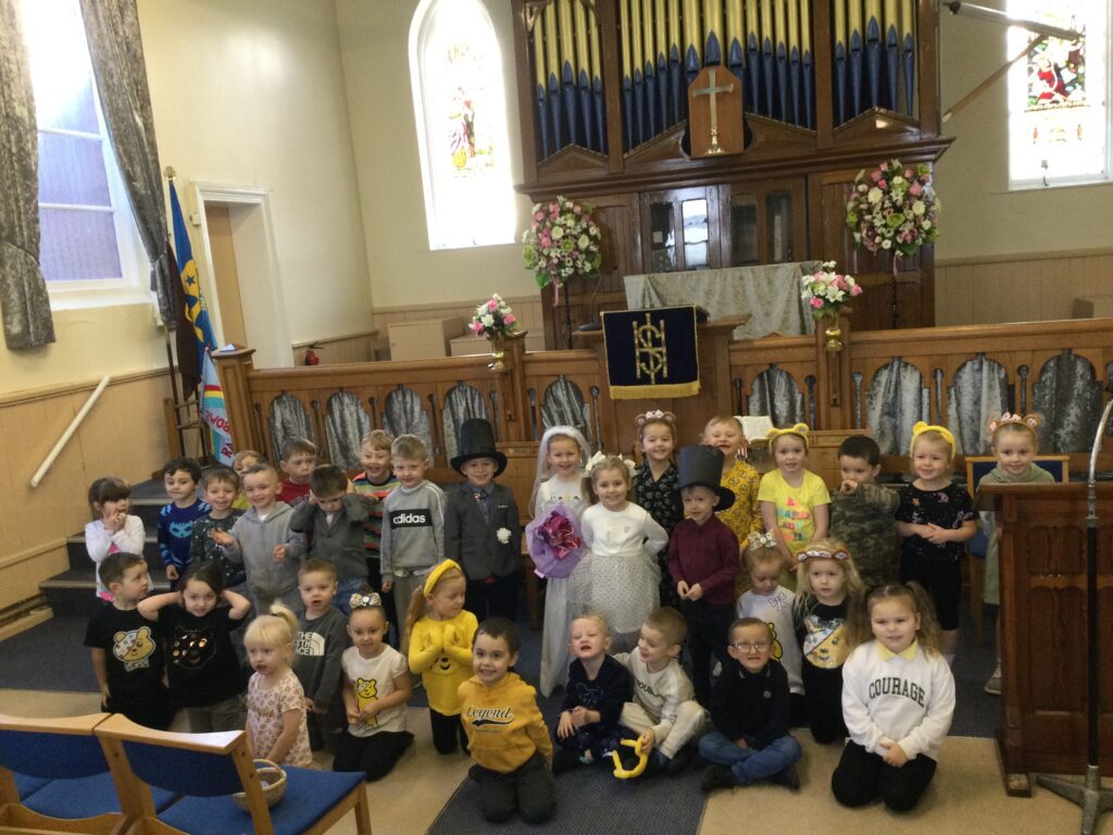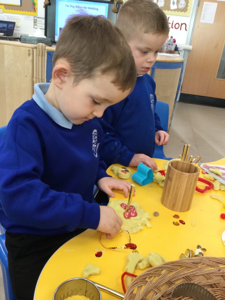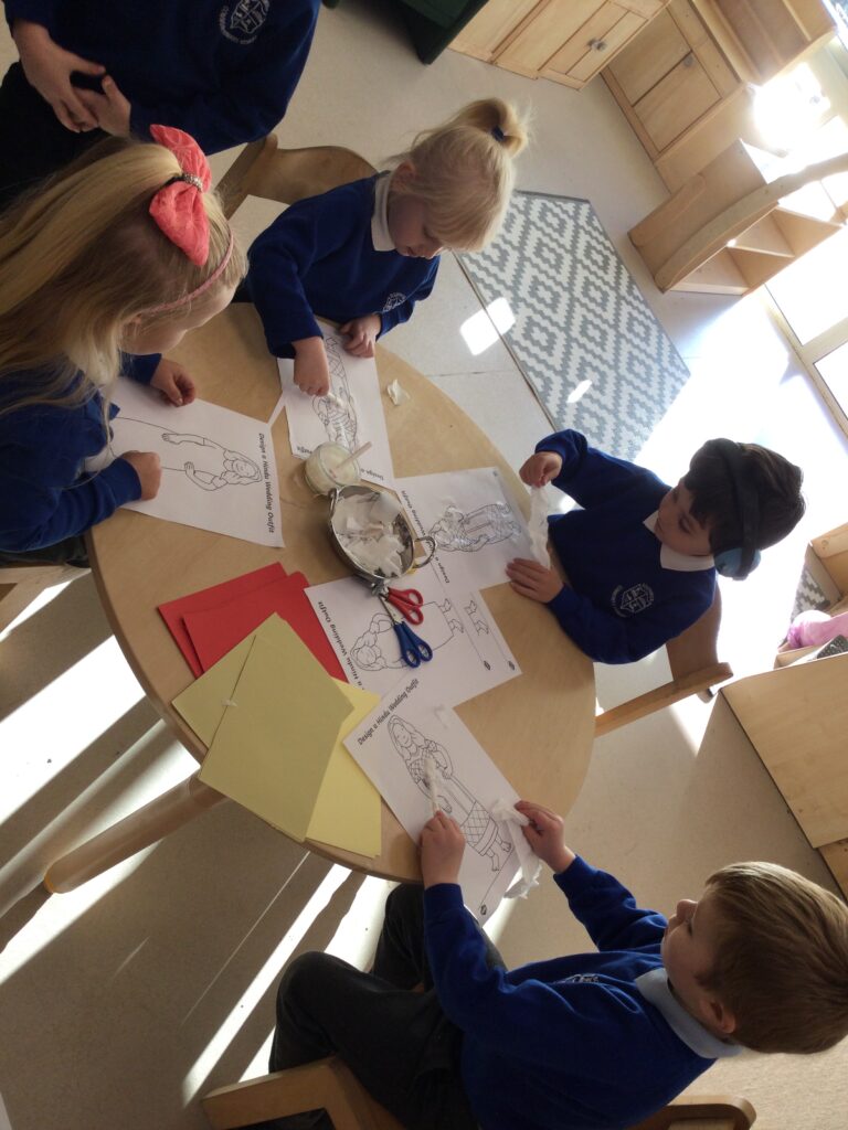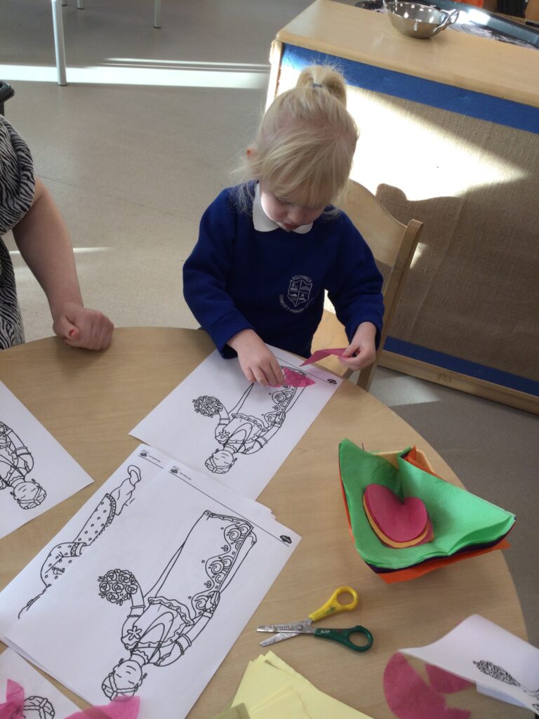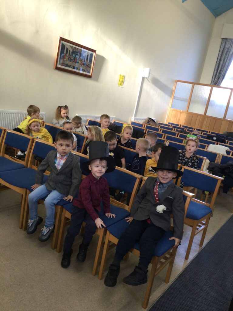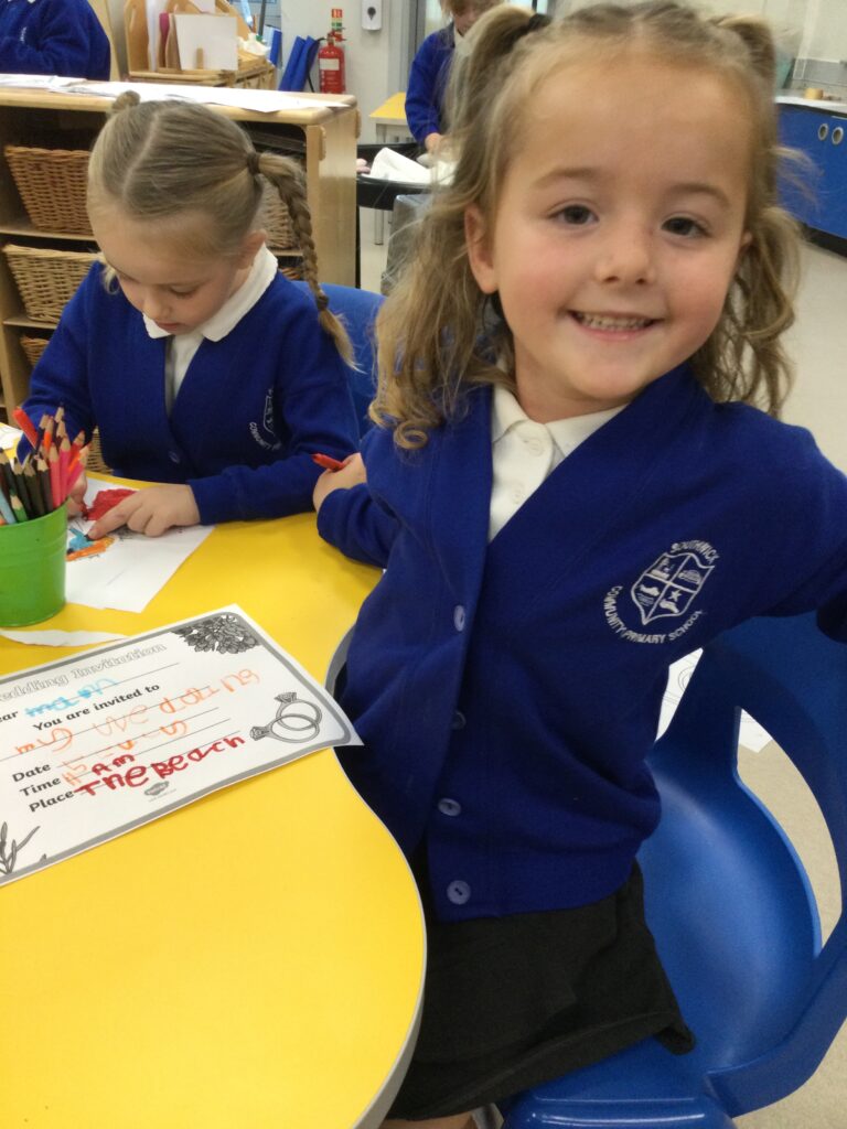 This week in Reception we have been learning all about Christian Weddings and traditions. We have been writing our very own wedding invitations in the writing area, designing, painting and decorating wedding dresses in the creative area. In the maths area we have been using our maths skills to recognise numbers and count the correct amount of decorations to place onto the wedding dresses. We had a tuff tray full of dolls and used tissue paper to make wedding dresses and bouquets for them. We performed our own wedding in Southwick Methodist church. The bride wore a wedding dress that we made by hand sewing and the groom and best man wore top hats that were also made in our creative area. We created our own beautiful bouquet of flowers from tissue paper and ribbon. We returned to school and had a wedding reception where we all witnessed the bride and groom’s first dance and enjoyed our party food which we prepared ourselves of sandwiches and cakes. We took lots of photos using the photo props on the IPad just like we were in a real photo booth. We all had so much fun celebrating together.