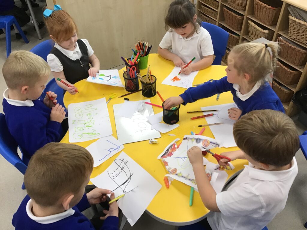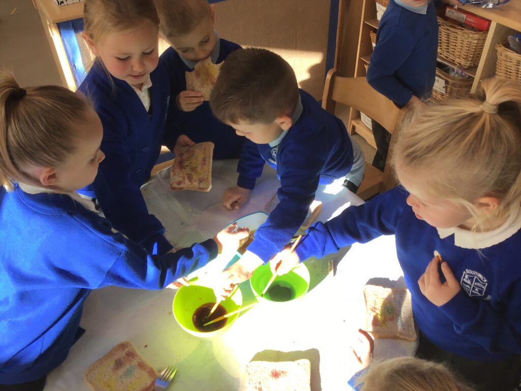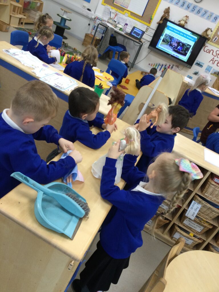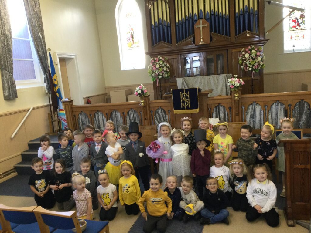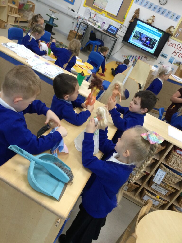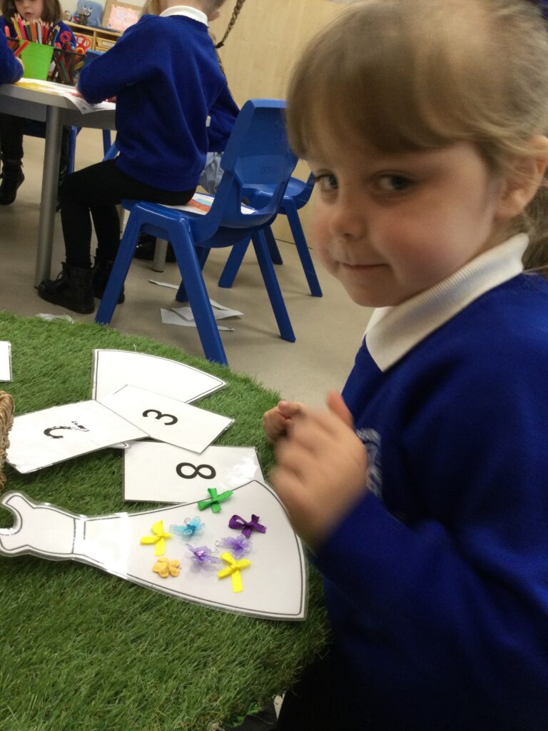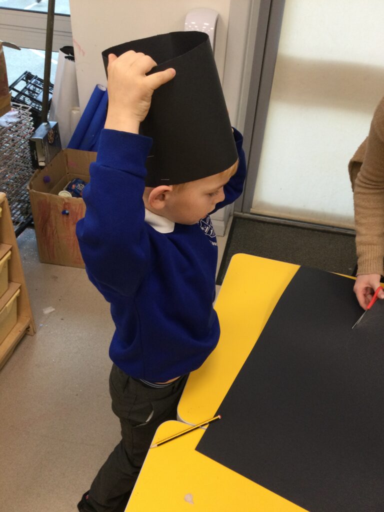 This week in Reception we have been learning all about Christian Weddings and traditions. We have been writing our very own wedding invitations in the writing area, designing, painting and decorating wedding dresses in the creative area. In the maths area we have been using our maths skills to recognise numbers and count the correct amount of decorations to place onto the wedding dresses. We had a tuff tray full of dolls and used tissue paper to make wedding dresses and bouquets for them. We performed our own wedding in Southwick Methodist church. The bride wore a wedding dress that we made by hand sewing and the groom and best man wore top hats that were also made in our creative area. We created our own beautiful bouquet of flowers from tissue paper and ribbon. We returned to school and had a wedding reception where we all witnessed the bride and groom’s first dance and enjoyed our party food which we prepared ourselves of sandwiches and cakes. We took lots of photos using the photo props on the IPad just like we were in a real photo booth. We all had so much fun celebrating together.