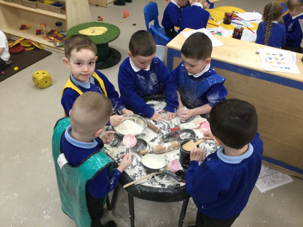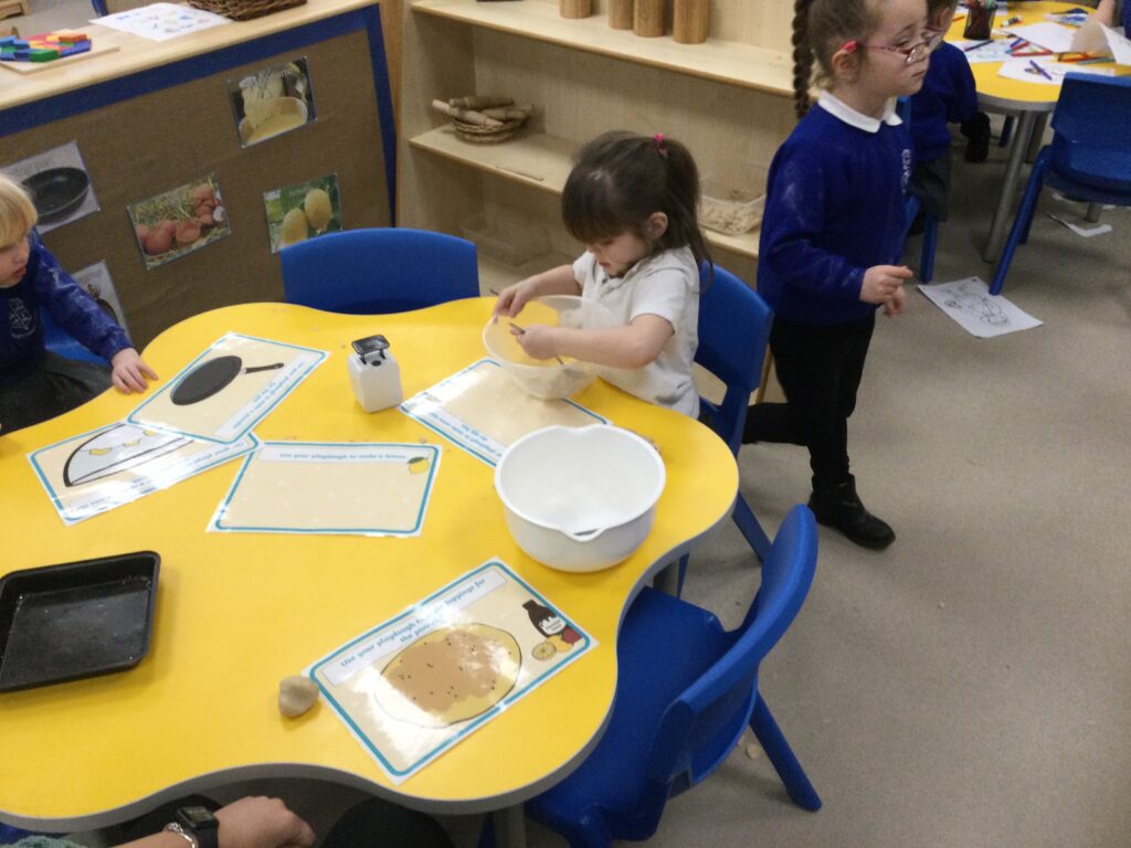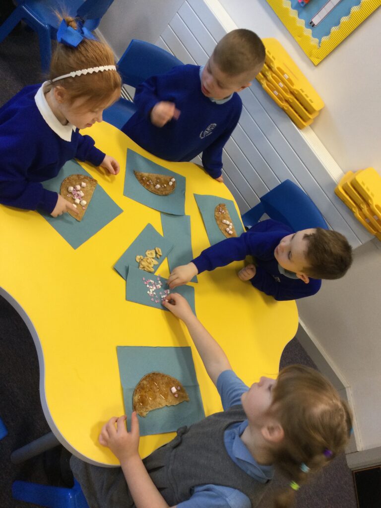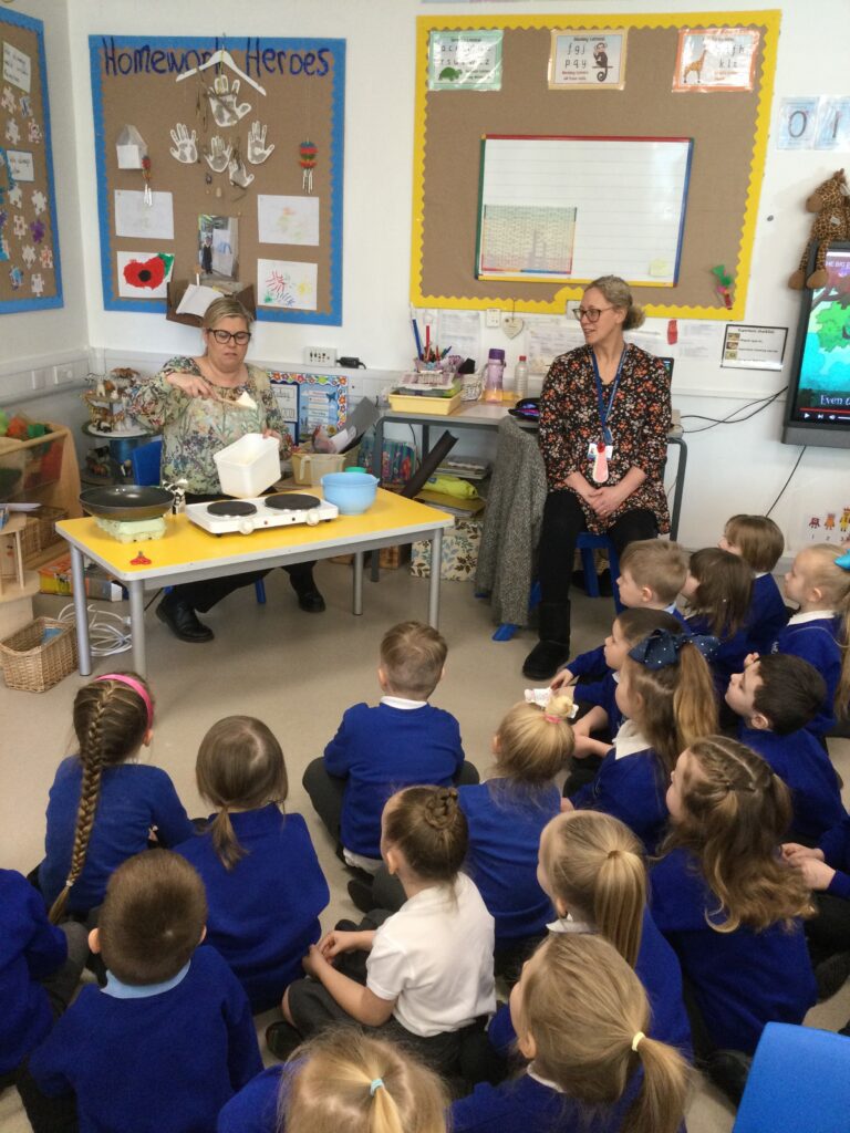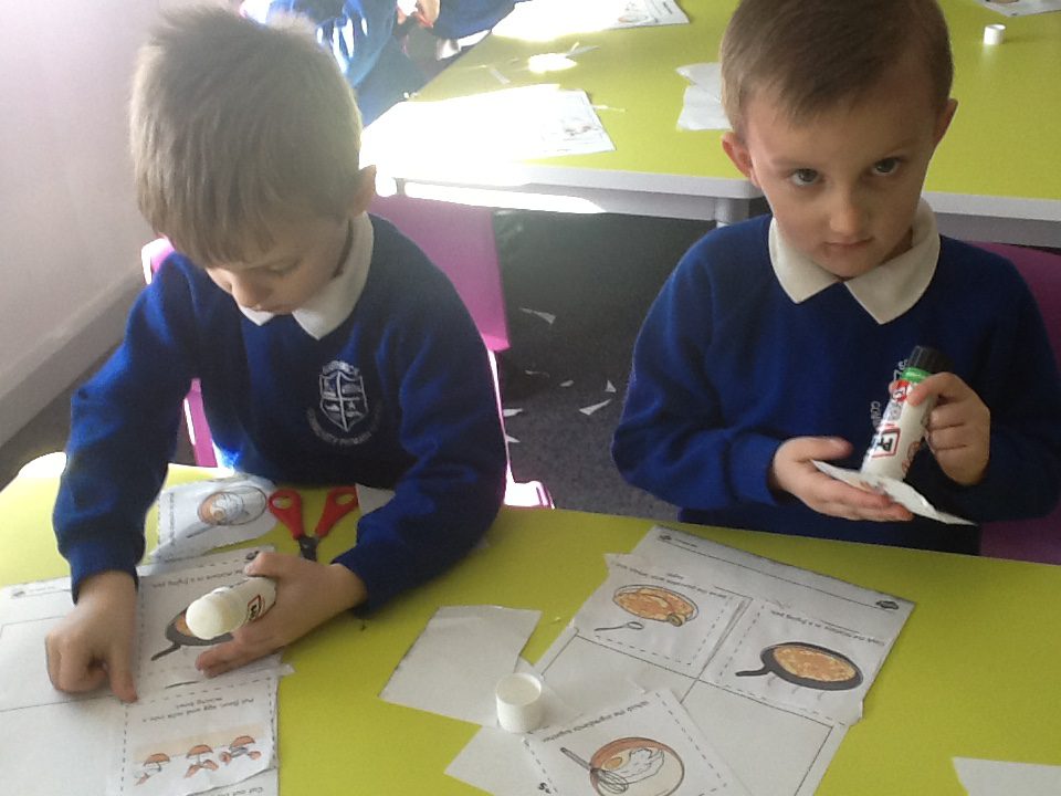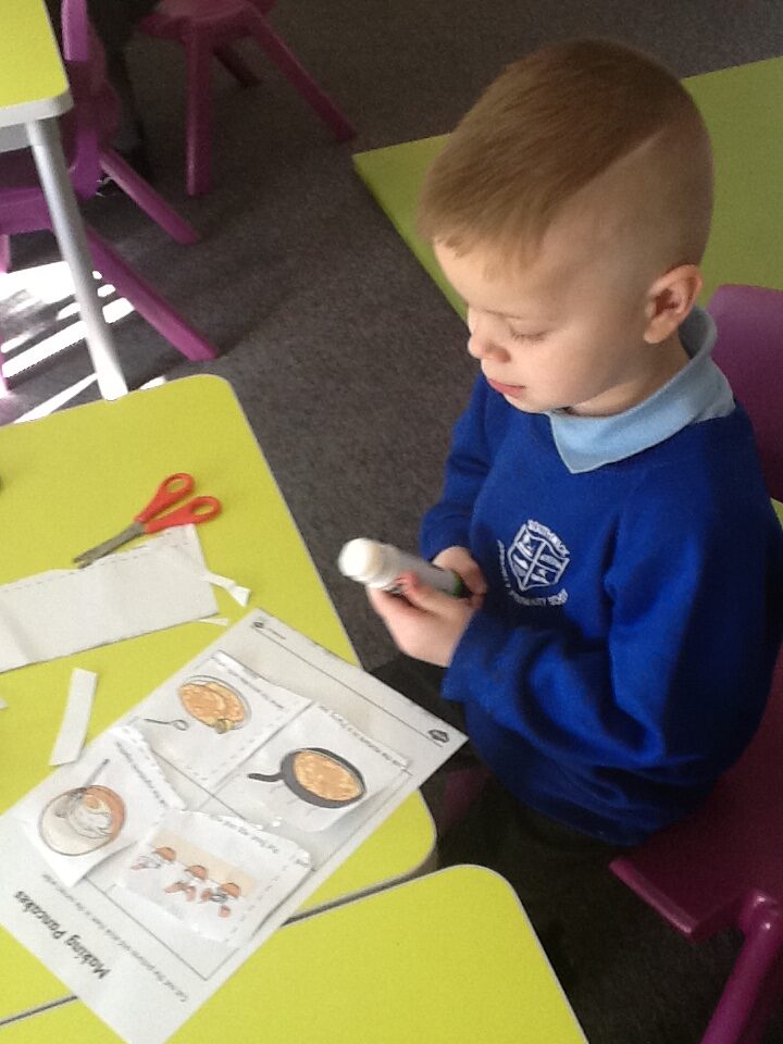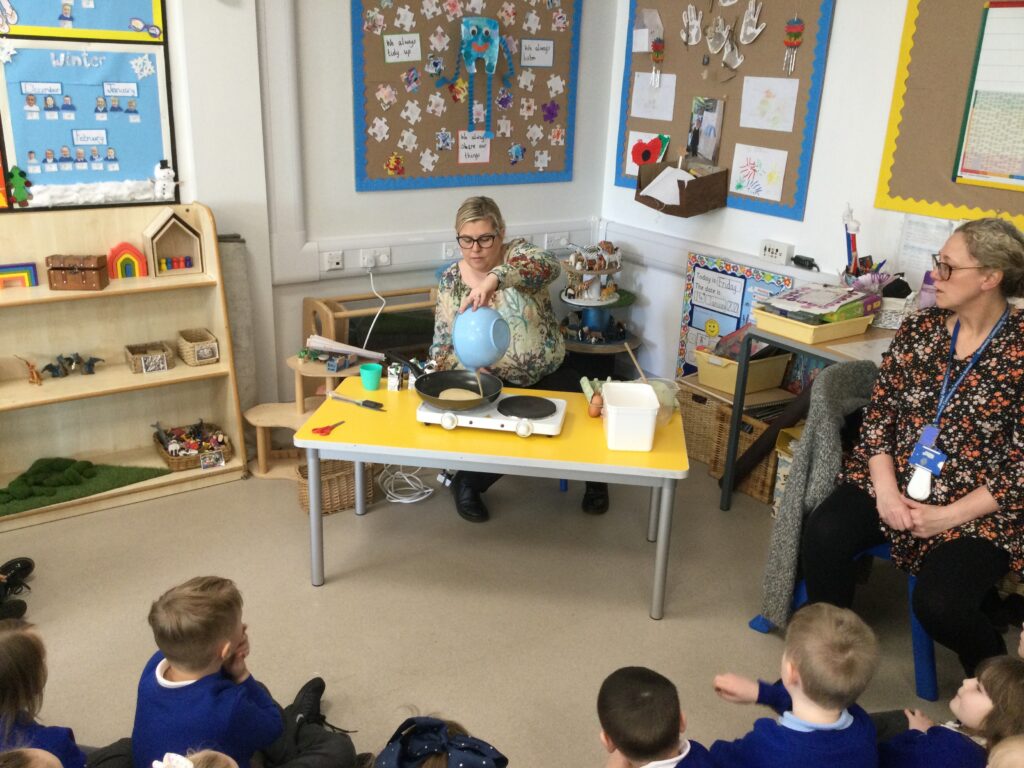 In Reception we have been learning about the traditions of pancake day and engaging in ‘pancake day’ themed activities with a focus around the book ‘Mr Wolves pancakes’. We all taste tested our very own pancakes which we watched and assisted Mrs Pattison in cooking. We all helped Mrs Pattison with the recipe and to choose the correct ingredients we needed to make the pancakes , from there we were able to do a sequencing task where we had to put the pictures in the correct order. In the tuff tray we explored the different utensils with the flour and we used them to make pancakes like Mr wolf from the story. We also made pancakes in the mud kitchen outside !. We used the scales to weigh and measure out ingredients in the playdough area and then used playdough mats and other tools to make toppings for our pancakes which we served to our friends. In the reading area we enjoyed re-telling the story to our friends and also reading the story with our teachers. We wrote shopping lists in the writing area like the one from the story. We also coloured in and drew different characters from the story. We made our very own ‘runaway pancake man’ in the creative area using a range of different materials. In the maths area we took part in a counting activity where we placed the correct amounts of toppings on top of the pancake and we also completed a shape matching activity where we had to recognise , name and correctly match the different shapes. We have had so much fun learning all about Pancake day and the story of Shrove Tuesday.