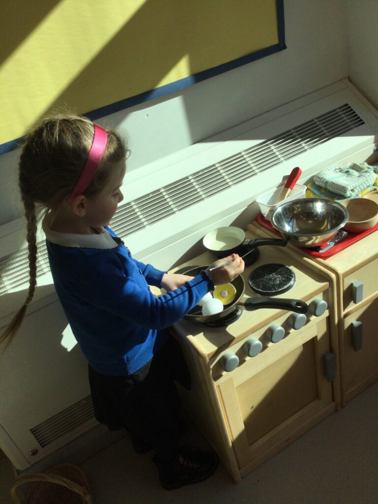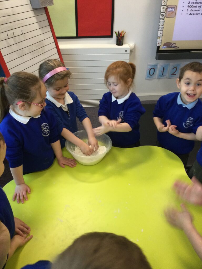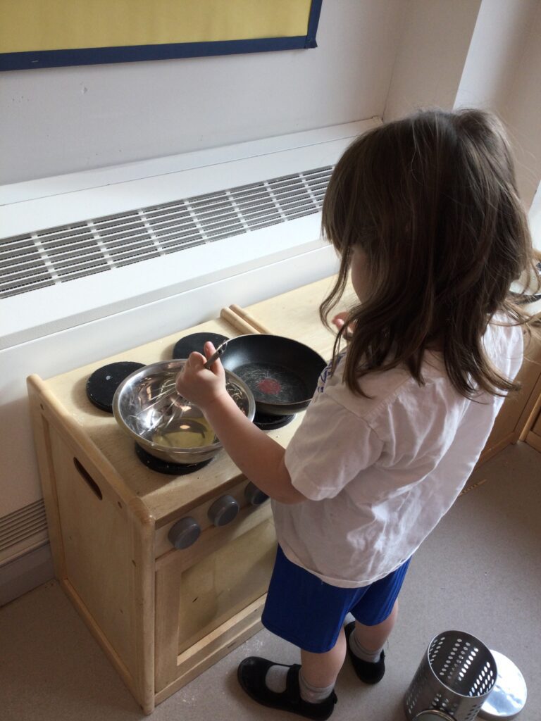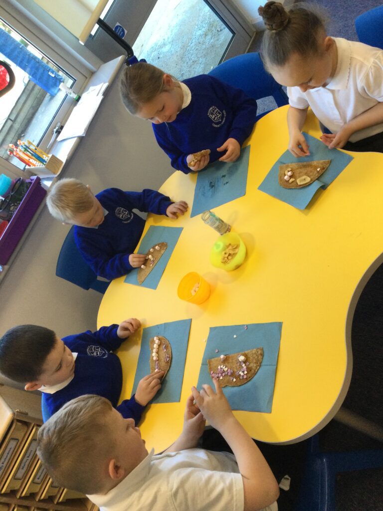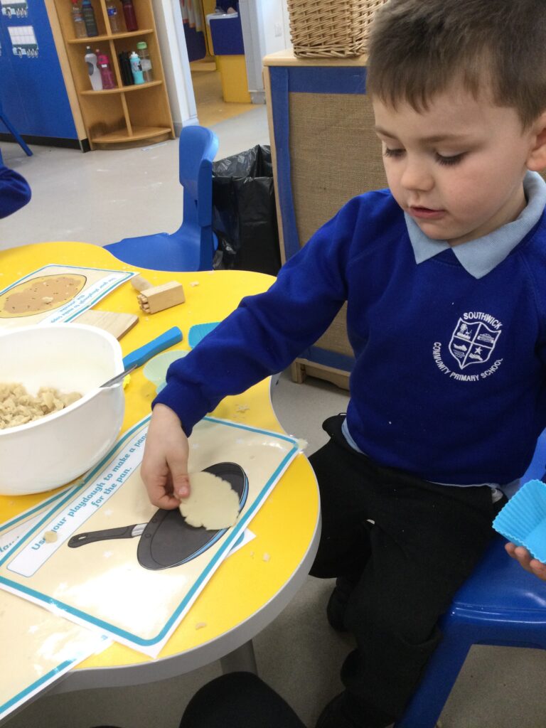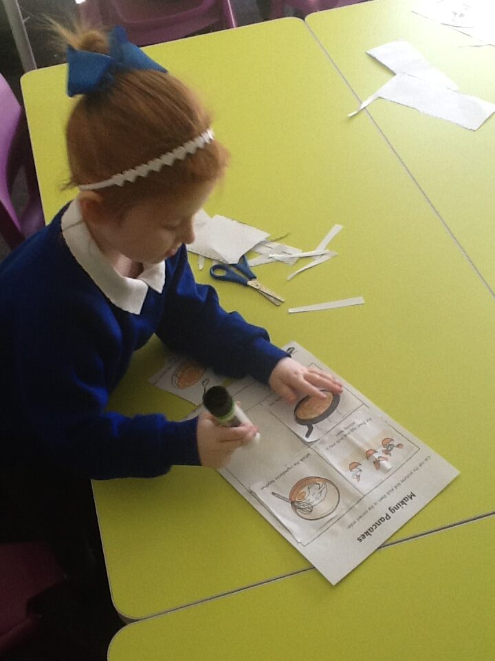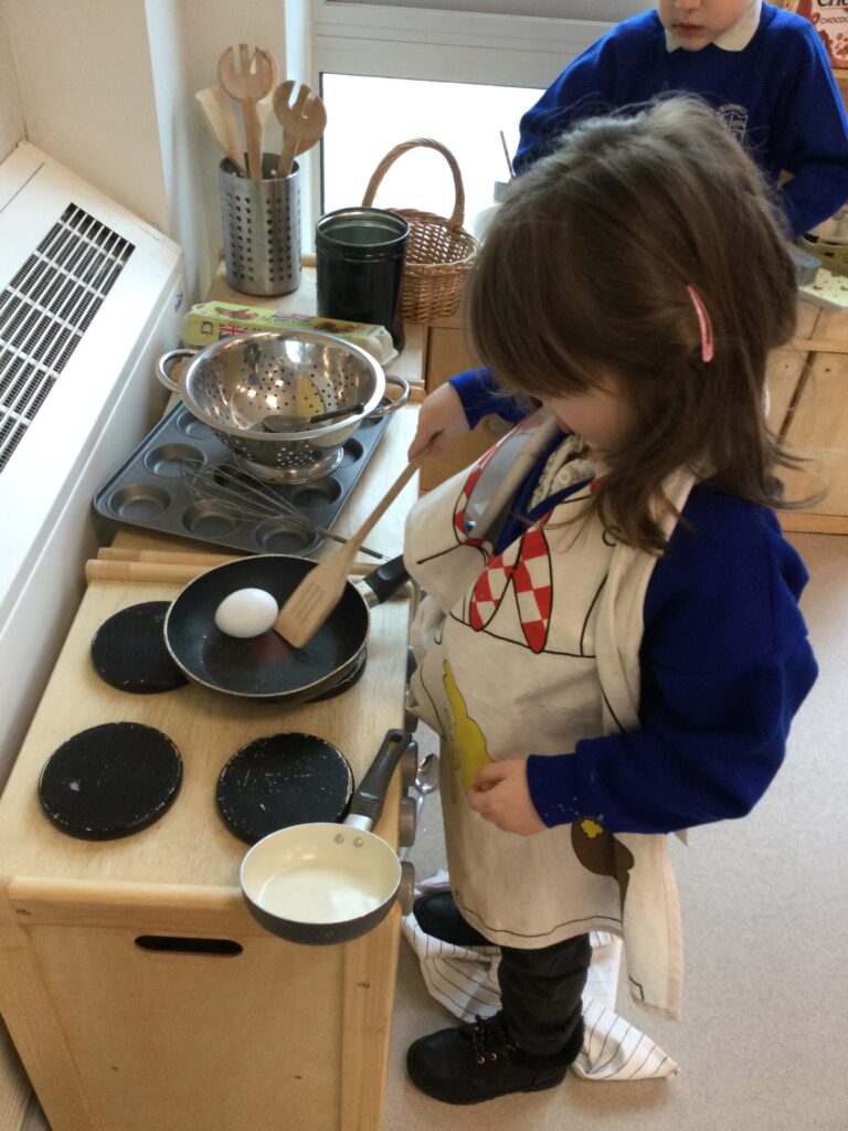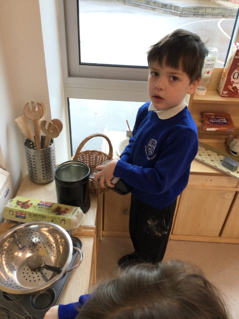 In Reception we have been learning about the traditions of pancake day and engaging in ‘pancake day’ themed activities with a focus around the book ‘Mr Wolves pancakes’. We all taste tested our very own pancakes which we watched and assisted Mrs Pattison in cooking. We all helped Mrs Pattison with the recipe and to choose the correct ingredients we needed to make the pancakes , from there we were able to do a sequencing task where we had to put the pictures in the correct order. In the tuff tray we explored the different utensils with the flour and we used them to make pancakes like Mr wolf from the story. We also made pancakes in the mud kitchen outside !. We used the scales to weigh and measure out ingredients in the playdough area and then used playdough mats and other tools to make toppings for our pancakes which we served to our friends. In the reading area we enjoyed re-telling the story to our friends and also reading the story with our teachers. We wrote shopping lists in the writing area like the one from the story. We also coloured in and drew different characters from the story. We made our very own ‘runaway pancake man’ in the creative area using a range of different materials. In the maths area we took part in a counting activity where we placed the correct amounts of toppings on top of the pancake and we also completed a shape matching activity where we had to recognise , name and correctly match the different shapes. We have had so much fun learning all about Pancake day and the story of Shrove Tuesday.