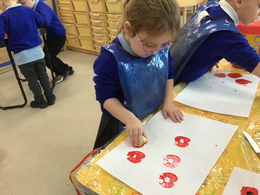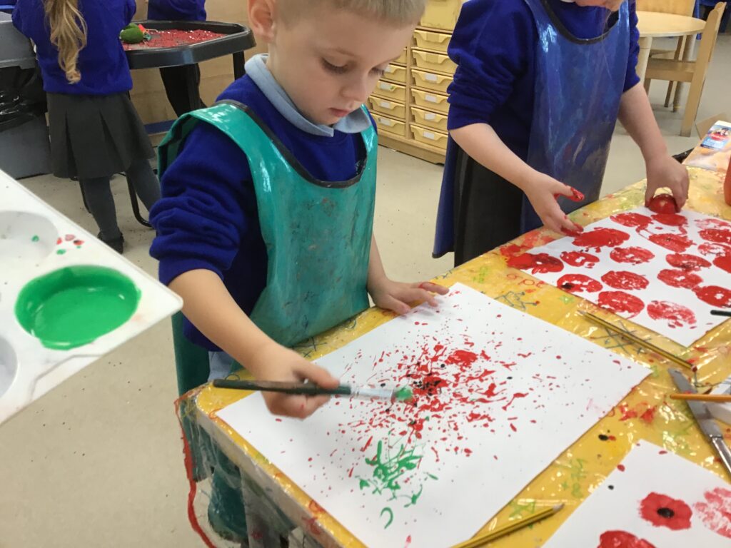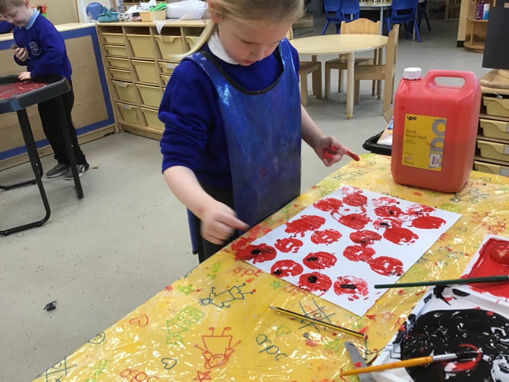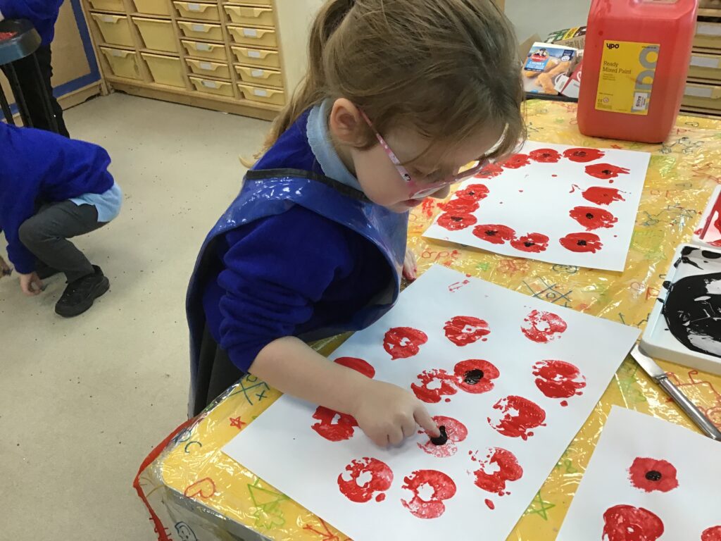 This week in Reception, we have been learning all about Remembrance Day. We have been learning how to march like the soldiers in the War in PE. We observed the two minutes silence in school and discussed the importance of the silence and why we do it. We made our own stained glass poppies, which we displayed on our window in our classroom. We also printed poppies using apples, and made poppies in the playdough. We looked at the artist Jackson Pollock and created poppies inspired by his artwork. We had a tuff tray, which had soldier figures in, we used the soldiers to re-inact what it was like to be a soldier in the war, we discussed what the trenches were like and the living conditions the soldiers had to endure. We designed, cut out medals, learned all about what the medals represented and how brave the soldiers were. We discussed how we thought the soldiers and their families would have felt during the war.