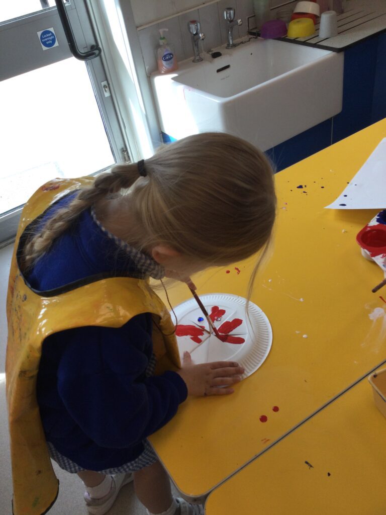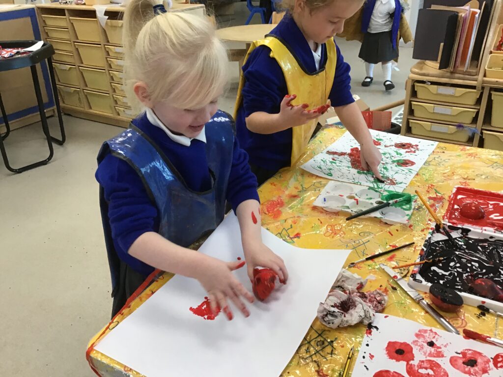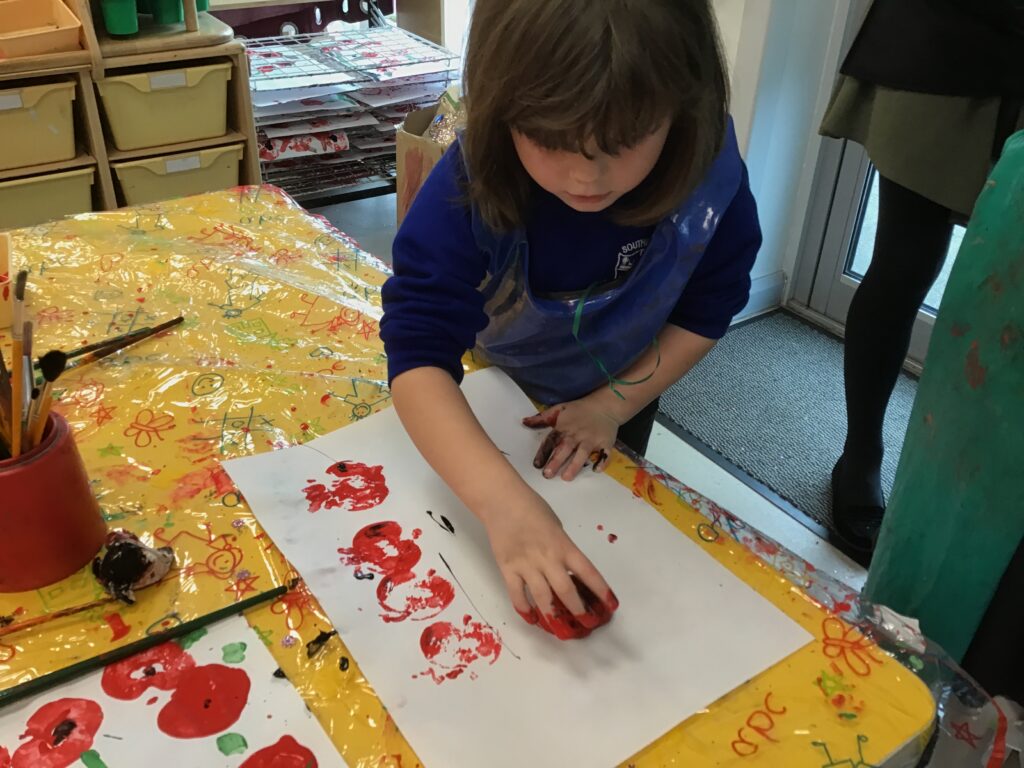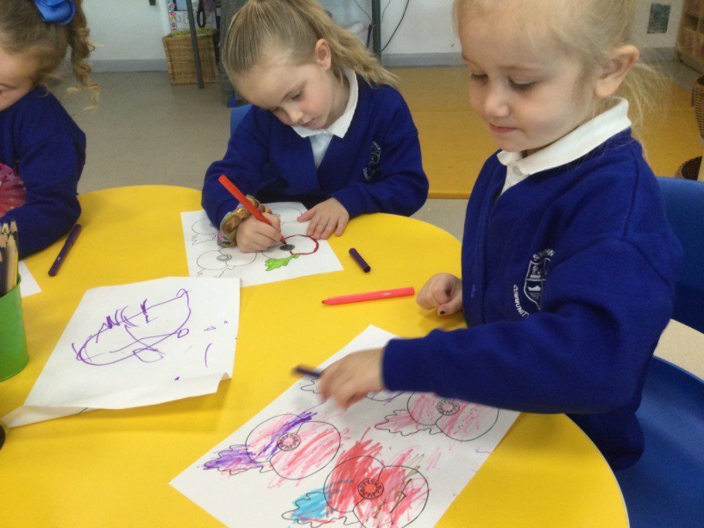 This week in Reception, we have been learning all about Remembrance Day. We have been learning how to march like the soldiers in the War in PE. We observed the two minutes silence in school and discussed the importance of the silence and why we do it. We made our own stained glass poppies, which we displayed on our window in our classroom. We also printed poppies using apples, and made poppies in the playdough. We looked at the artist Jackson Pollock and created poppies inspired by his artwork. We had a tuff tray, which had soldier figures in, we used the soldiers to re-inact what it was like to be a soldier in the war, we discussed what the trenches were like and the living conditions the soldiers had to endure. We designed, cut out medals, learned all about what the medals represented and how brave the soldiers were. We discussed how we thought the soldiers and their families would have felt during the war.