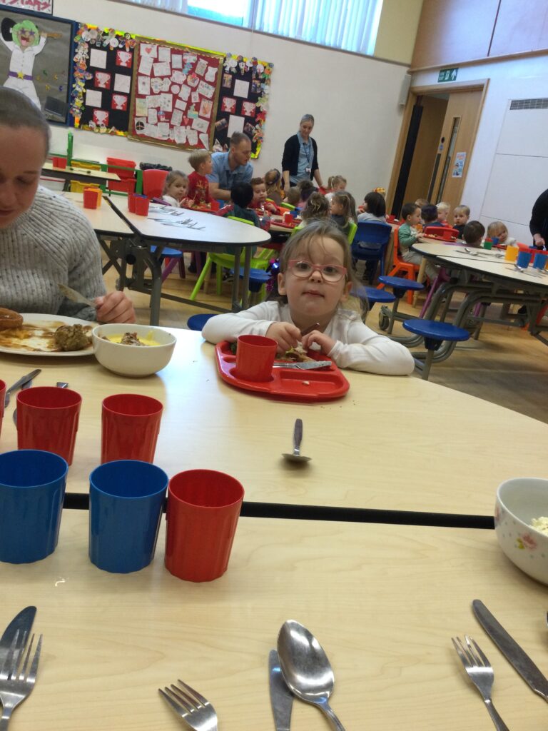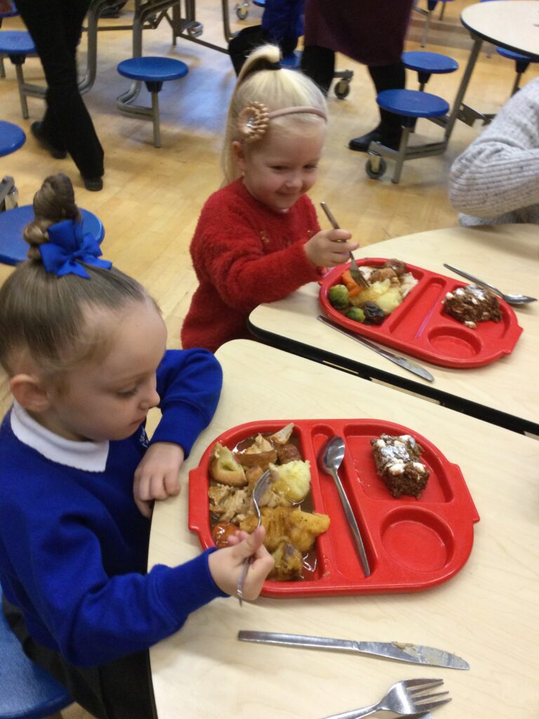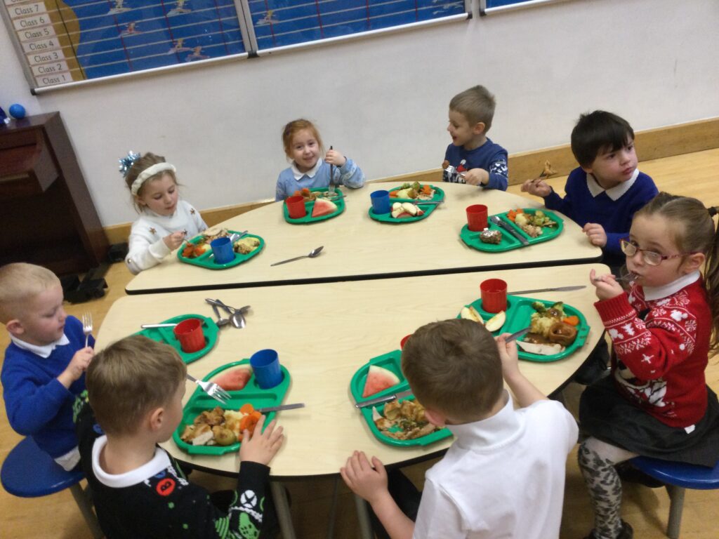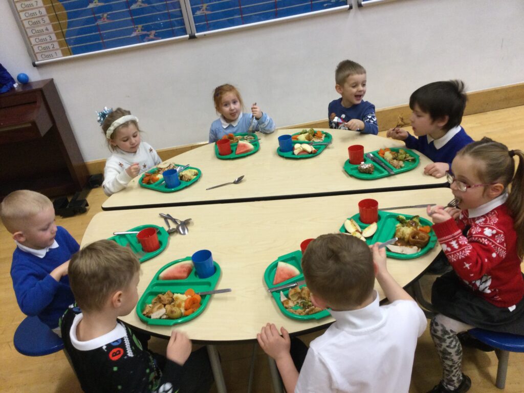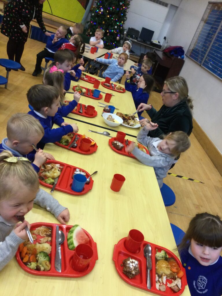 On the 8th of December the whole school enjoyed their Christmas dinner. In Reception we loved having our Christmas dinner with all our class friends and our teachers. We all sat down to eat together and enjoyed the delicious food while we spoke about how excited we all are for Christmas and what we hope Santa Claus will bring us.