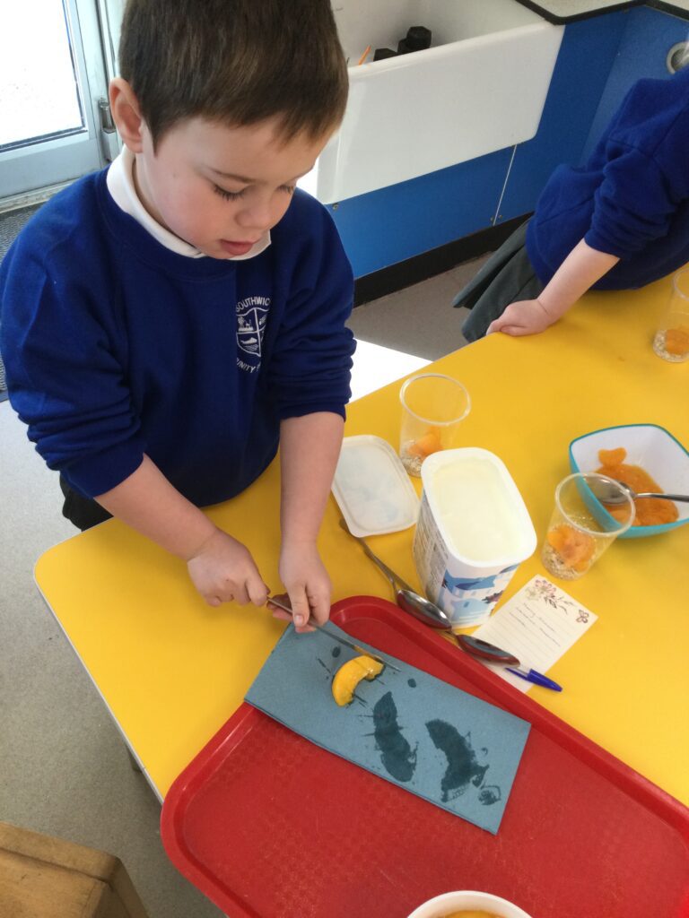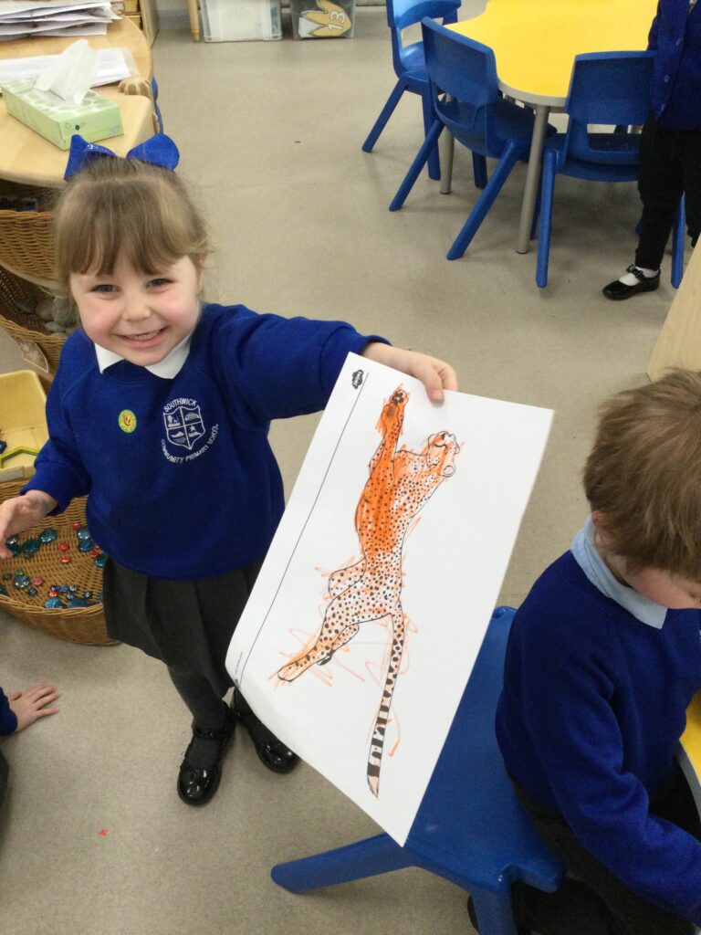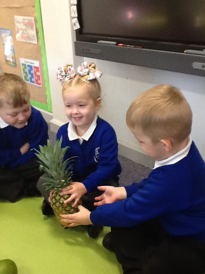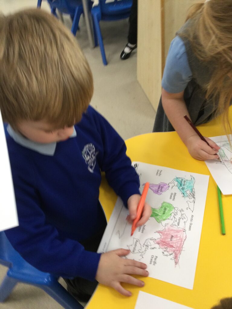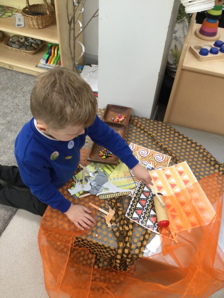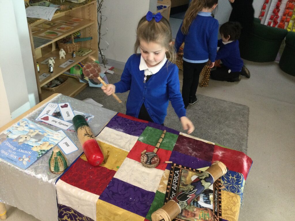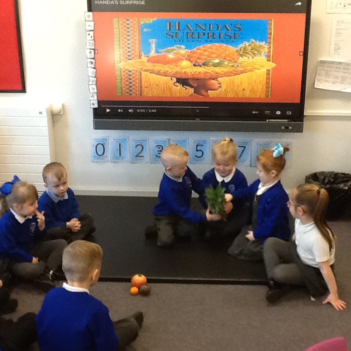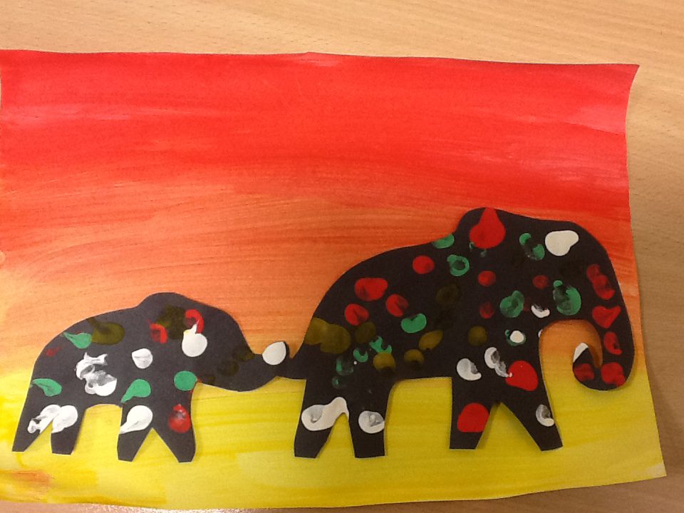 For continents week we have been learning all about Africa. We have been using our knowledge of England and winter to compare the similarities and differences between England and Africa. We have loved learning about the different African animals, housing, music, weather and food. We really enjoyed investigating some African fruits, exploring the different textures, shapes and colours, we were keen to find out about the different tastes of these fruits. Our favourite was the pineapple, and least favourite was the passion fruit! We have also made some amazing African art, painting sunsets and learning about mixing primary colours and adding finger printing to cut out African animals to make beautiful safari pictures.
