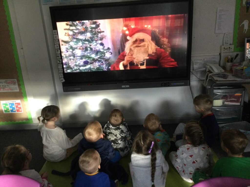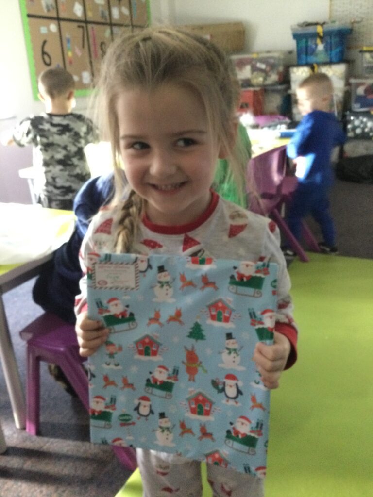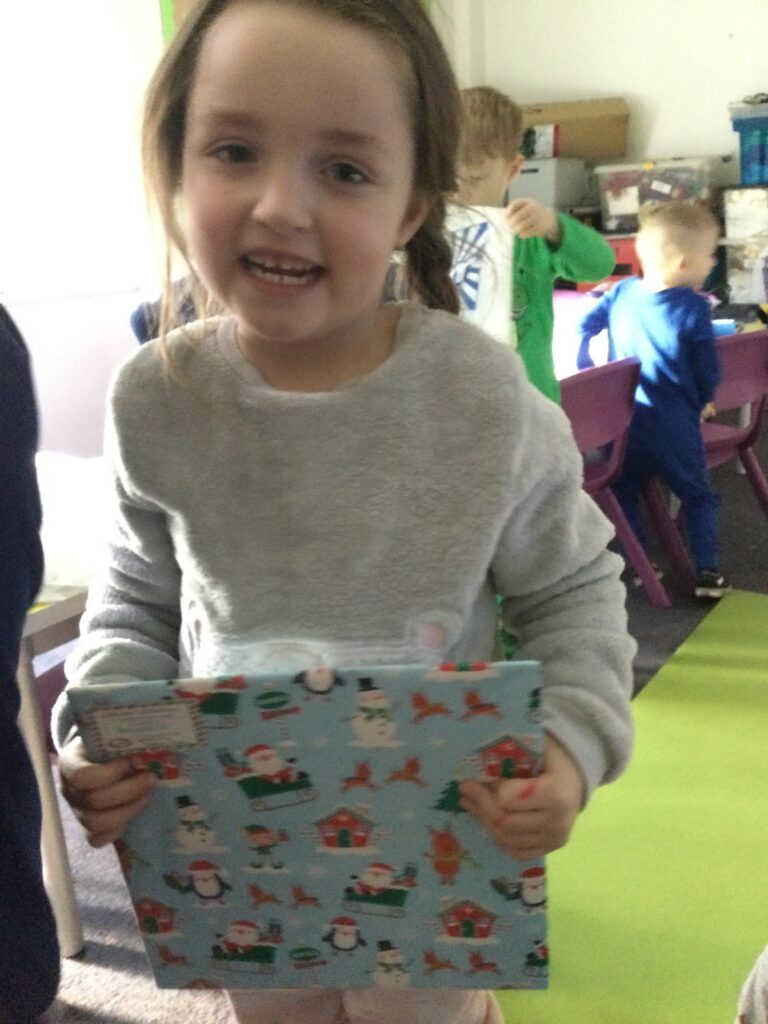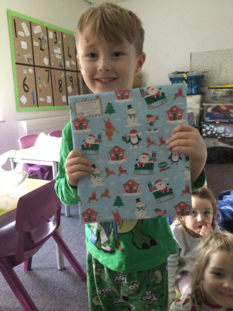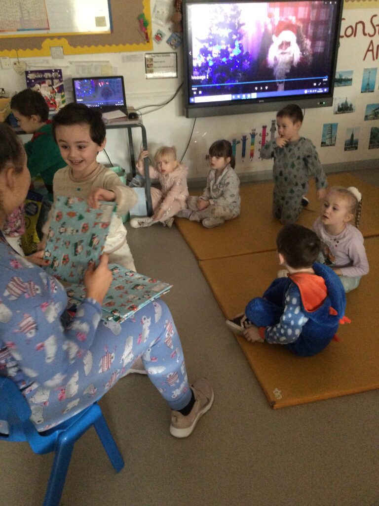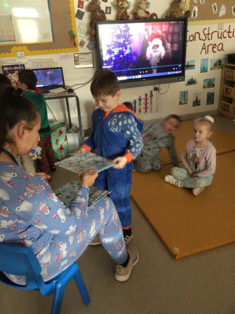 Reception had so much fun coming to school dressed in their pyjamas. They felt so cosy whilst watching films and having lots of yummy treats. We had hot chocolate and popcorn whilst we enjoyed the film and snuggled up under cosy blankets. They designed their very own pair of pyjamas using a range of colours and patterns, they also took part in interactive games such as ‘ The Grinch run’. Throughout the day we played lots of fun games such as ‘pyjama snap’, we read Christmas stories and enjoyed watching our special message sent from Santa Claus in the North pole. At the end of the day we received a present from Santa and we were all so excited to open it ! This was such a lovely day.