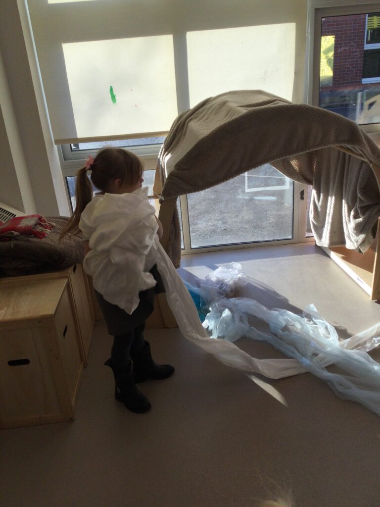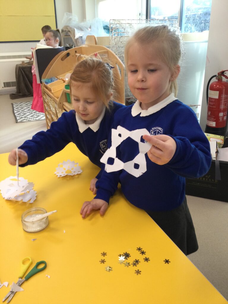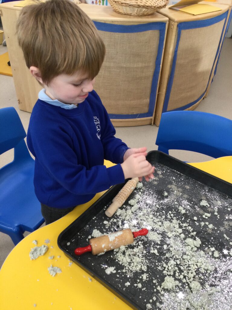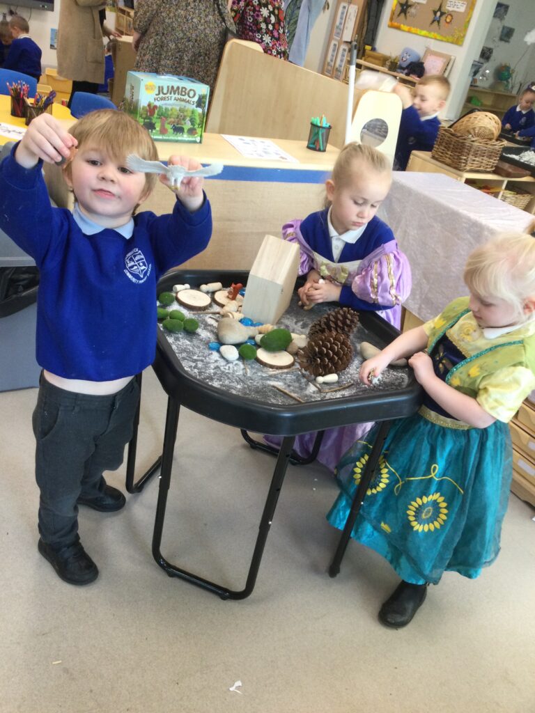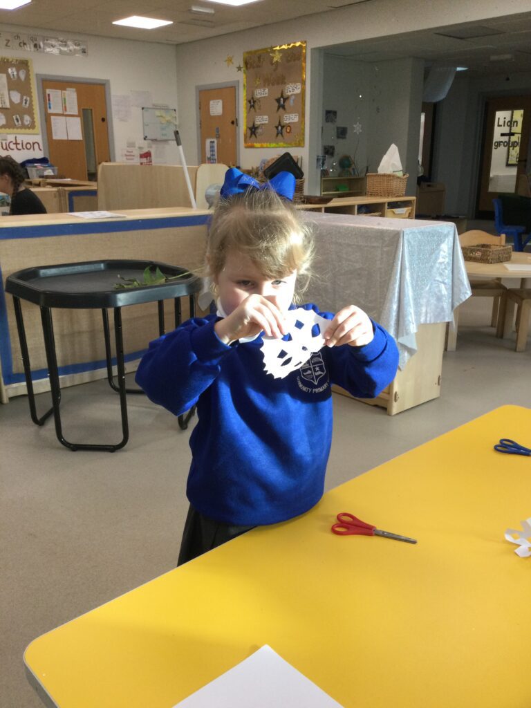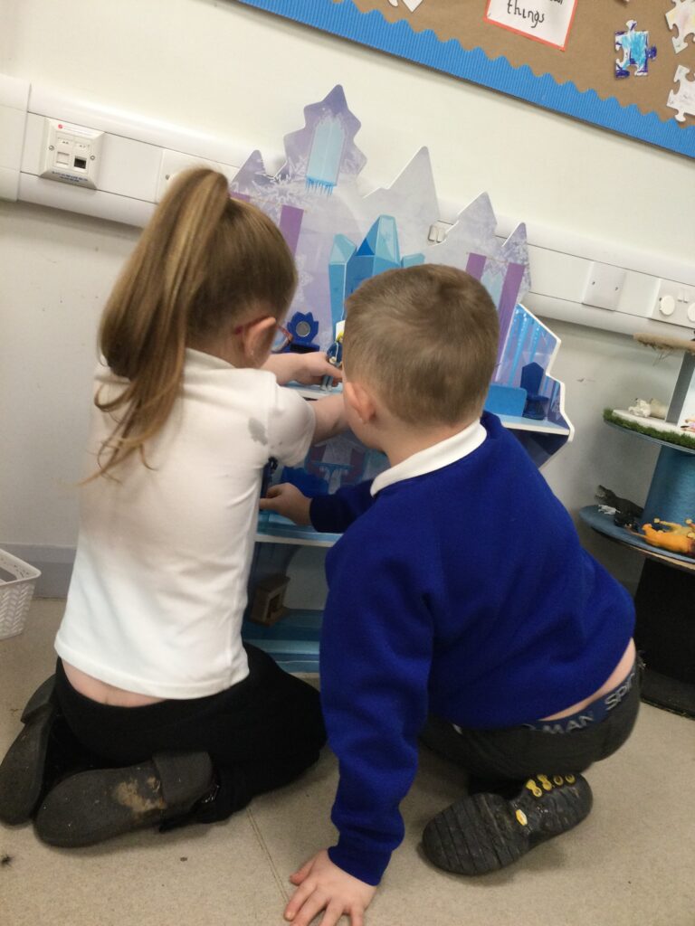 This week we have continued our learning about Winter with a focus on the traditional tale, “The Snow Queen”. We have been reading the story in group time, focusing on the characters and the story line. From this we made our own castle in our role play area, using different materials. The children decided how they wanted it to look and did this independently. We made some ice cubes from junk modelling to add to our castle, we made some snowflakes and icicles to add on. We enjoyed dressing up as the snow queen and acting out the story in our play. In the provision we looked at some ice, exploring how to make it melt and discussing how it feels using lots of vocabulary and making links to winter