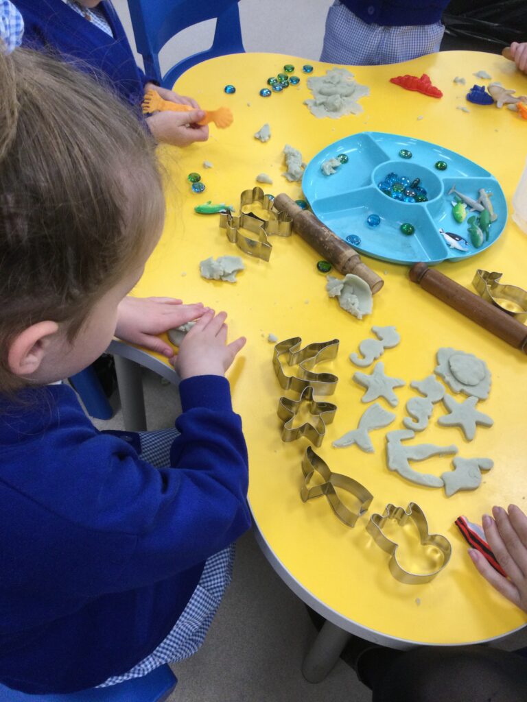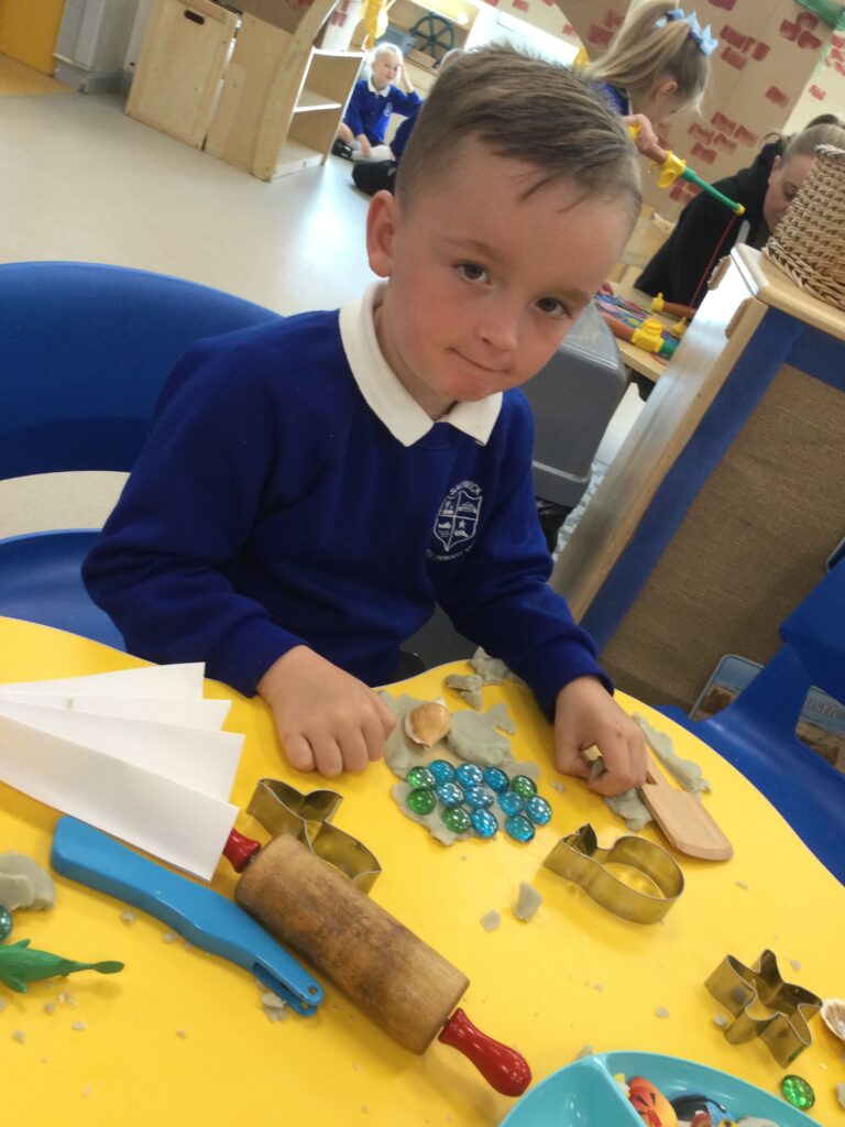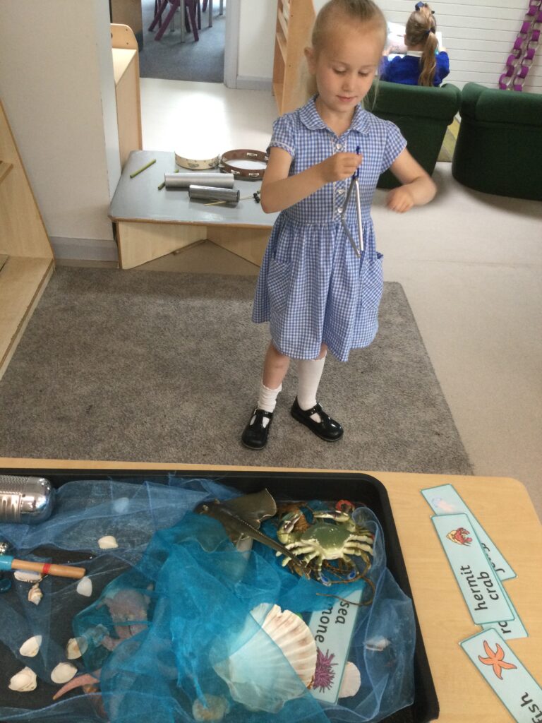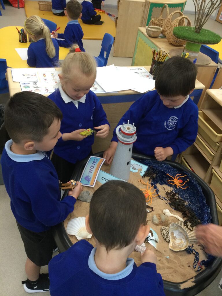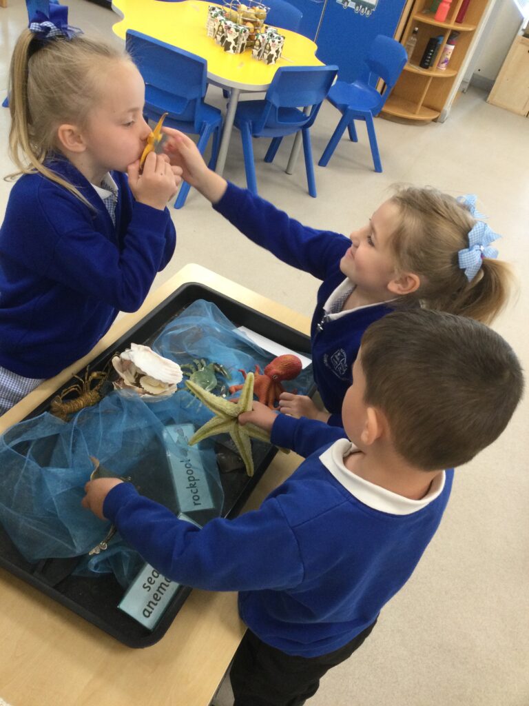 In Reception we have been learning all about the seaside and sea life. We have been exploring our seaside themed tuff tray which included , sand, sea shells, seaweed, stones and sea animals. We have been playing with the small world sea animal figures and using them in our imaginative play. We have been looking at images and videos of various beaches and their features. We have also been comparing past and present life at the beach such as the clothes that would have been worn on the beach in the past. We have been painting pictures of the seaside and under the sea, looking in particular at the plants and animals that live there.