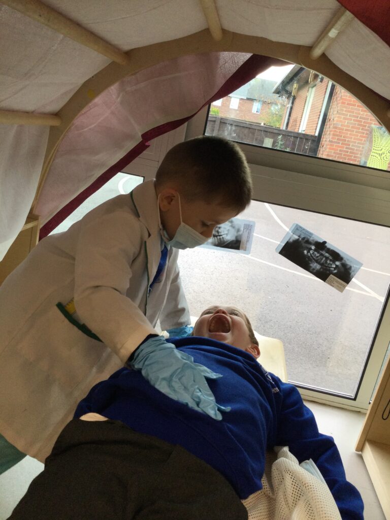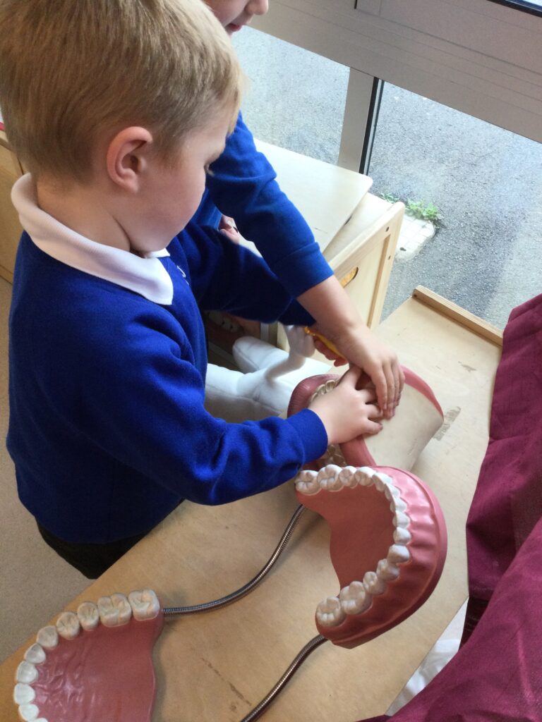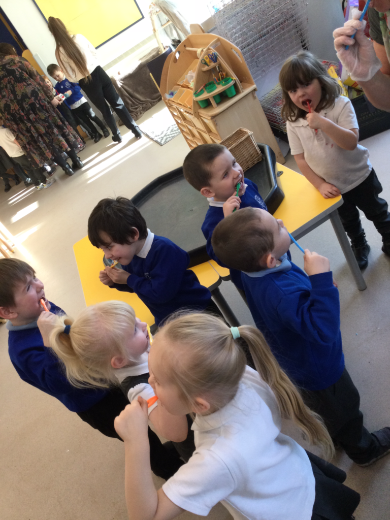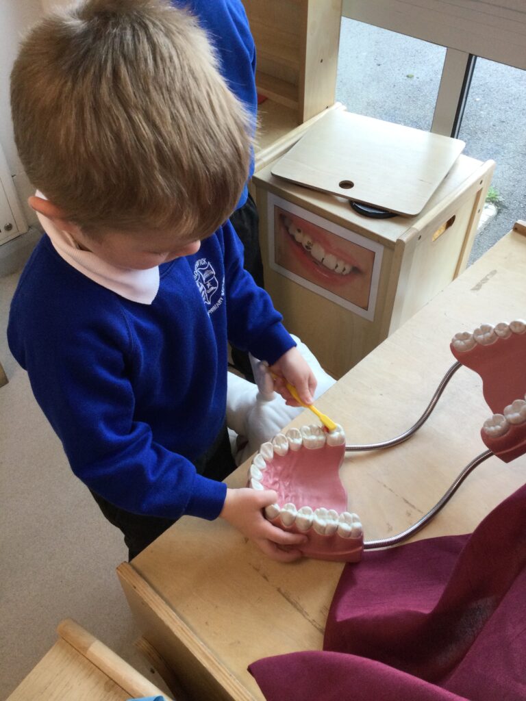 In Reception we have been learning all about how to keep our teeth and mouth clean and healthy. We have been practicing cleaning our teeth every day in school and we now know to clean our teeth twice a day and for 2 minutes each time. We also got a special visit from the dentist who told us how we can keep our teeth healthy. We also created our own dental surgery in the role play area and we dressed up as Dentists, Dental nurses and receptionists. We have also been reading books all about dental hygiene !