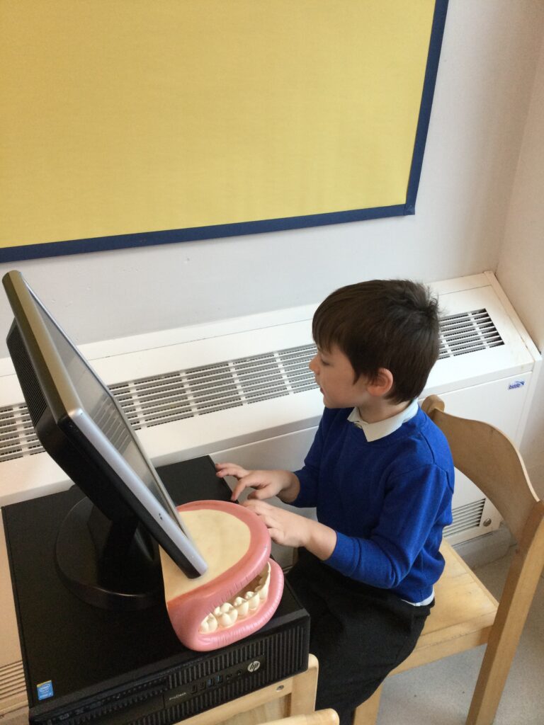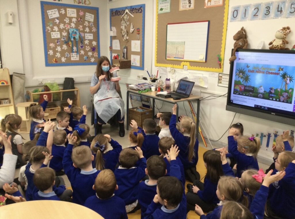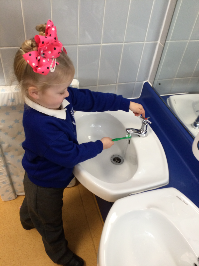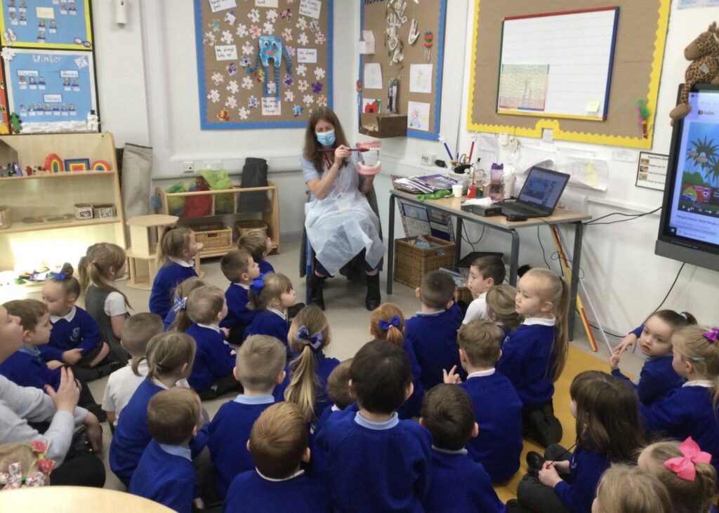 In Reception we have been learning all about how to keep our teeth and mouth clean and healthy. We have been practicing cleaning our teeth every day in school and we now know to clean our teeth twice a day and for 2 minutes each time. We also got a special visit from the dentist who told us how we can keep our teeth healthy. We also created our own dental surgery in the role play area and we dressed up as Dentists, Dental nurses and receptionists. We have also been reading books all about dental hygiene !