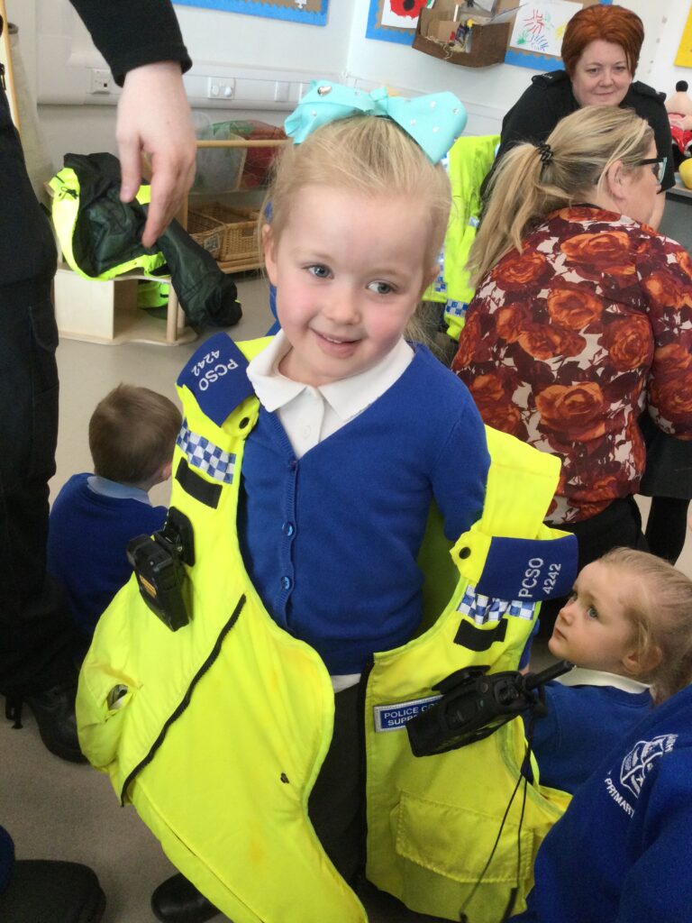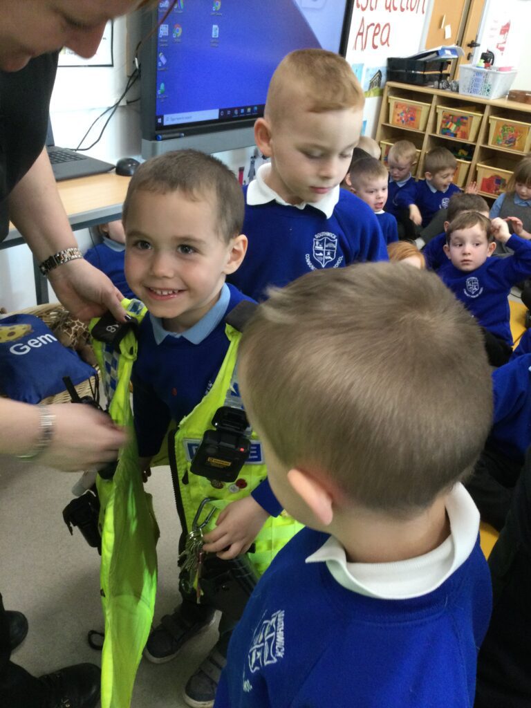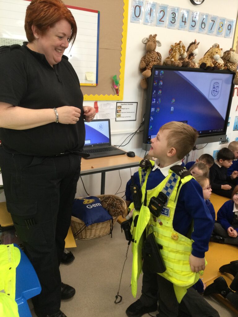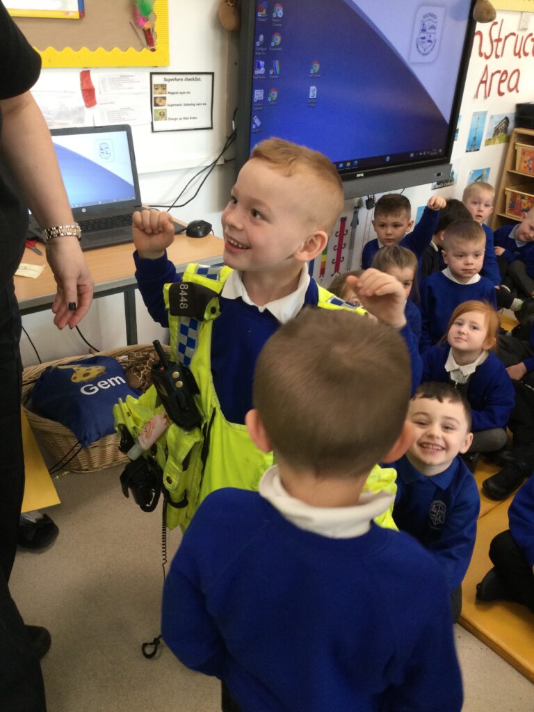 In Reception we had two very important visitors come and meet us in school. We have been learning all about everyday superheroes in class, discussing what it means to be a real super-hero and giving examples of who they are. We were so lucky because two super-hero police officers came into Reception and taught us all about the work that they do and how they keep us safe. The Police officers showed us their vest and all the equipment that it stored. We were so excited because they allowed us to try the police vest on, it was very heavy !. We then discussed the different vehicles the police use to help them and the animals they use also. We learned so much from the Police officers and we had so much fun with them.