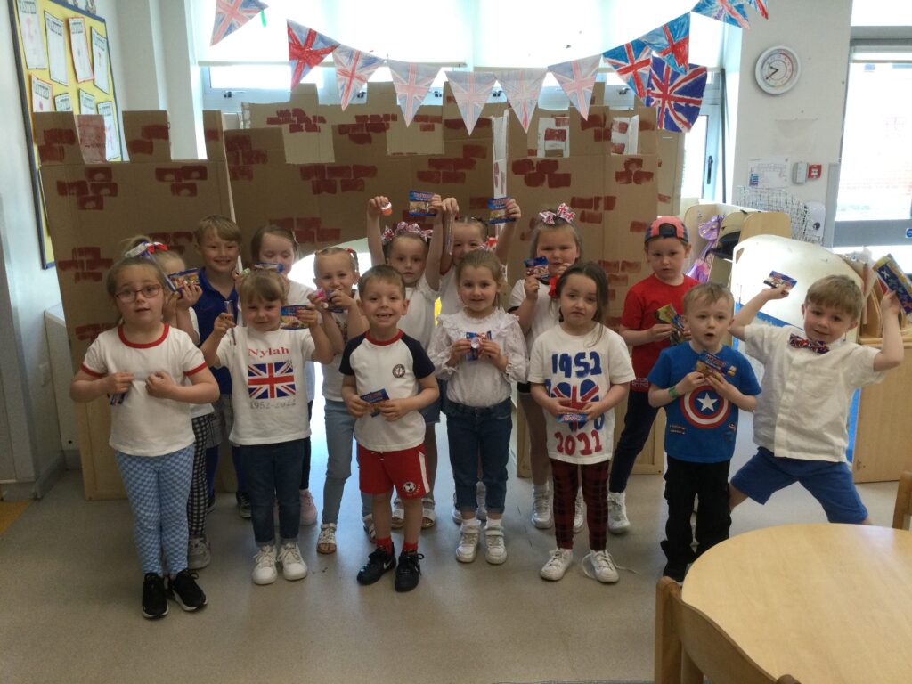 In Reception we have been learning all about the Platinum Jubilee and preparing for the upcoming celebration. We have made and turned our role play area into a royal castle. We have been dressing up as royalty and using this to inspire our role play narrative. We have also been learning all about the Queen and her role as Queen. We have researched and learned all about the history of the Queen and her family, and have also been looking at money and how the Queen face is present on this. We have made flags of the united Kingdom to hold and wave at our Jubilee party. We have also designed and made our very own crowns, paper chains and bunting which we have decorated our classroom with. Outside we have decorated our fence by weaving red , blue and white ribbon to represent the colours of the United kingdom. We have also used stamps to create portraits of the Queen, using our cutting skills to create these. In the construction area we have been using the resources to build models of castles, we have also been doing this in the malleable area using the playdough to create models of crowns, Buckingham Palace and Windsor Castle.