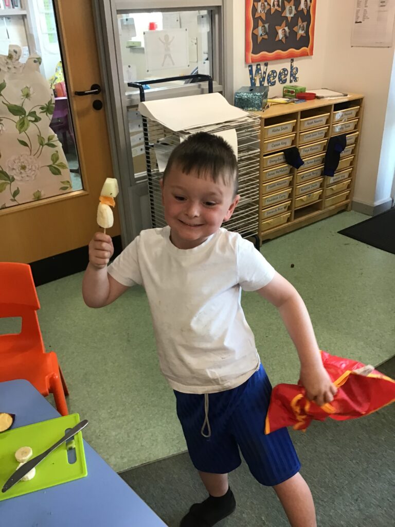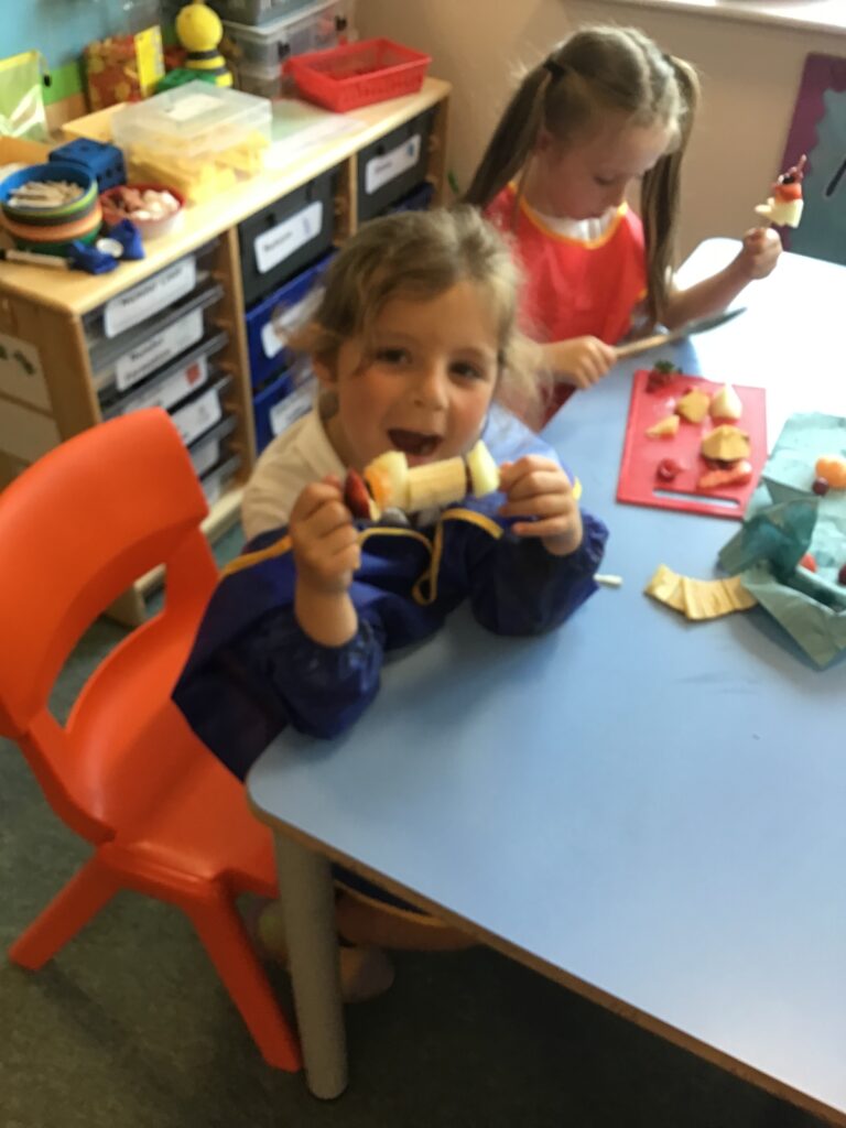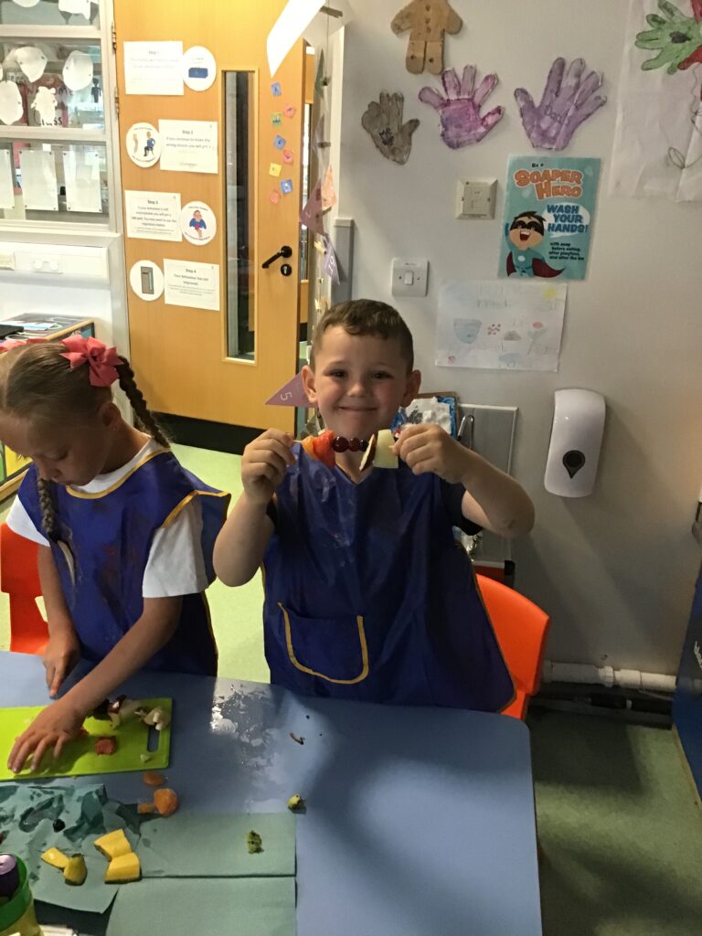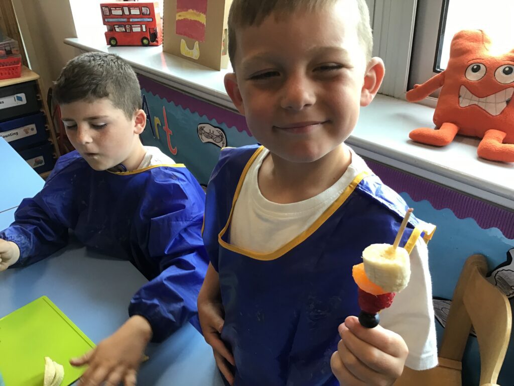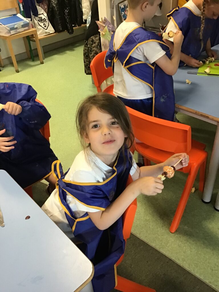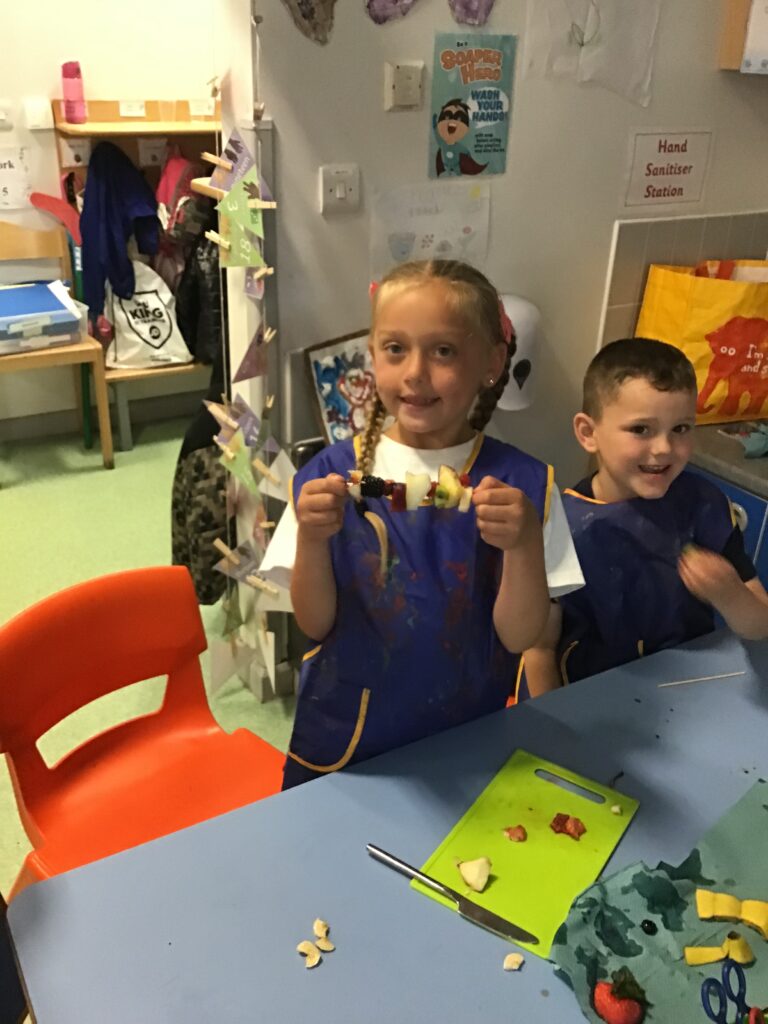 Last week we all took part in health week. We enjoyed wearing our PE kit all week and doing lots of exercise! We enjoyed Zumba and handball the most and we even took part in the Daily Mile to get as much exercise as possible. We feel a lot fitter! We also learned about eating healthy and we made our own fruit kebabs…