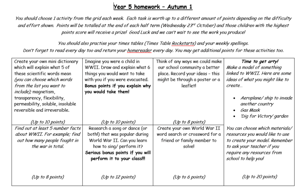 – Weekly spelling lists will be given out on a Monday for children to practise for a spelling quiz on Friday.